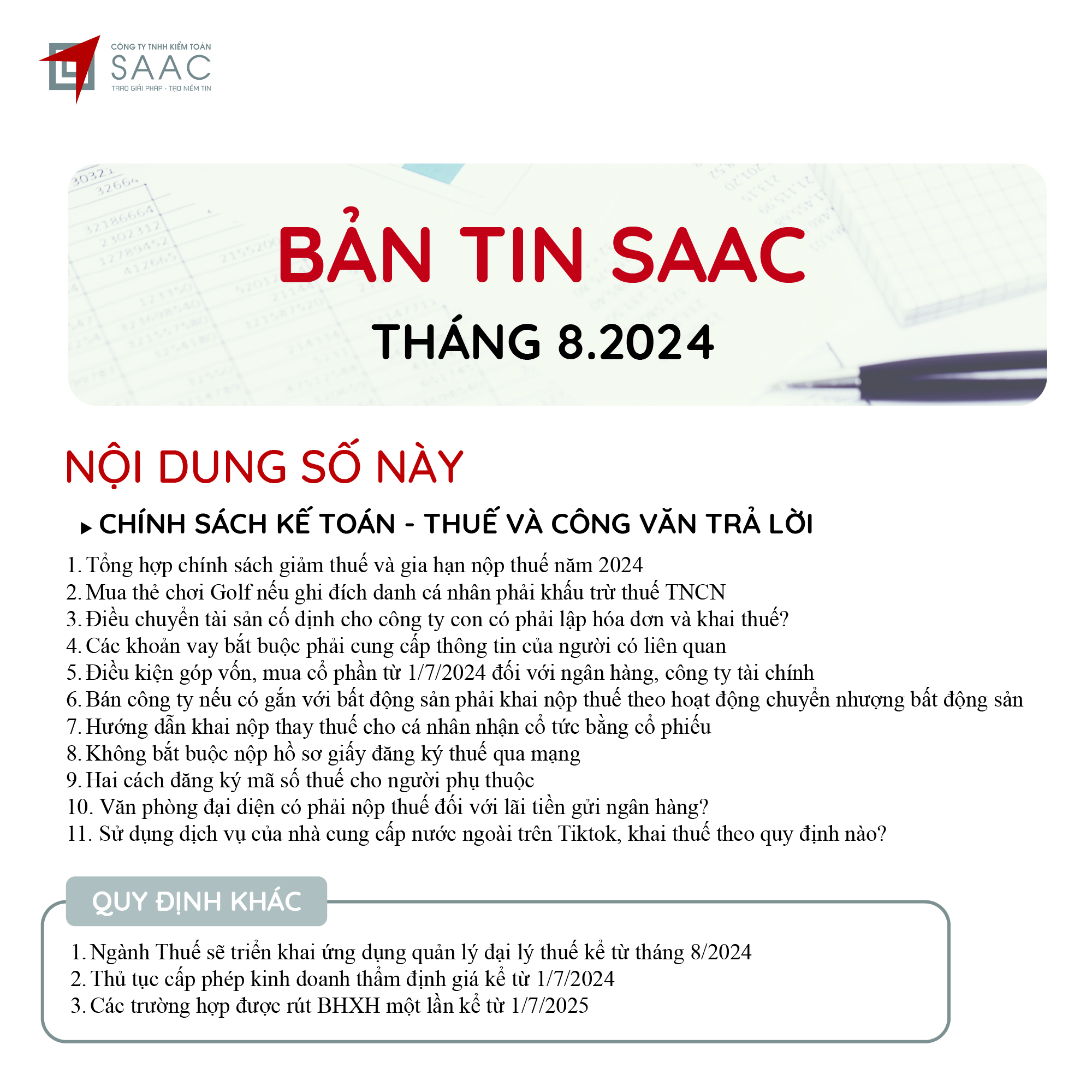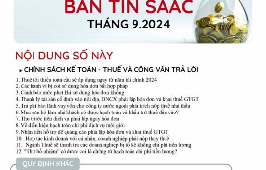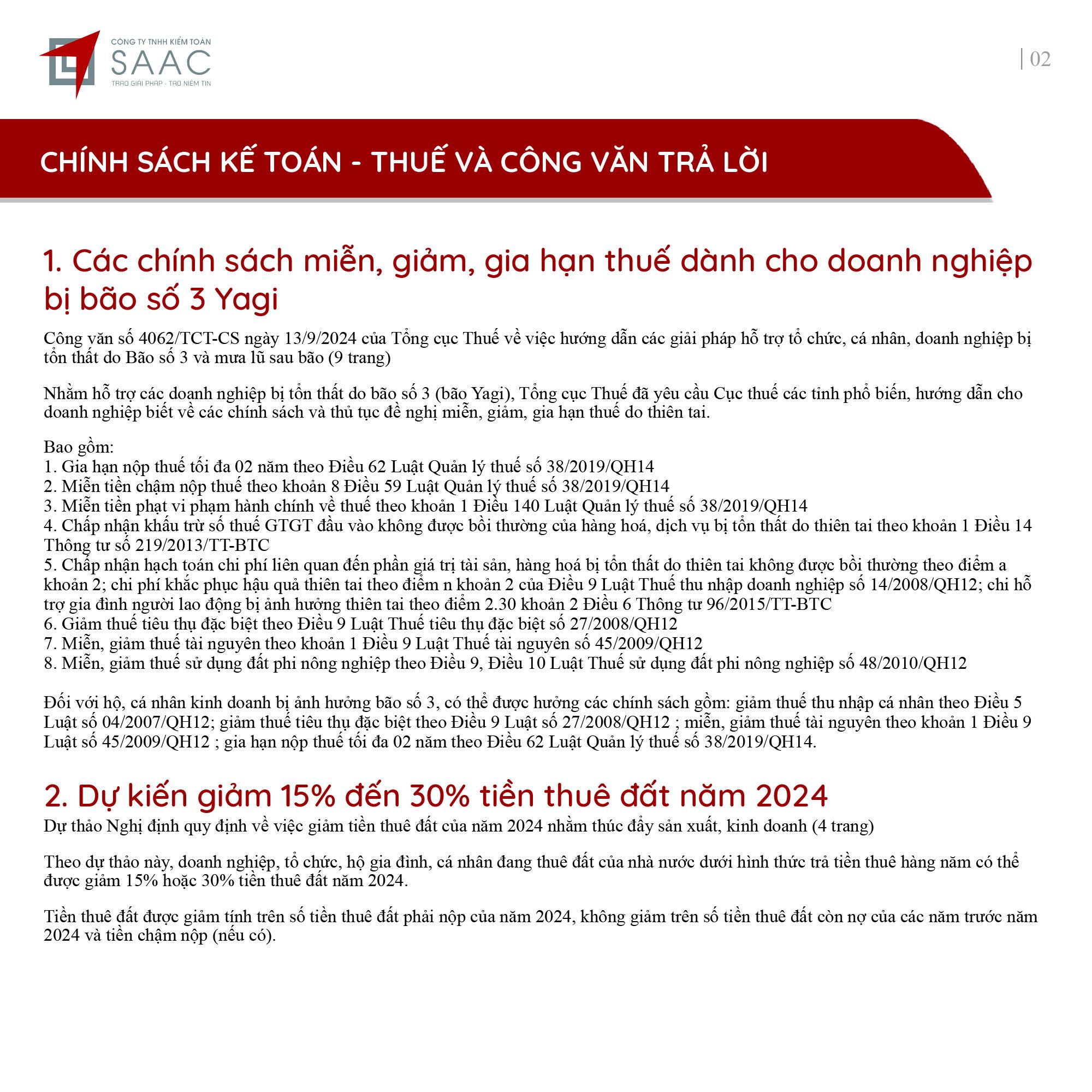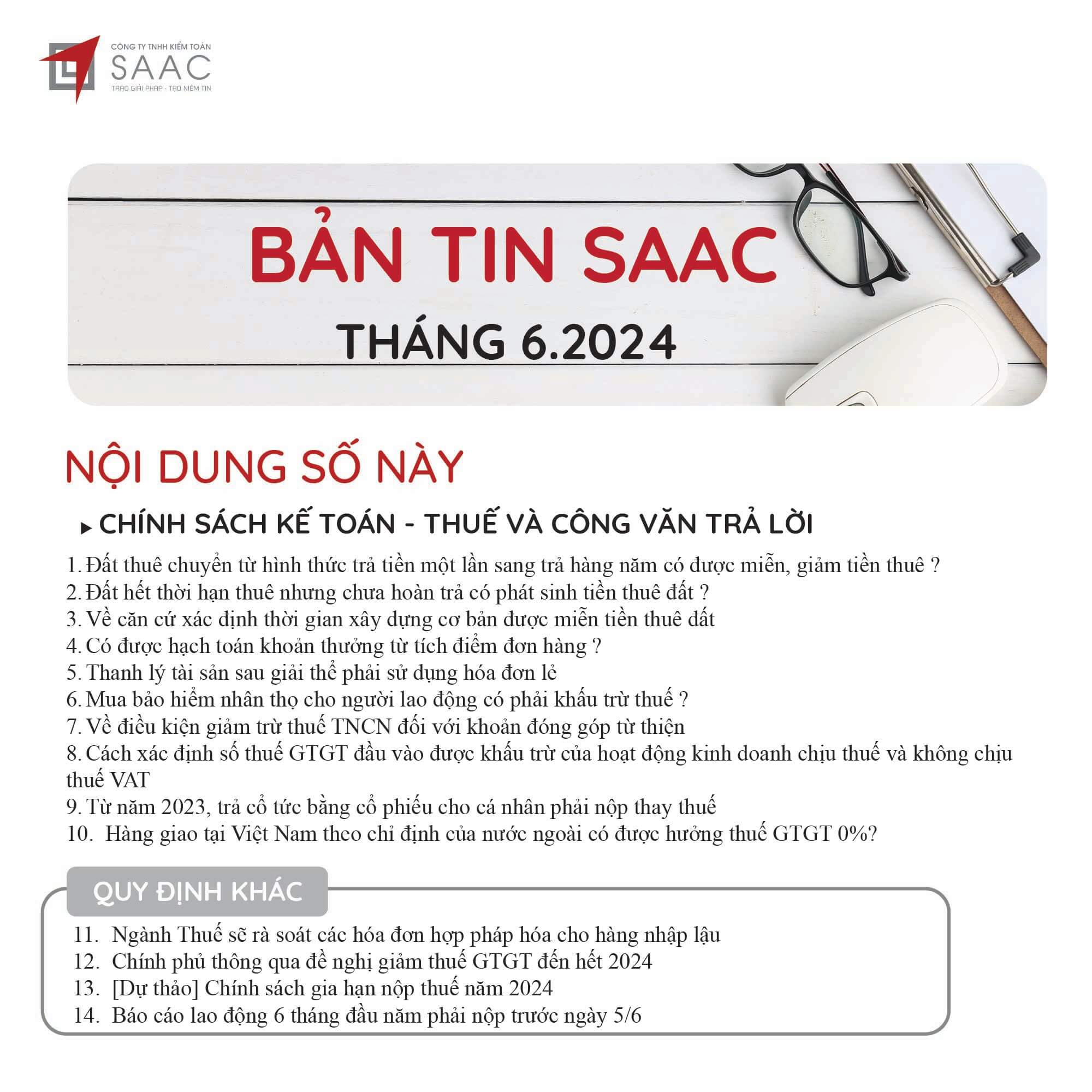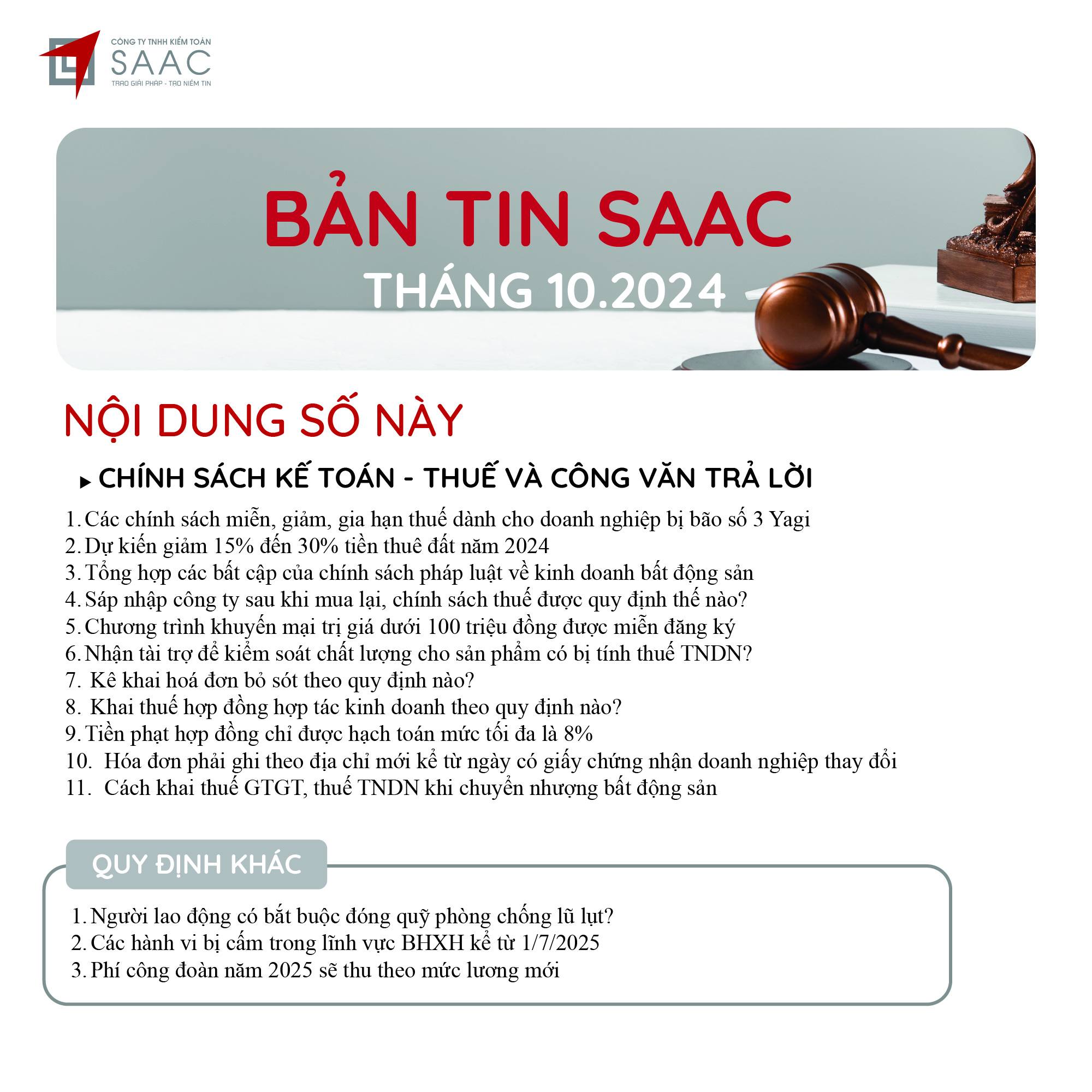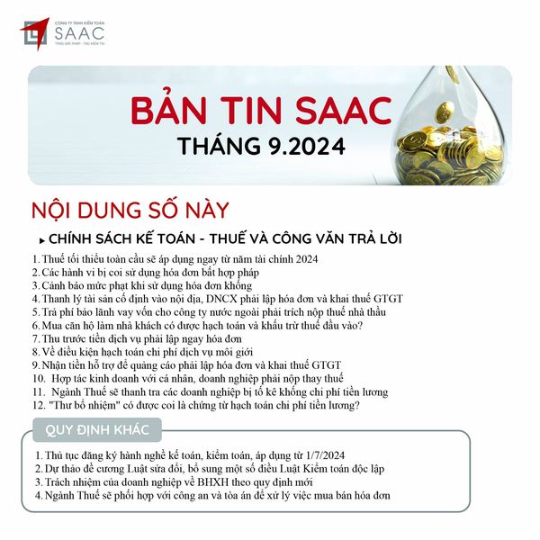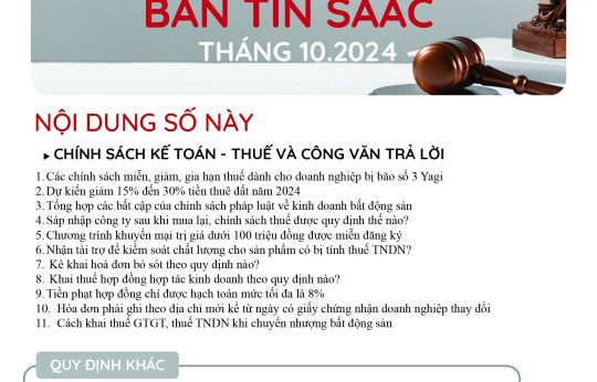 Bản tin SAAC tháng này cập nhật các lưu ý về Các chính sách miễn, giảm, gia hạn thuế dành cho doanh nghiệp bị bão số 3 Yagi, Dự kiến giảm 15% đến 30% tiền thuê đất năm 2024, Tổng hợp các bất cập của chính sách pháp luật về kinh doanh bất động sản, Sáp nhập công ty sau khi mua lại, chính sách thuế được quy định thế nào?, Chương trình khuyến mại trị giá dưới 100 triệu đồng được miễn đăng ký,..