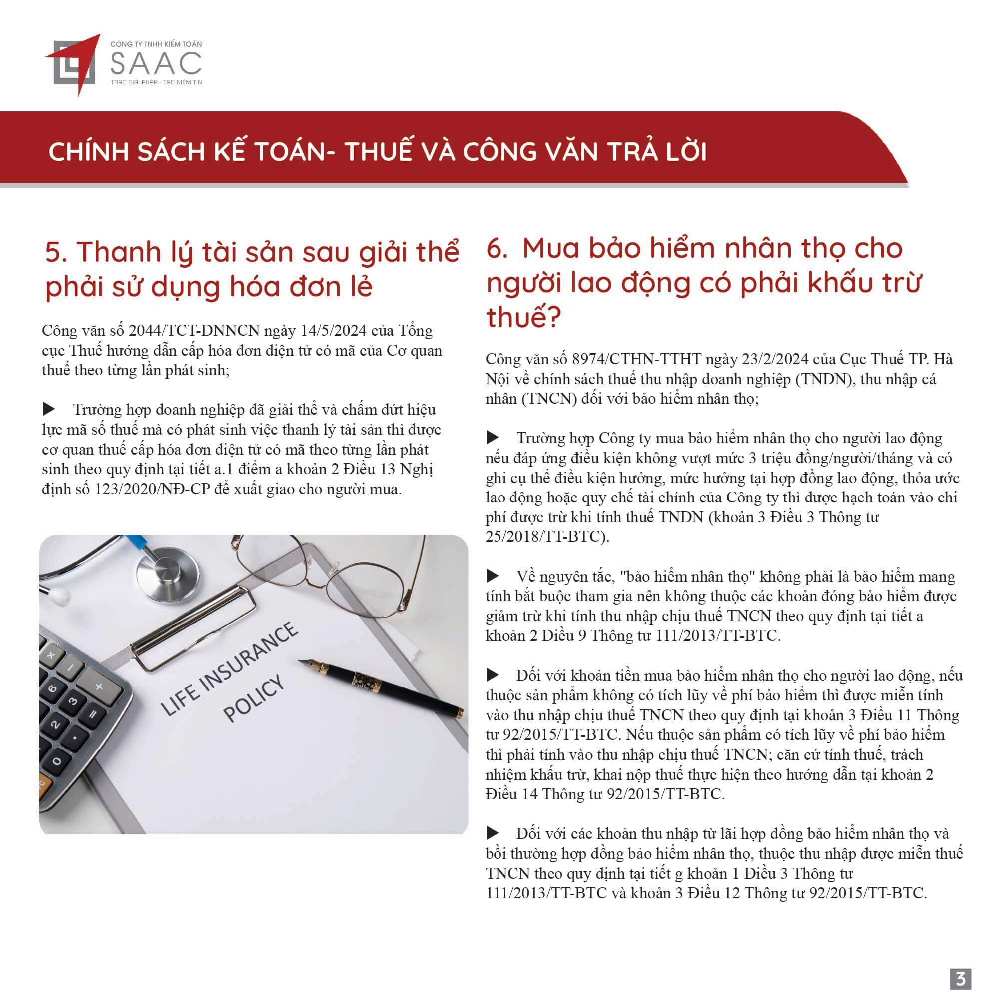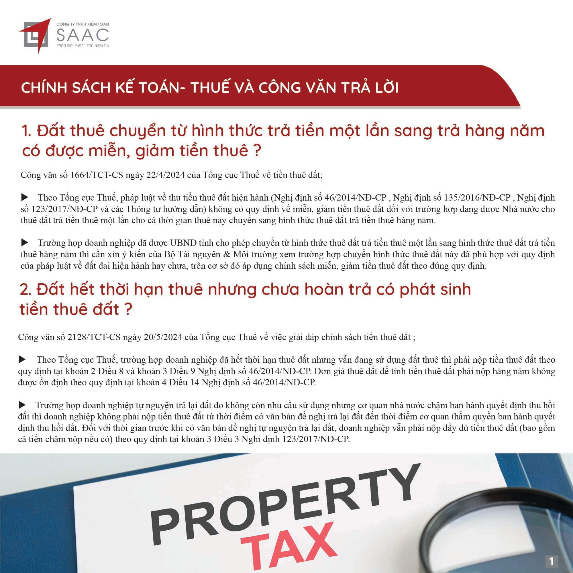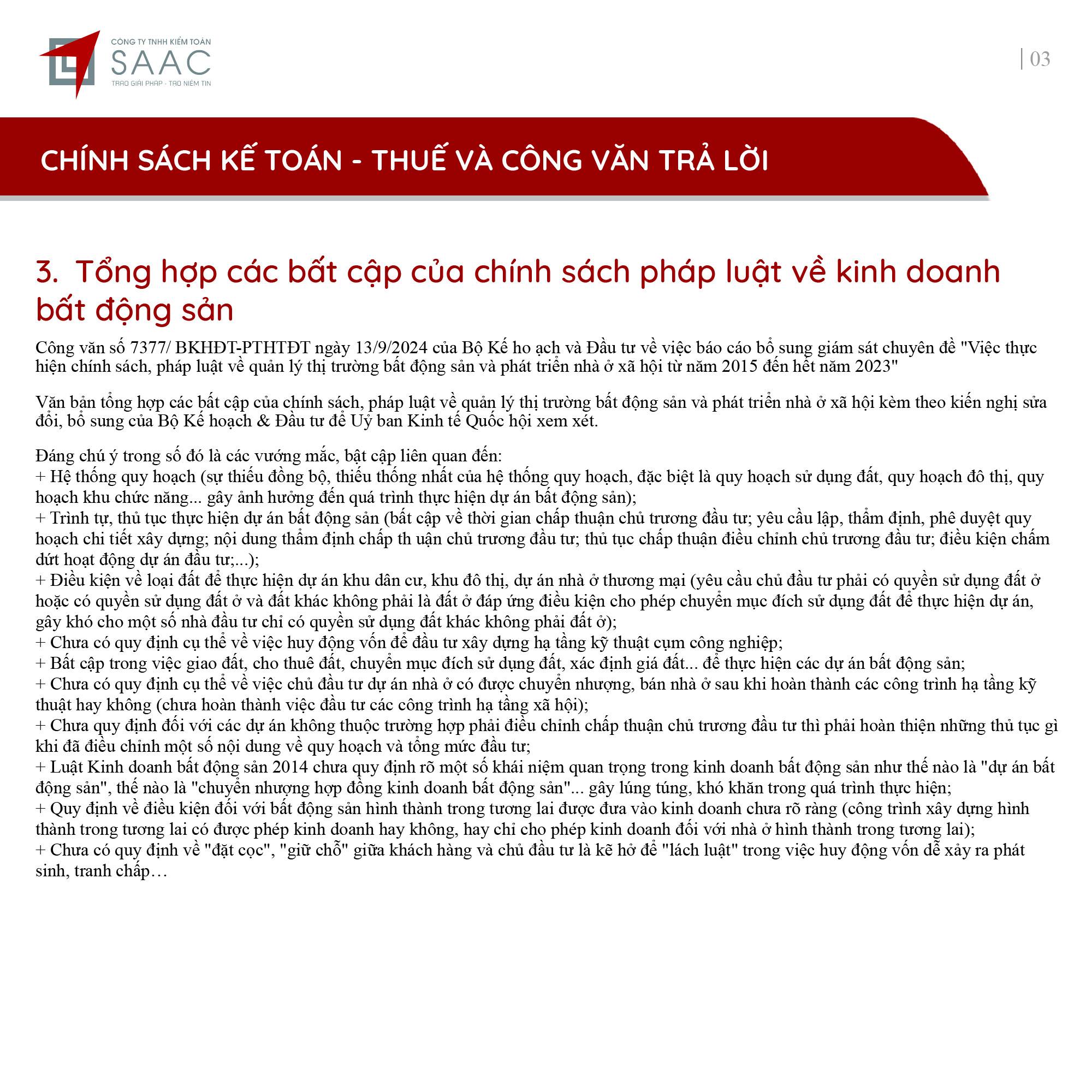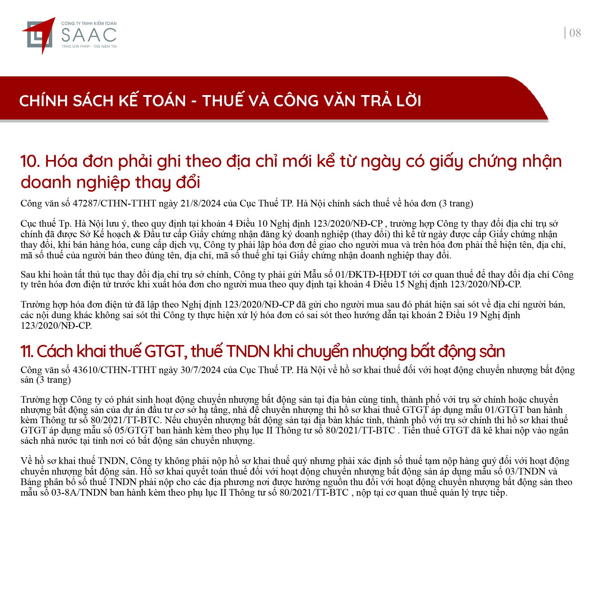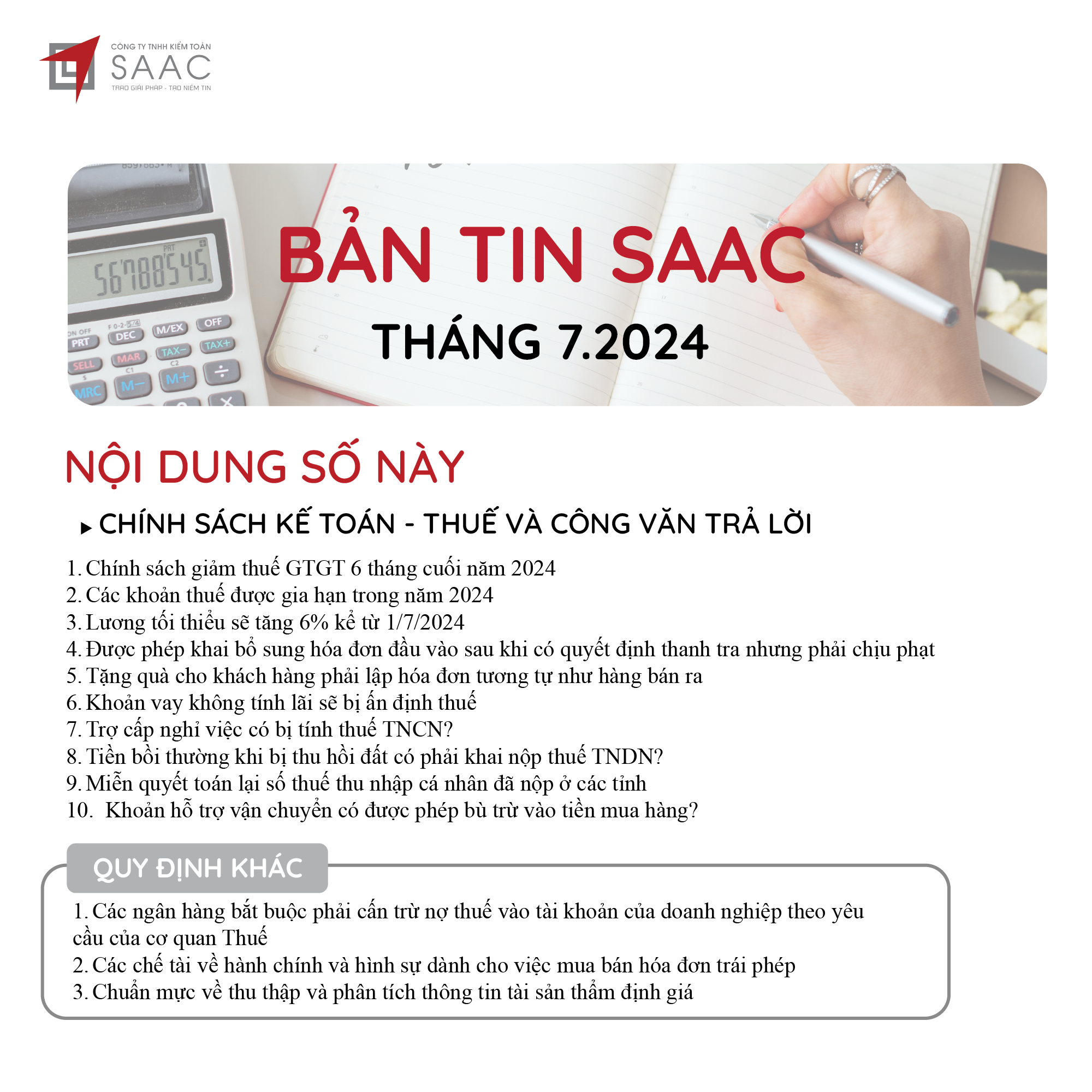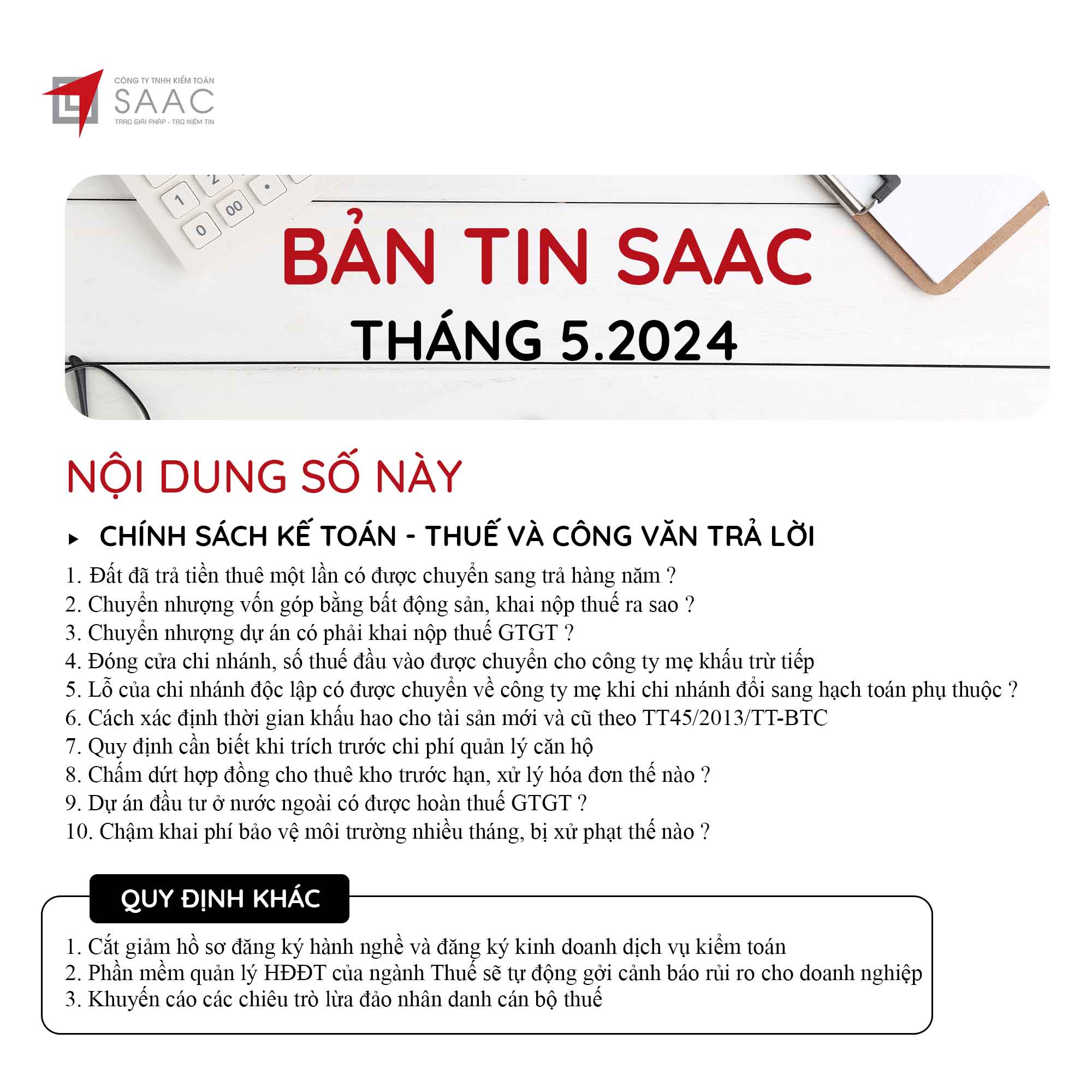 Bản tin SAAC tháng này cập nhật các lưu ý về Các chính sách miễn, giảm, gia hạn thuế dành cho doanh nghiệp bị bão số 3 Yagi, Dự kiến giảm 15% đến 30% tiền thuê đất năm 2024, Tổng hợp các bất cập của chính sách pháp luật về kinh doanh bất động sản, Sáp nhập công ty sau khi mua lại, chính sách thuế được quy định thế nào?, Chương trình khuyến mại trị giá dưới 100 triệu đồng được miễn đăng ký,..