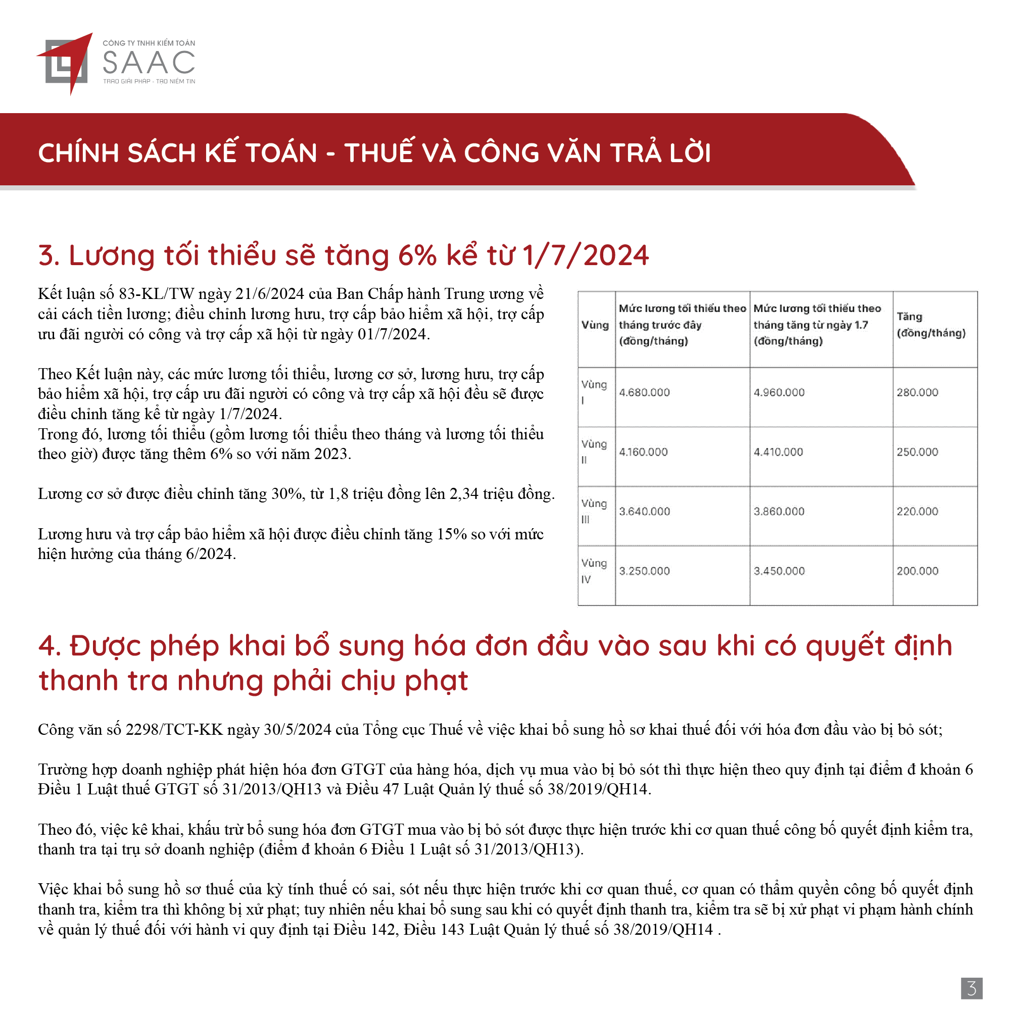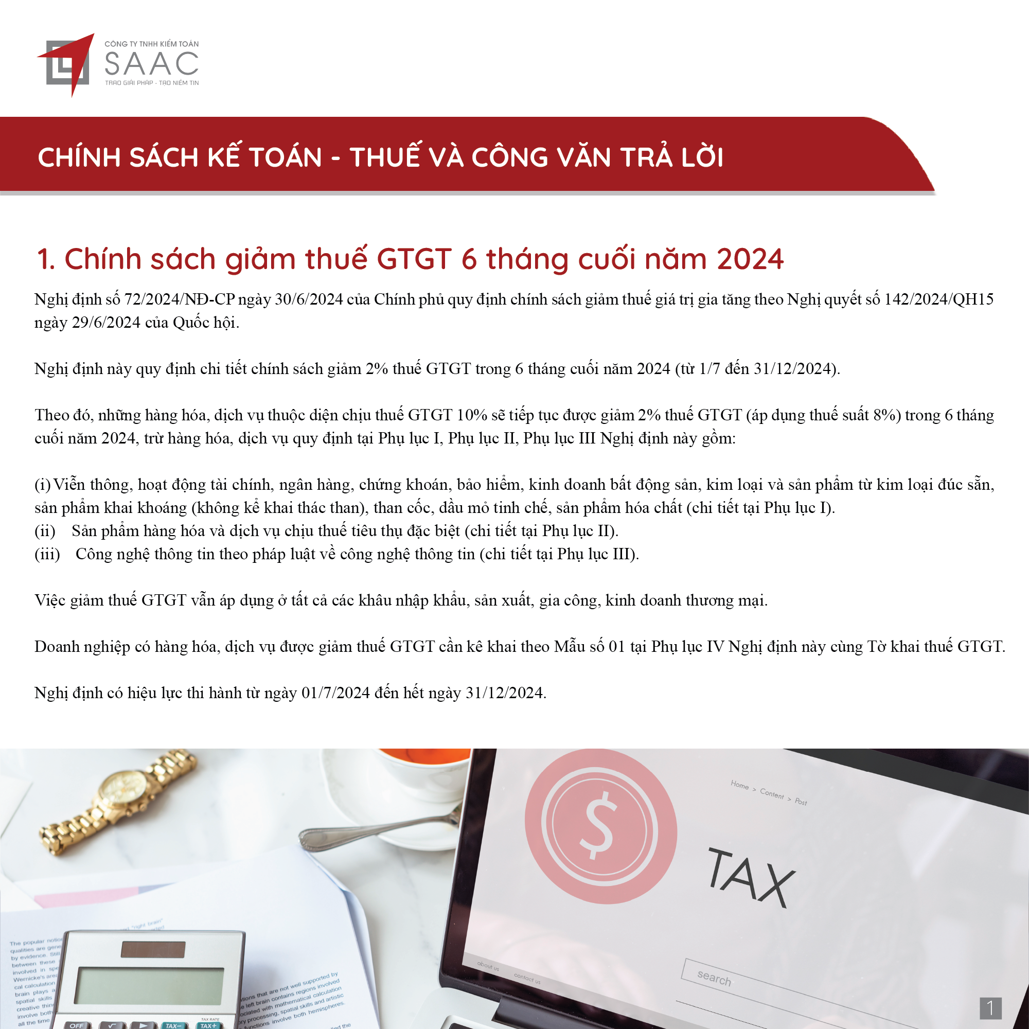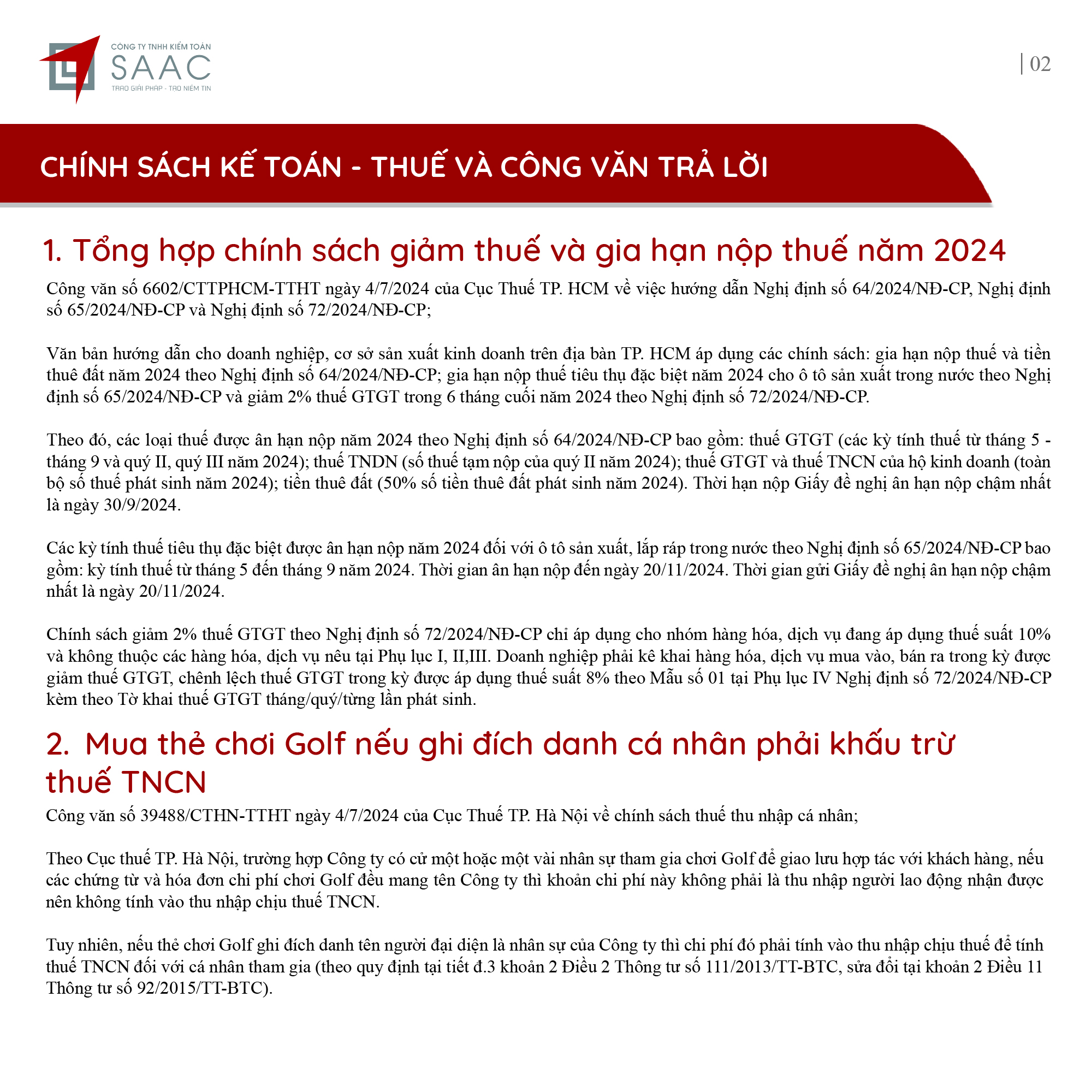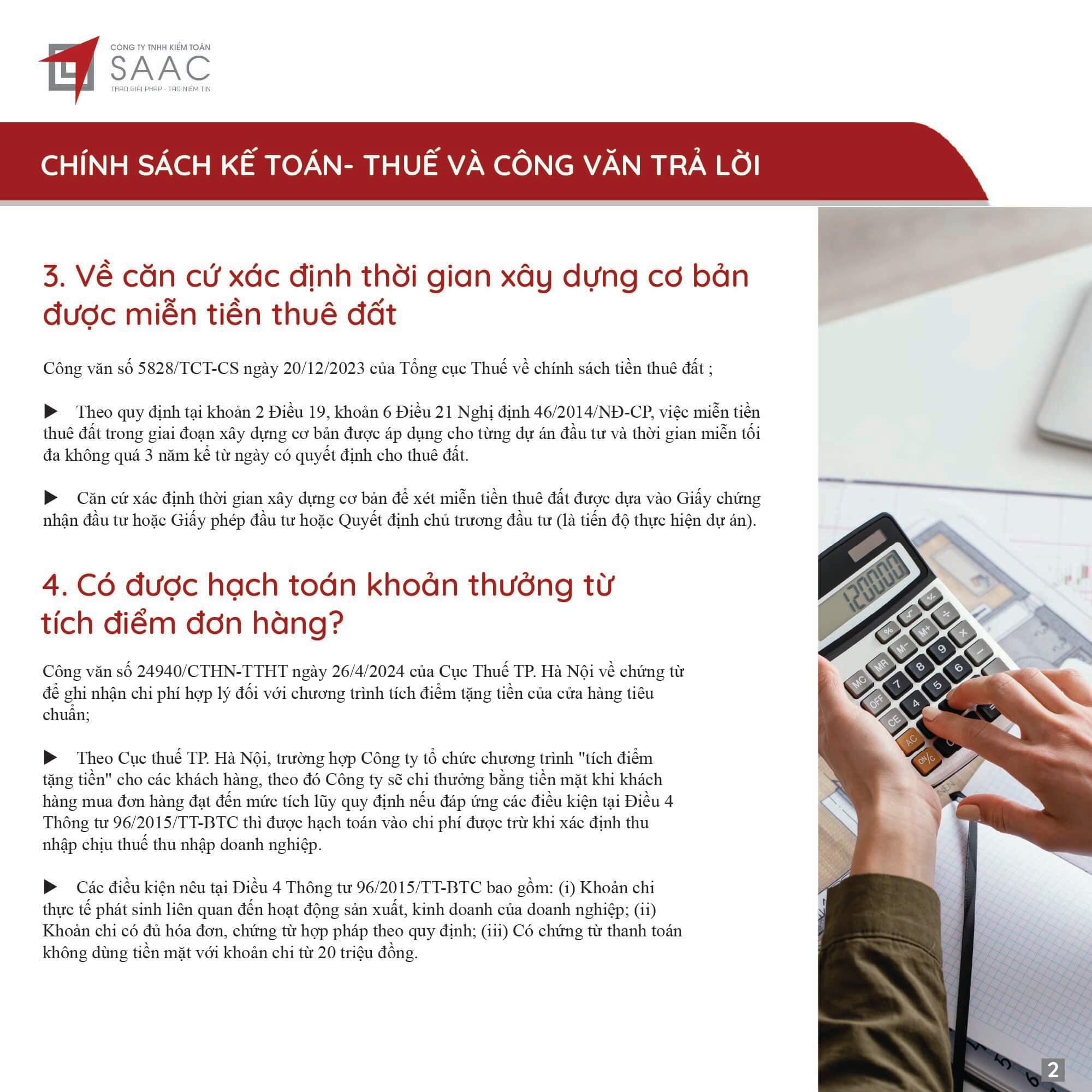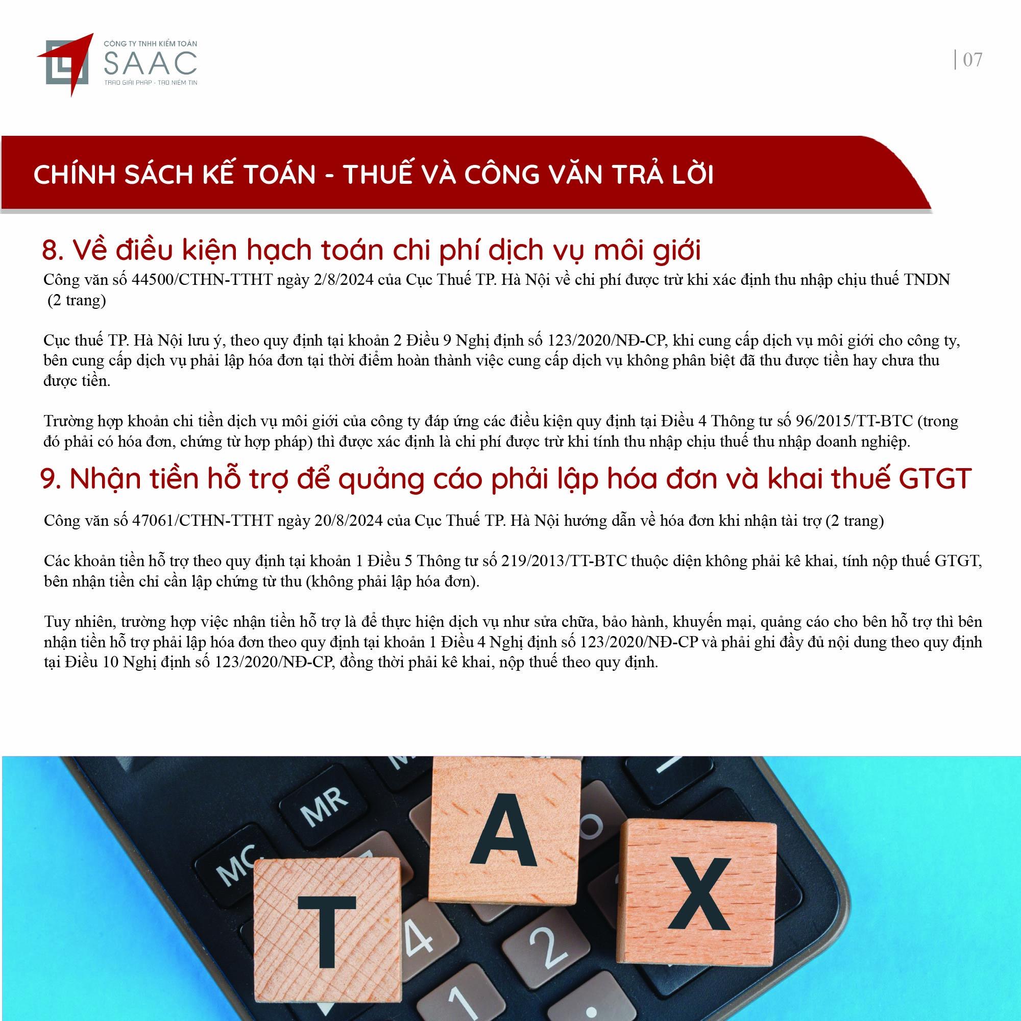 Bản tin SAAC tháng này cập nhật các lưu ý về Các chính sách miễn, giảm, gia hạn thuế dành cho doanh nghiệp bị bão số 3 Yagi, Dự kiến giảm 15% đến 30% tiền thuê đất năm 2024, Tổng hợp các bất cập của chính sách pháp luật về kinh doanh bất động sản, Sáp nhập công ty sau khi mua lại, chính sách thuế được quy định thế nào?, Chương trình khuyến mại trị giá dưới 100 triệu đồng được miễn đăng ký,..