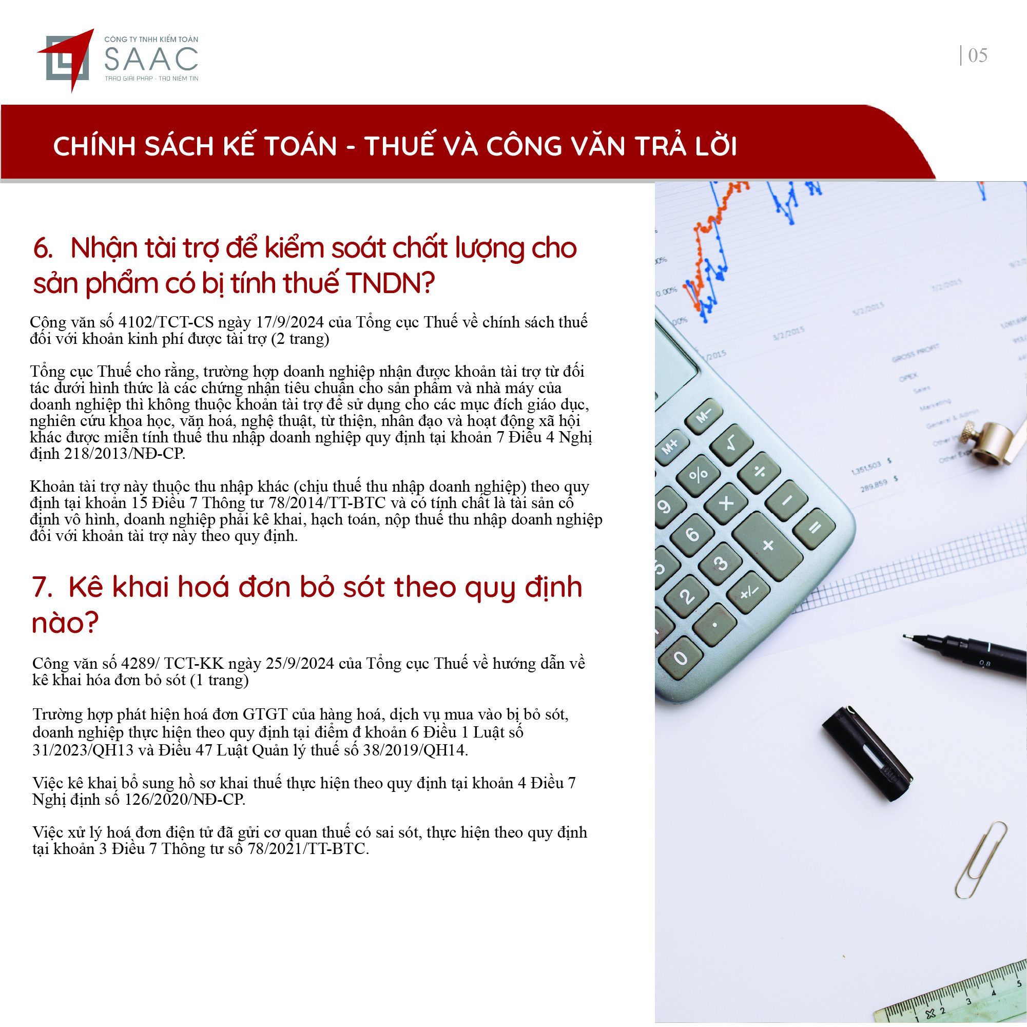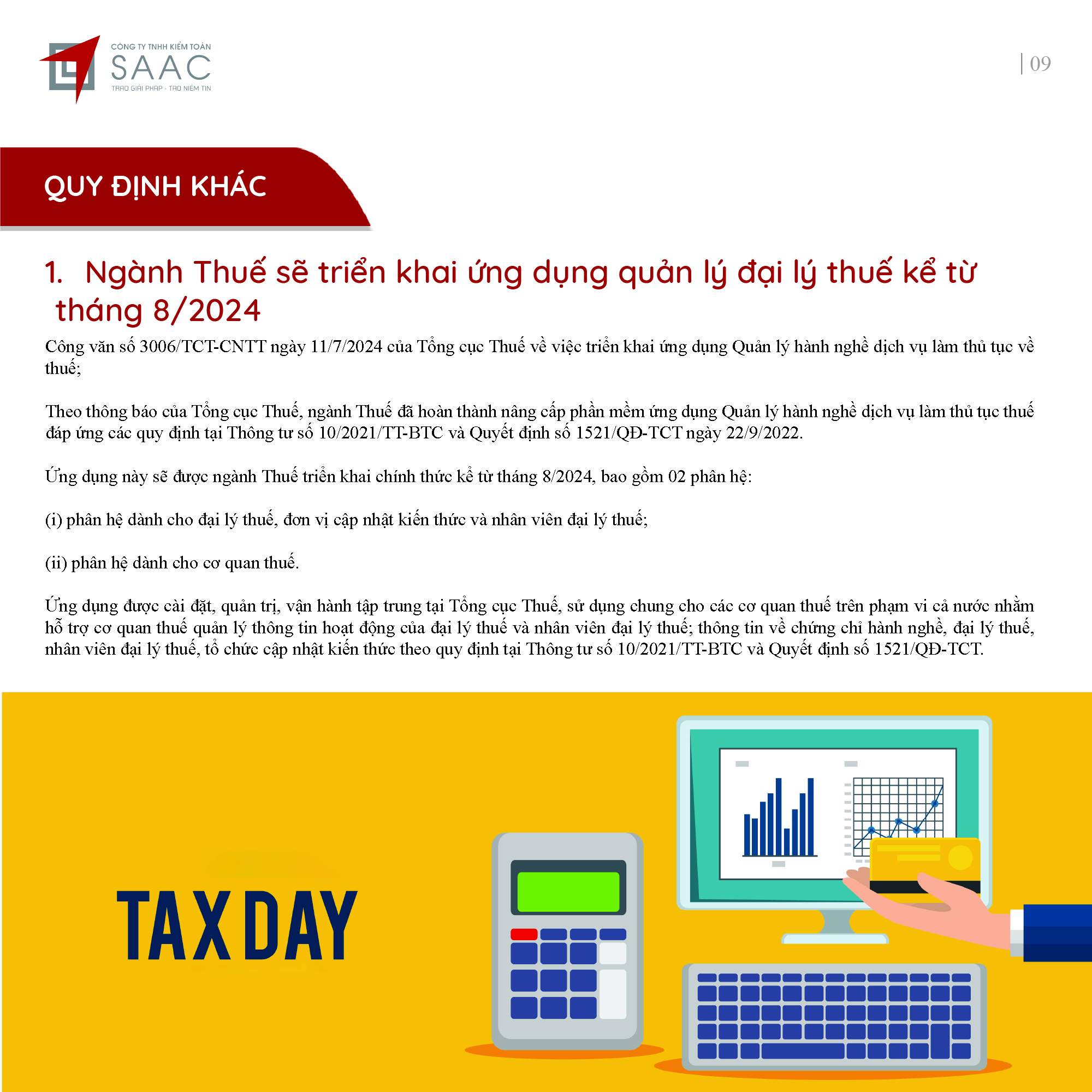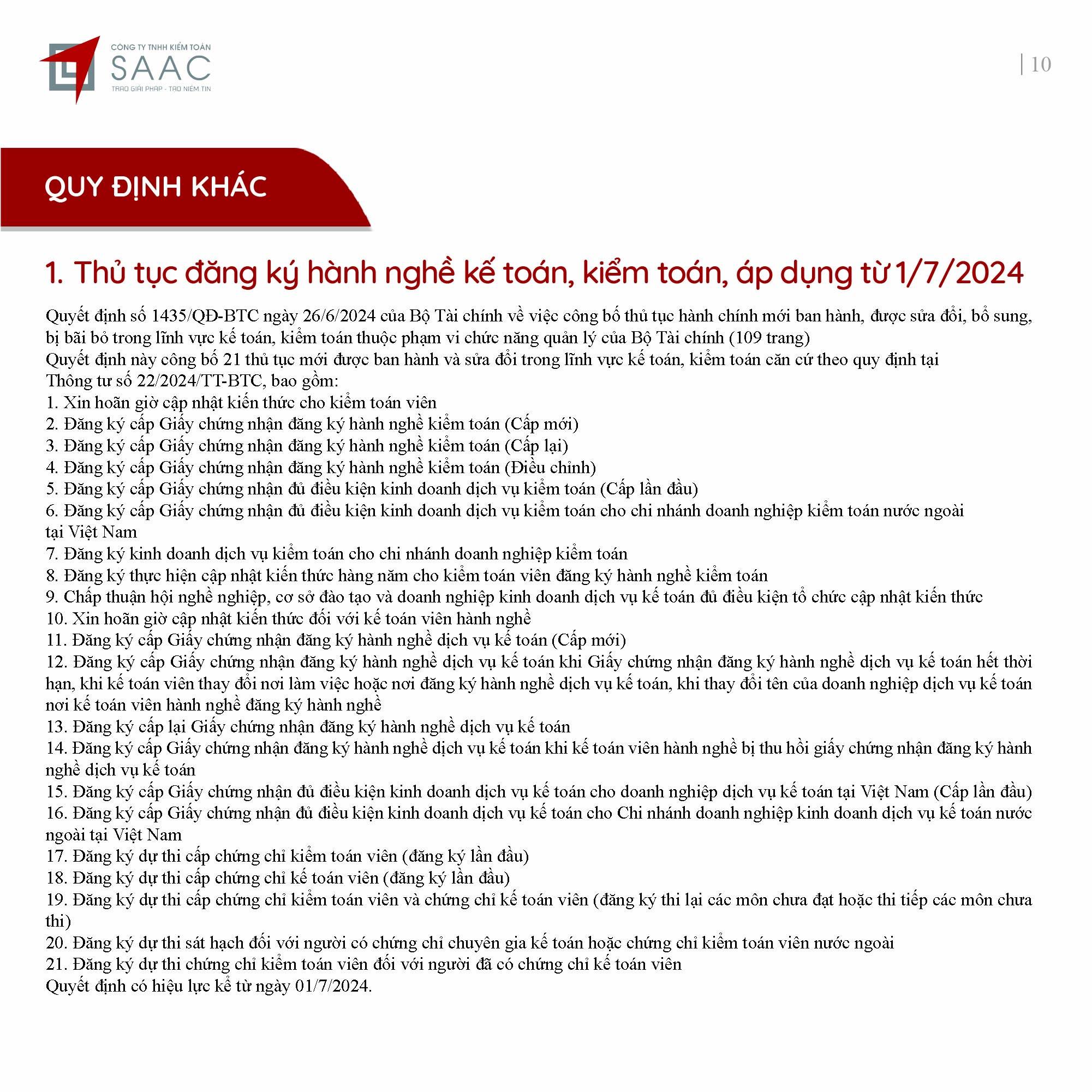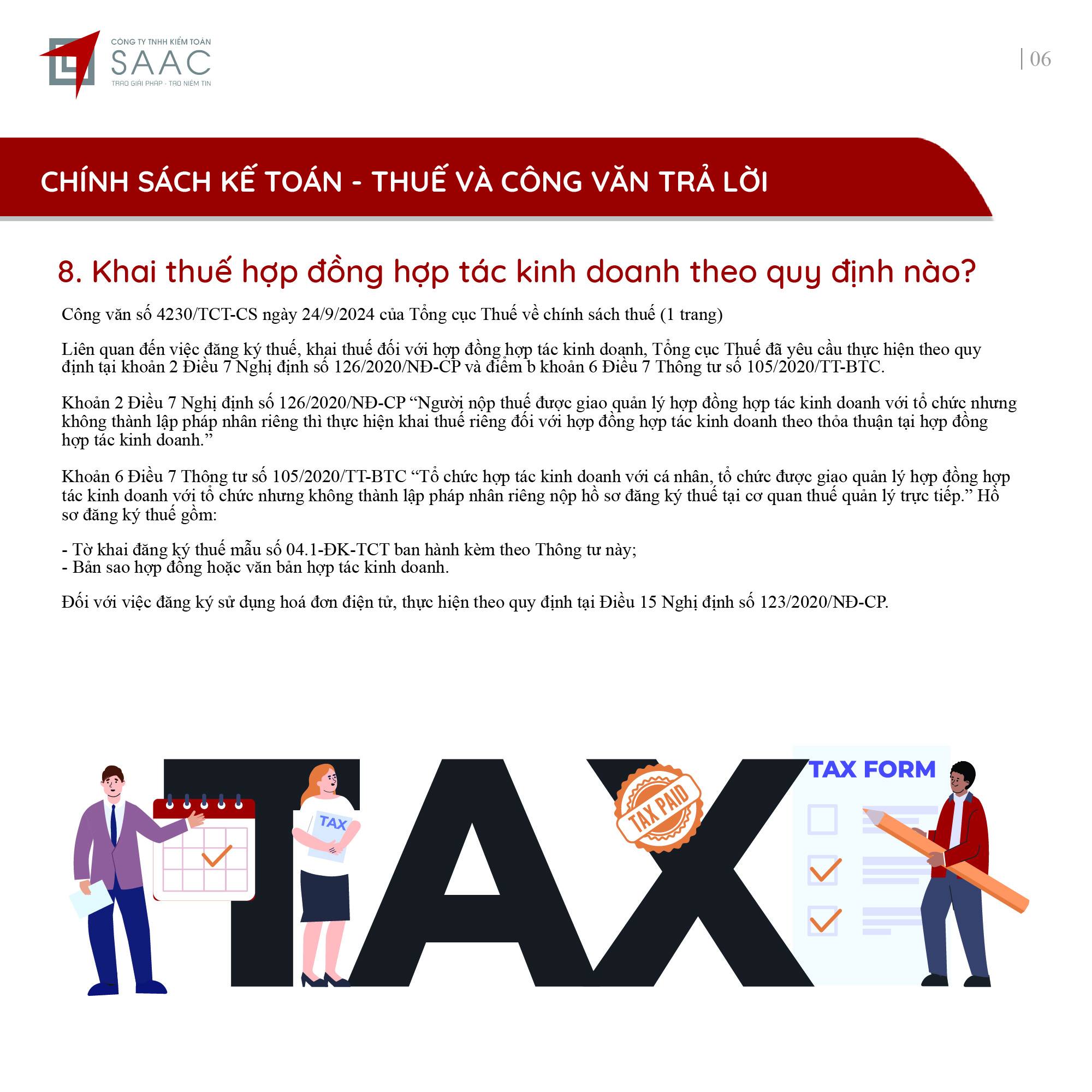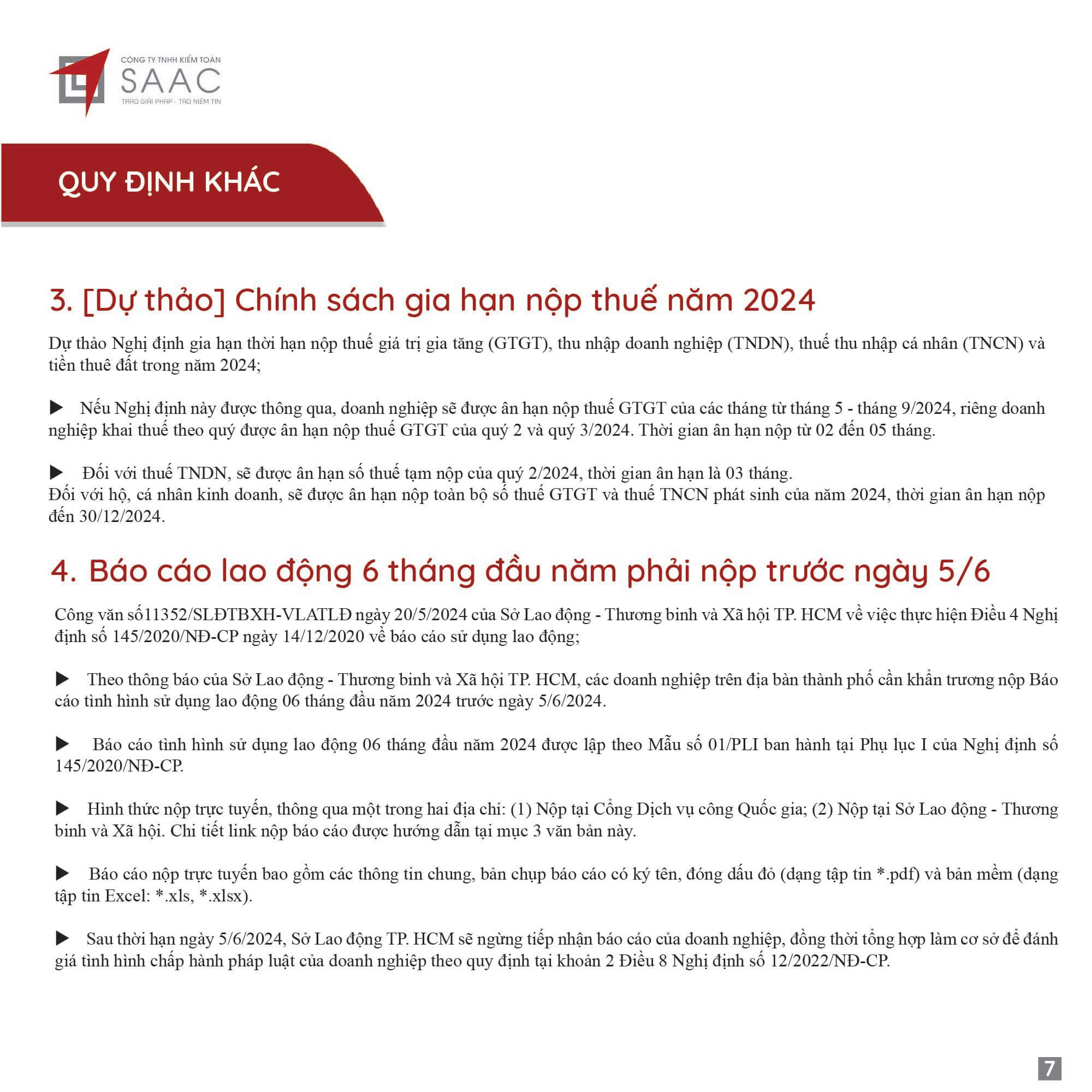 Bản tin SAAC tháng này cập nhật các lưu ý về Các chính sách miễn, giảm, gia hạn thuế dành cho doanh nghiệp bị bão số 3 Yagi, Dự kiến giảm 15% đến 30% tiền thuê đất năm 2024, Tổng hợp các bất cập của chính sách pháp luật về kinh doanh bất động sản, Sáp nhập công ty sau khi mua lại, chính sách thuế được quy định thế nào?, Chương trình khuyến mại trị giá dưới 100 triệu đồng được miễn đăng ký,..