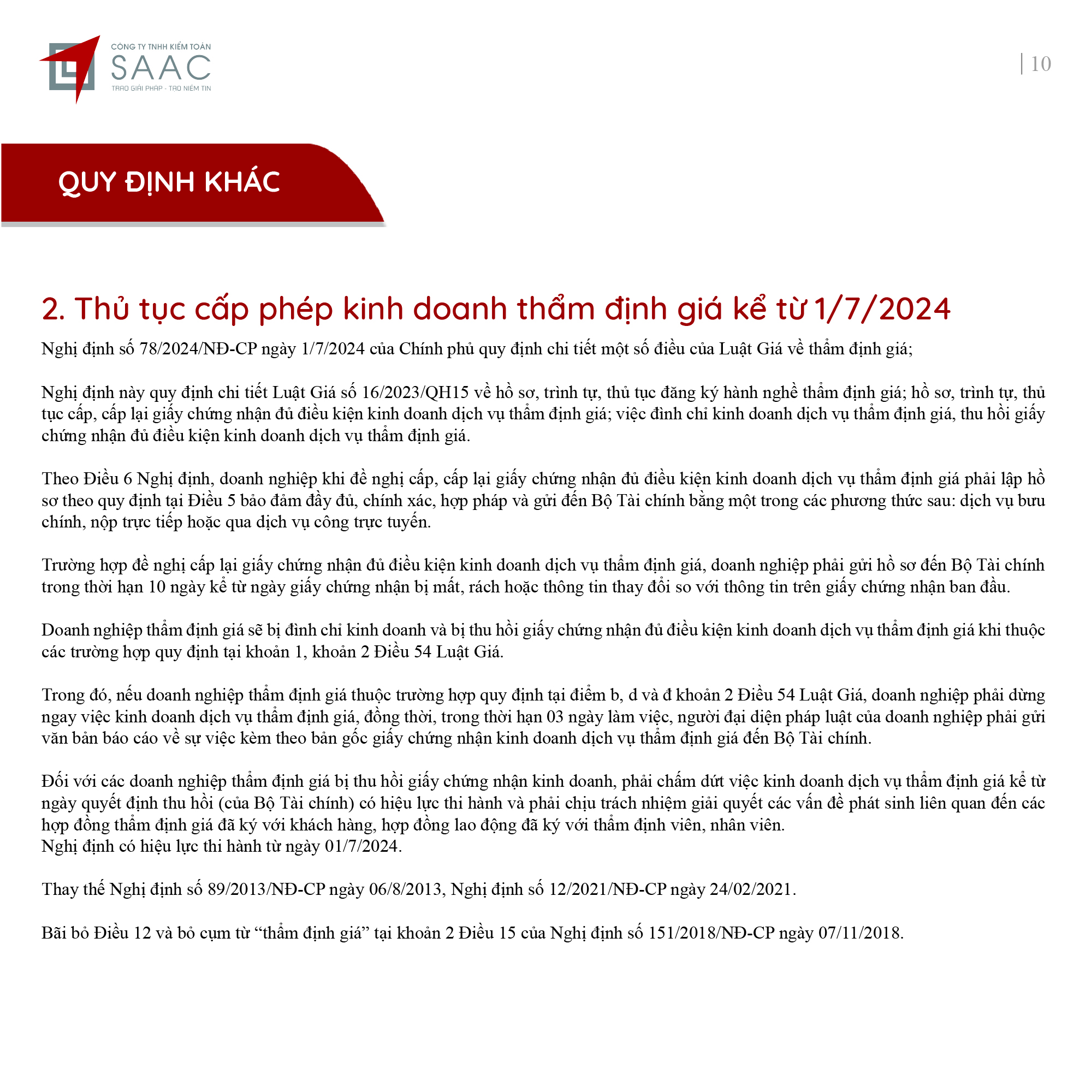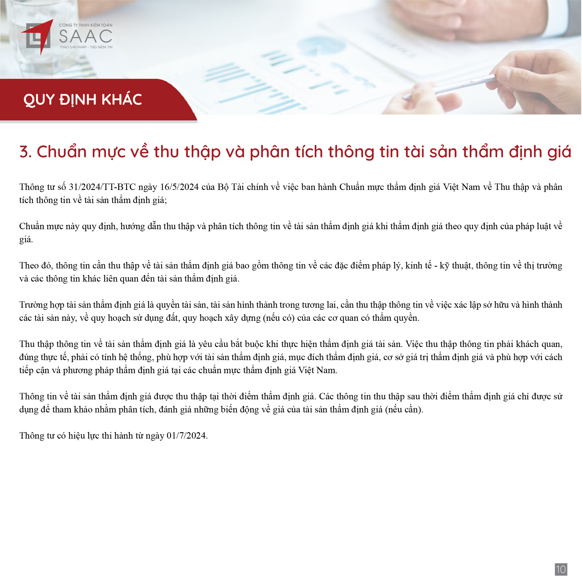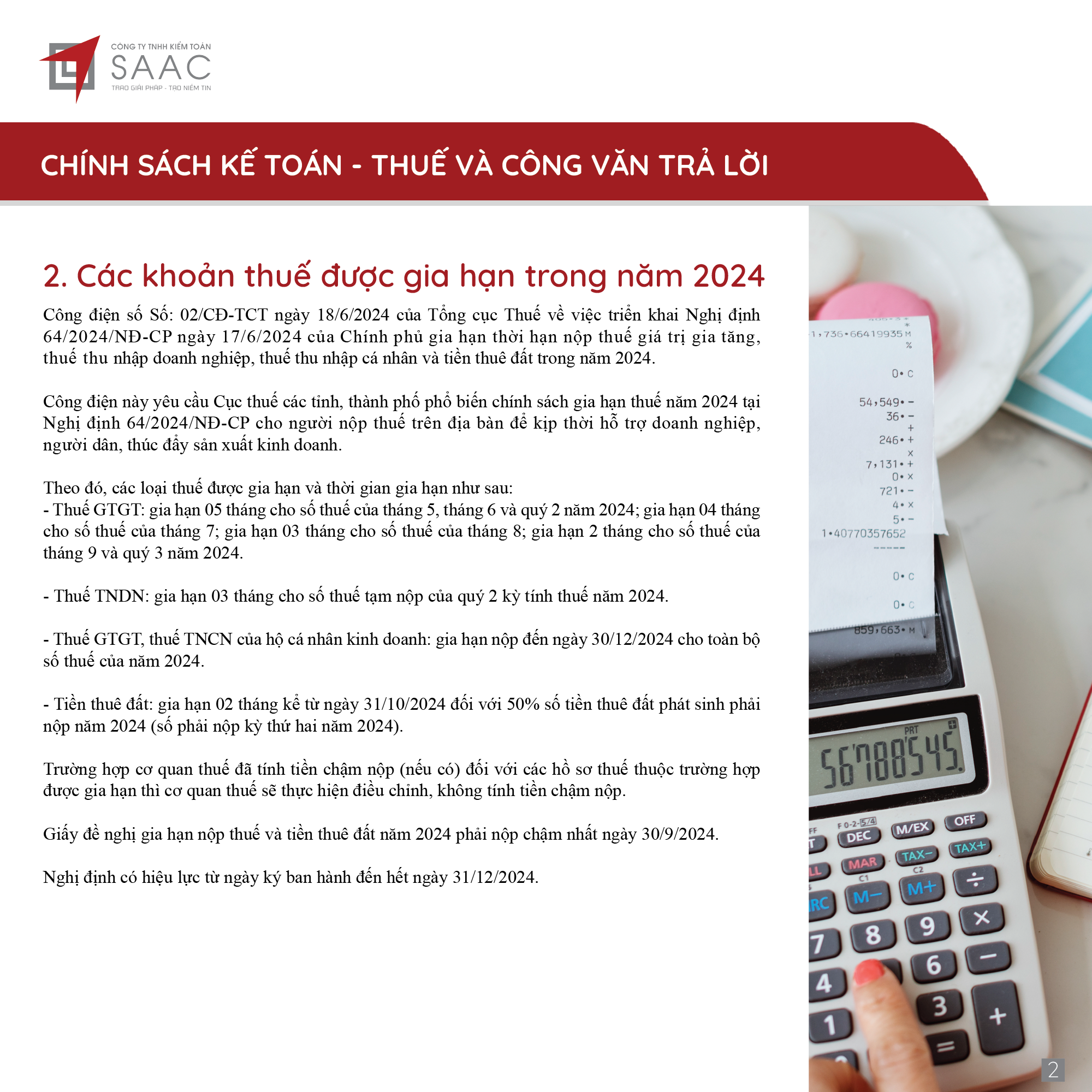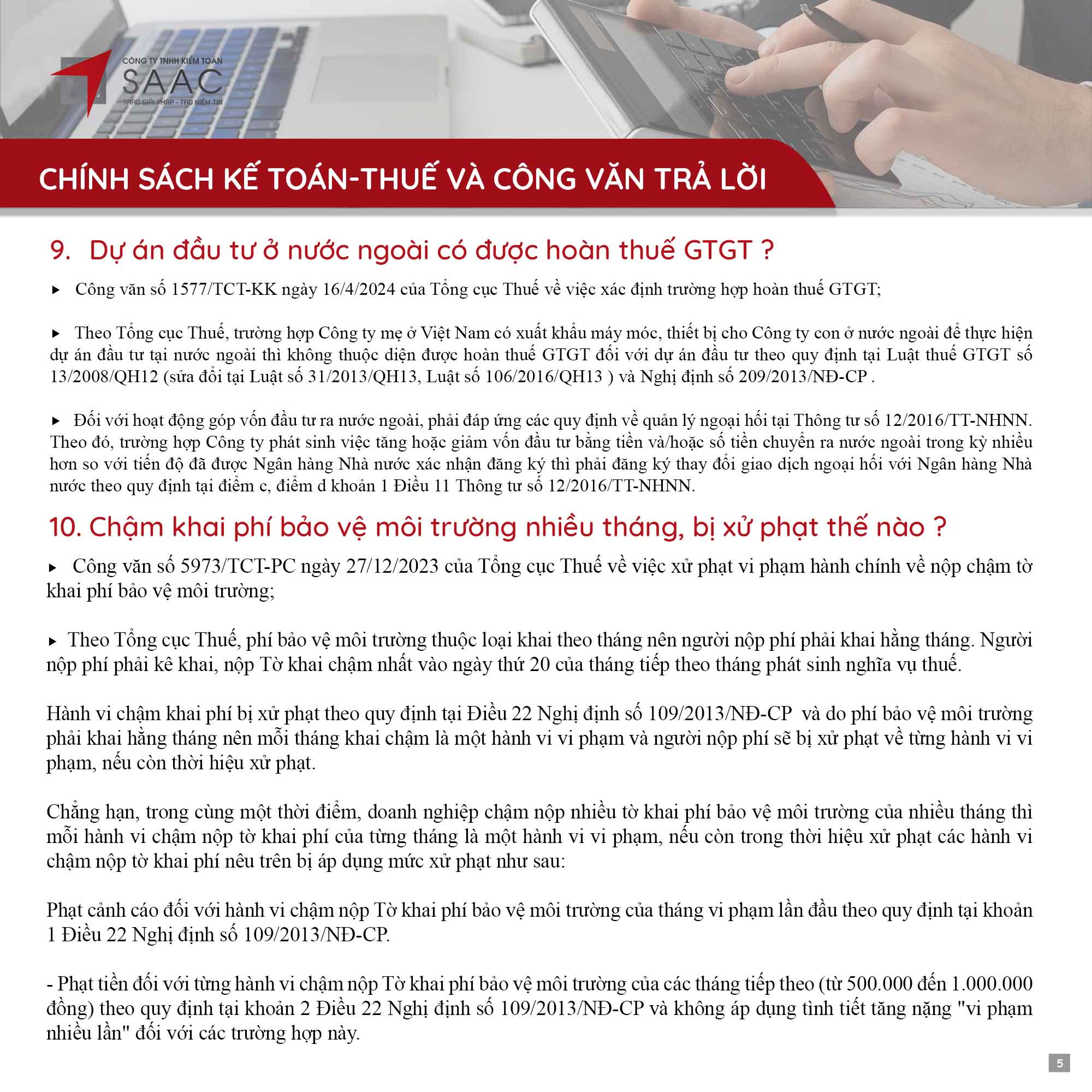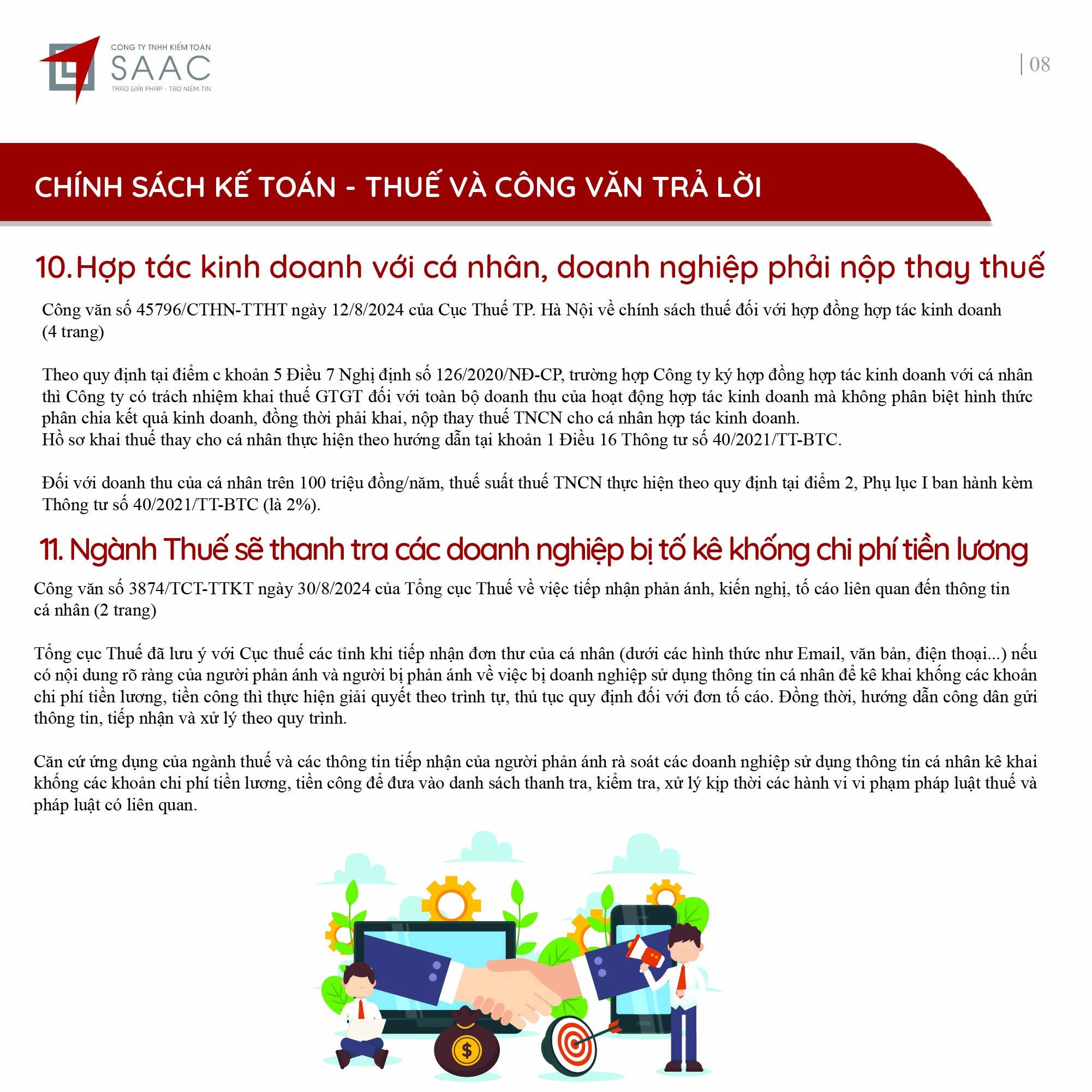 Bản tin SAAC tháng này cập nhật các lưu ý về Các chính sách miễn, giảm, gia hạn thuế dành cho doanh nghiệp bị bão số 3 Yagi, Dự kiến giảm 15% đến 30% tiền thuê đất năm 2024, Tổng hợp các bất cập của chính sách pháp luật về kinh doanh bất động sản, Sáp nhập công ty sau khi mua lại, chính sách thuế được quy định thế nào?, Chương trình khuyến mại trị giá dưới 100 triệu đồng được miễn đăng ký,..