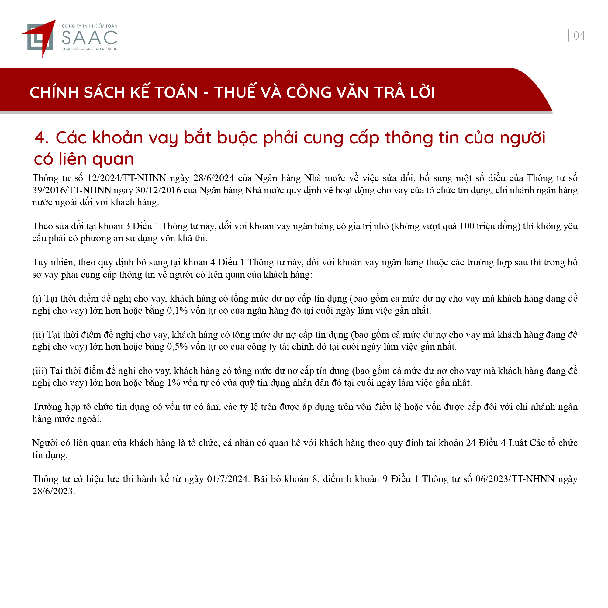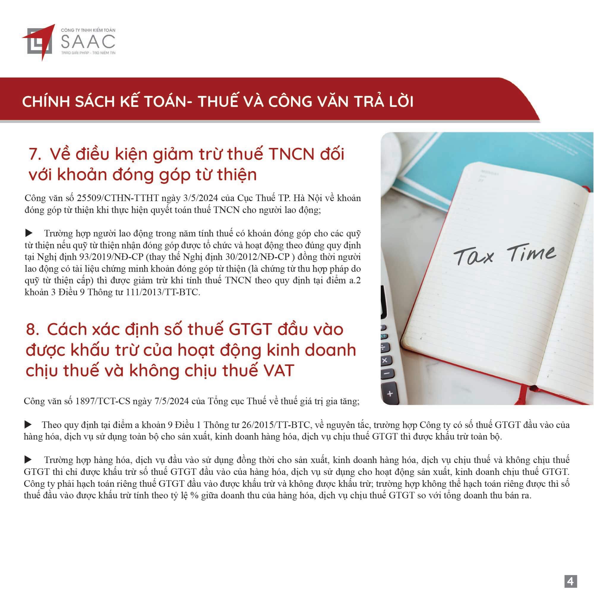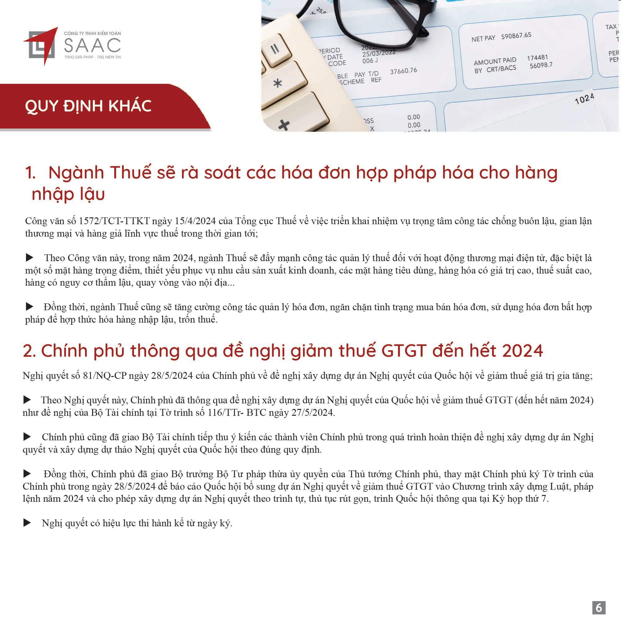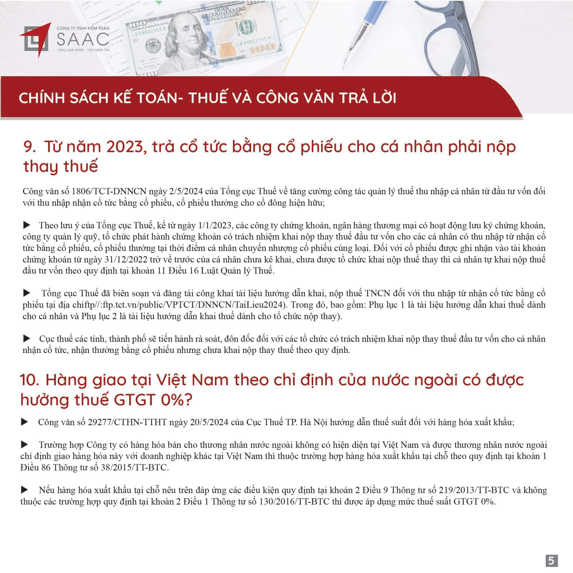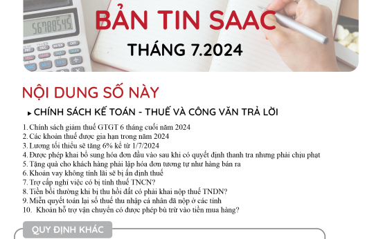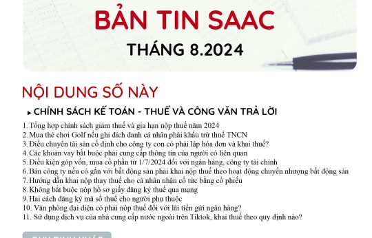 Bản tin SAAC tháng này cập nhật các lưu ý vềTổng hợp chính sách giảm thuế và gia hạn nộp thuế năm 2024, Các khoản vay bắt buộc phải cung cấp thông tin của người có liên quan, Điều kiện góp vốn, mua cổ phần từ 1/7/2024 đối với ngân hàng, công ty tài chính, Hướng dẫn khai nộp thay thuế cho cá nhân nhận cổ tức bằng cổ phiếu,…