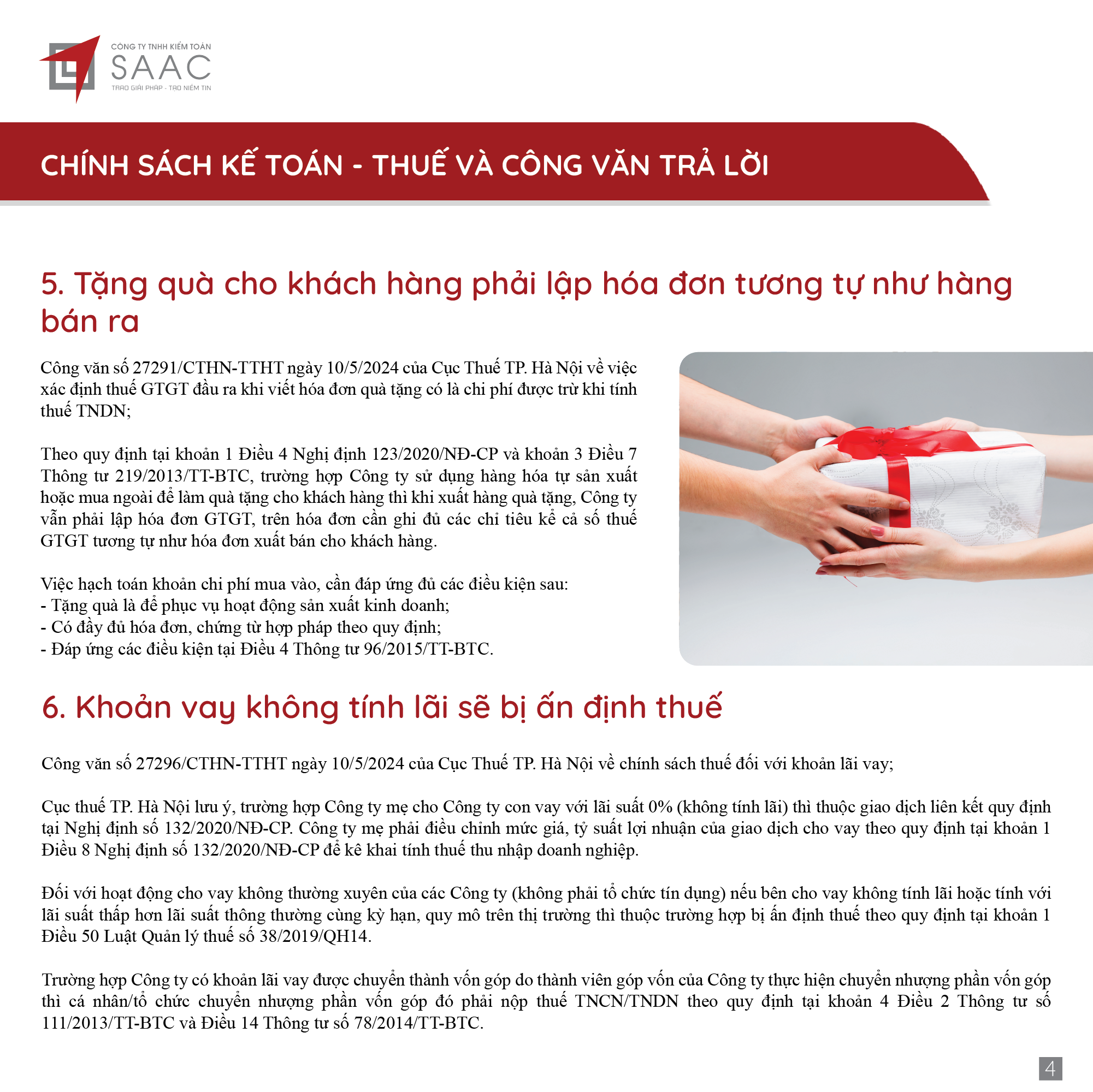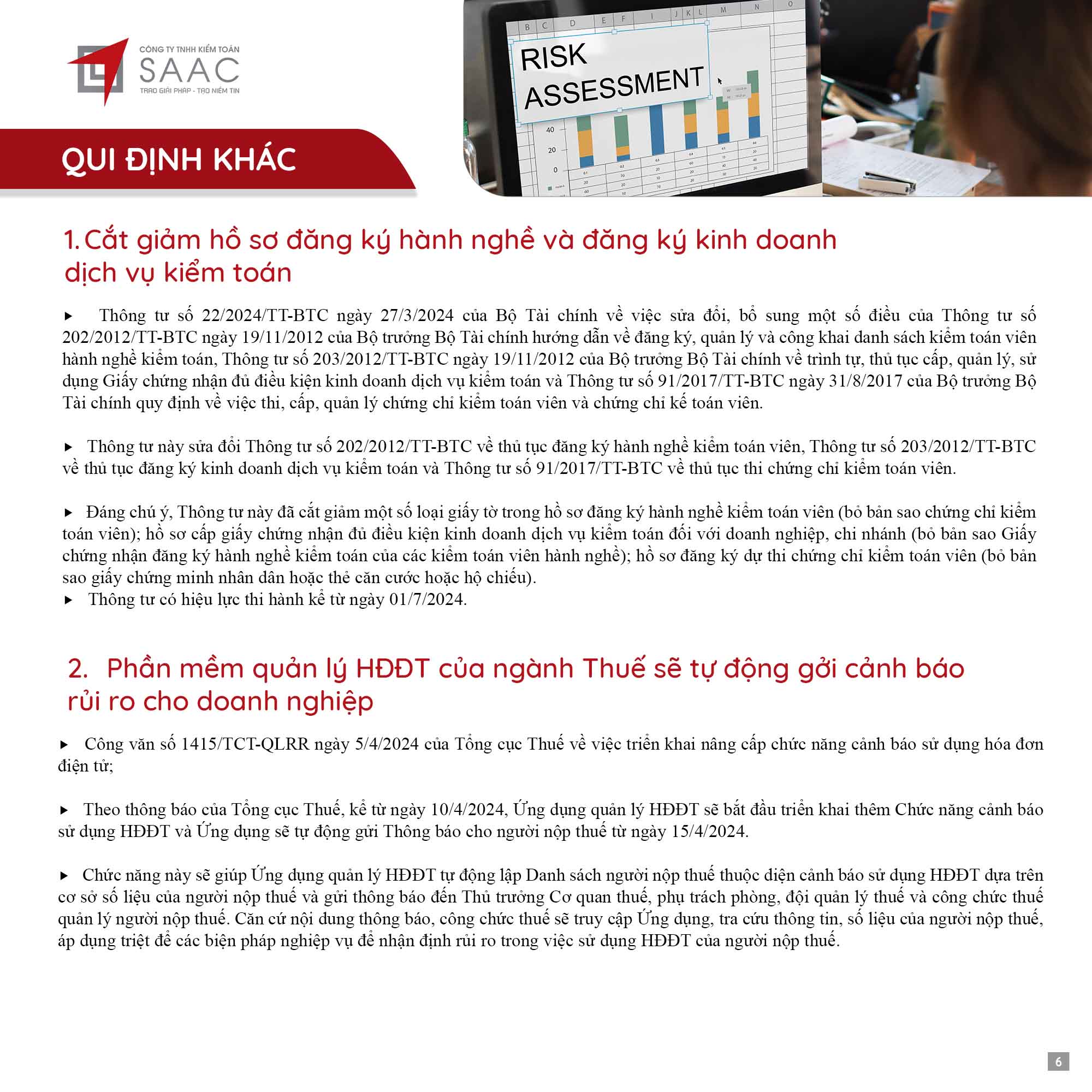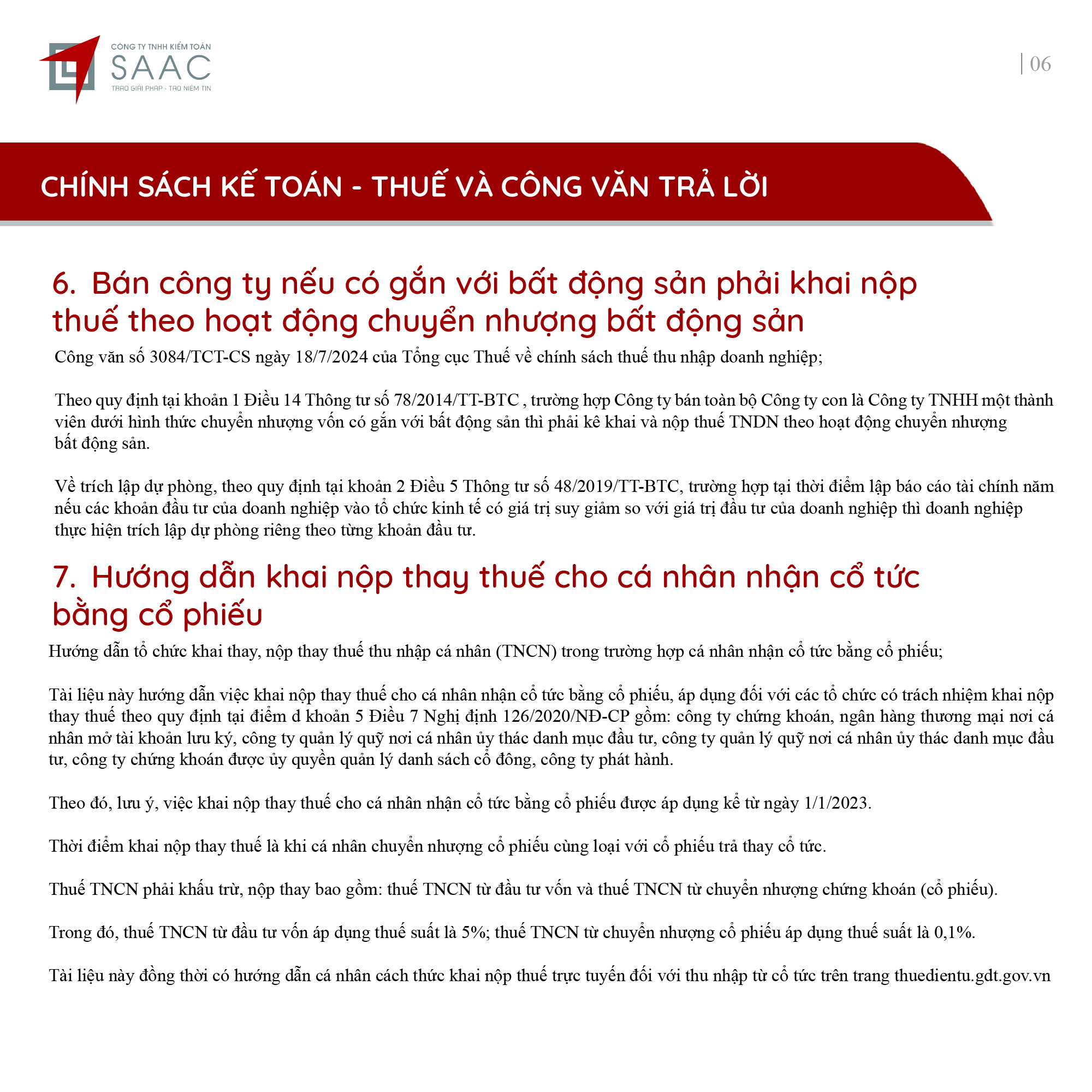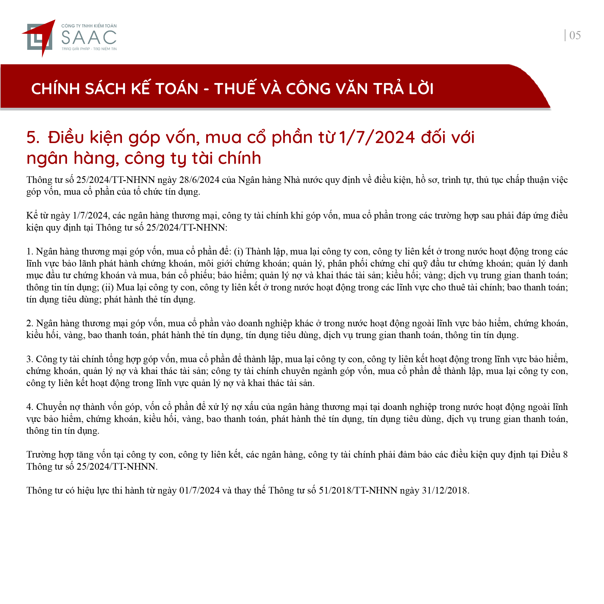 Bản tin SAAC tháng này cập nhật các lưu ý vềTổng hợp chính sách giảm thuế và gia hạn nộp thuế năm 2024, Các khoản vay bắt buộc phải cung cấp thông tin của người có liên quan, Điều kiện góp vốn, mua cổ phần từ 1/7/2024 đối với ngân hàng, công ty tài chính, Hướng dẫn khai nộp thay thuế cho cá nhân nhận cổ tức bằng cổ phiếu,…