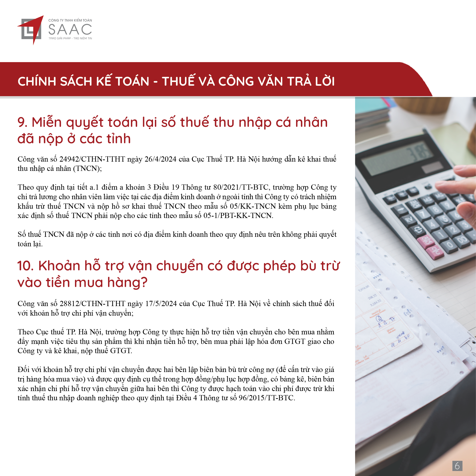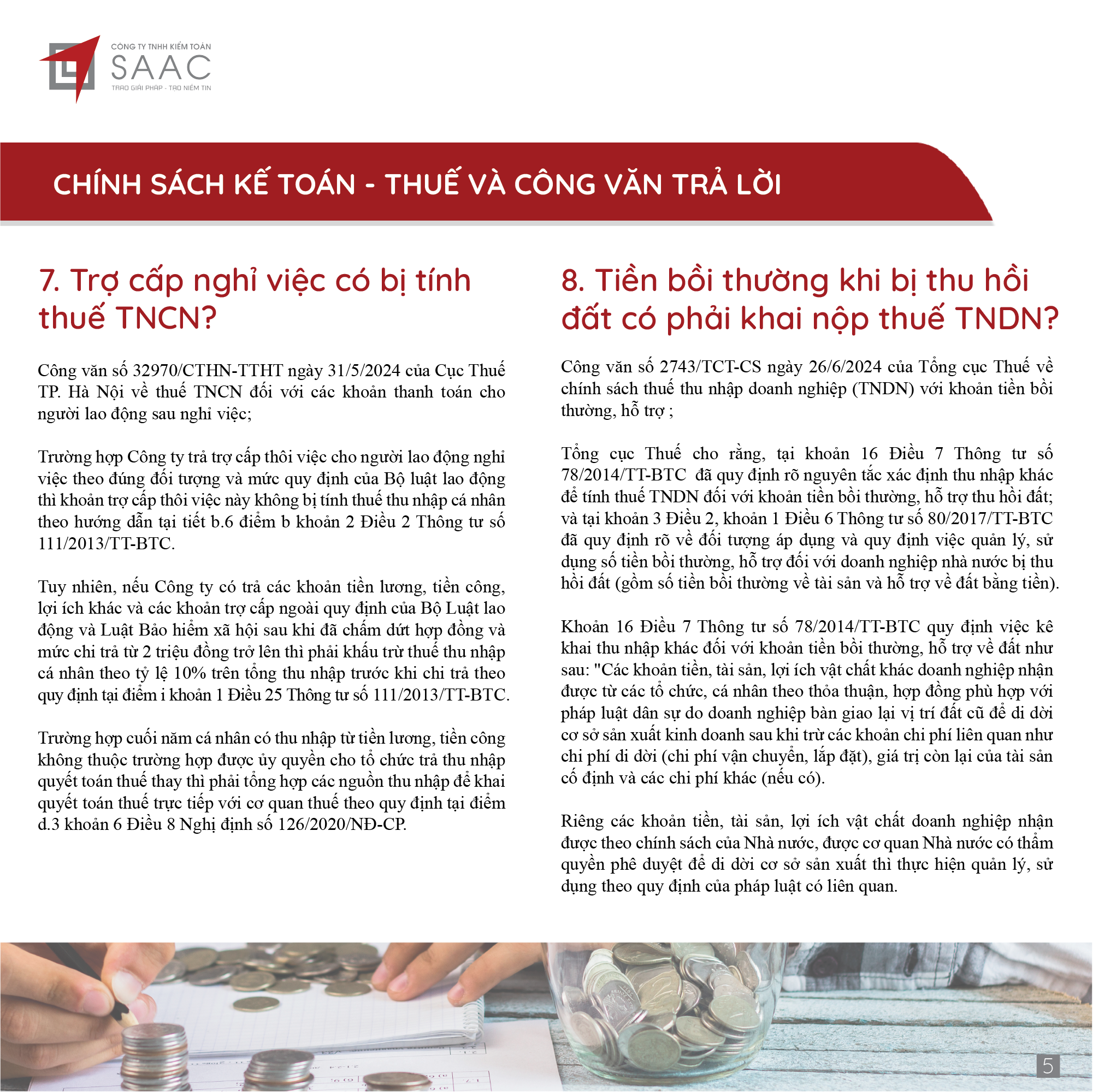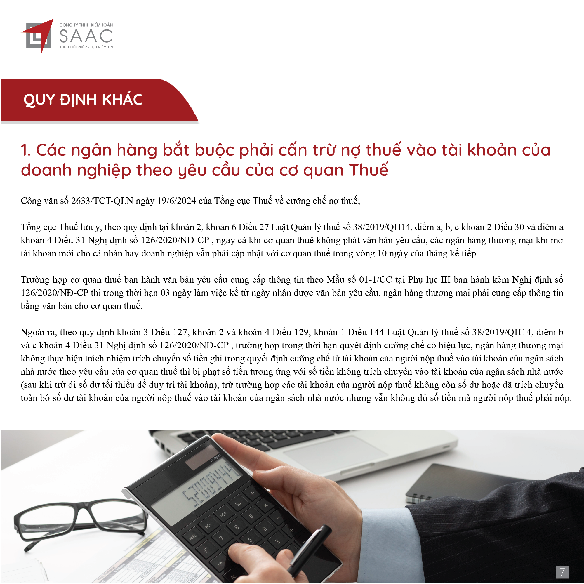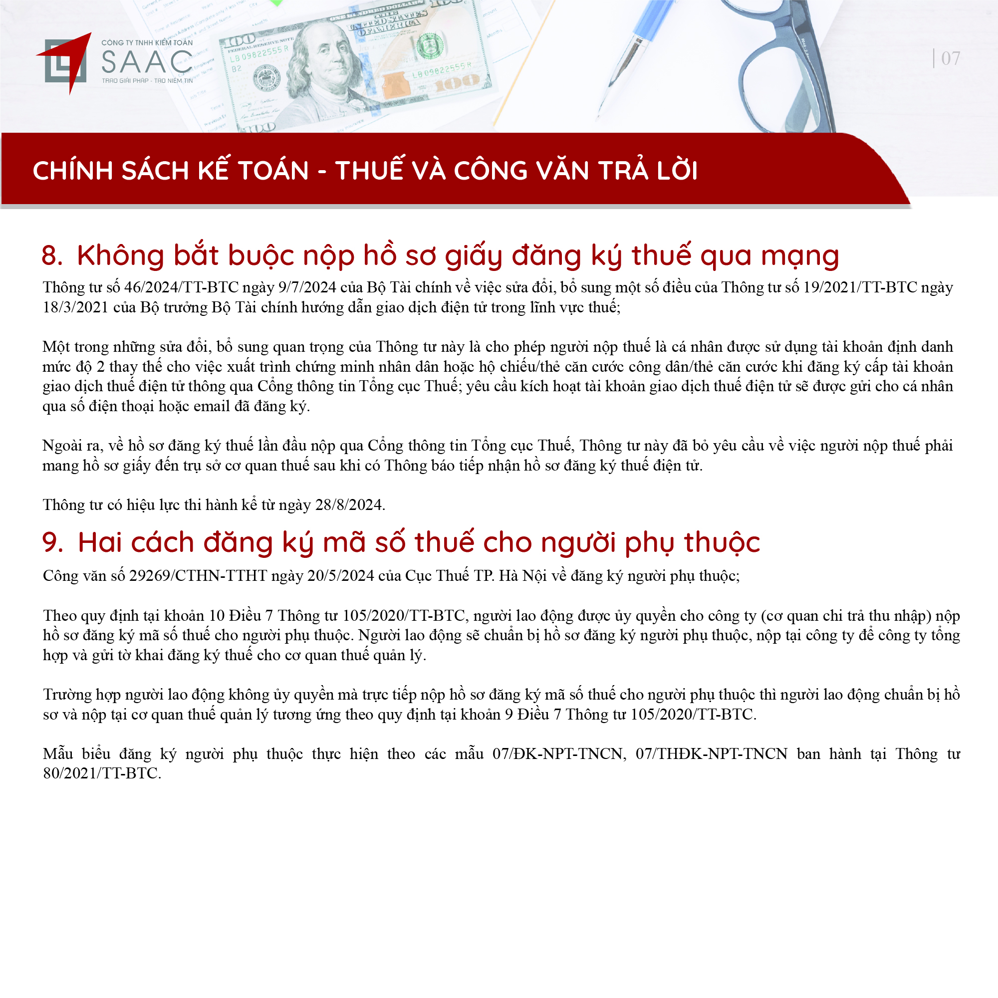 Bản tin SAAC tháng này cập nhật các lưu ý vềTổng hợp chính sách giảm thuế và gia hạn nộp thuế năm 2024, Các khoản vay bắt buộc phải cung cấp thông tin của người có liên quan, Điều kiện góp vốn, mua cổ phần từ 1/7/2024 đối với ngân hàng, công ty tài chính, Hướng dẫn khai nộp thay thuế cho cá nhân nhận cổ tức bằng cổ phiếu,…