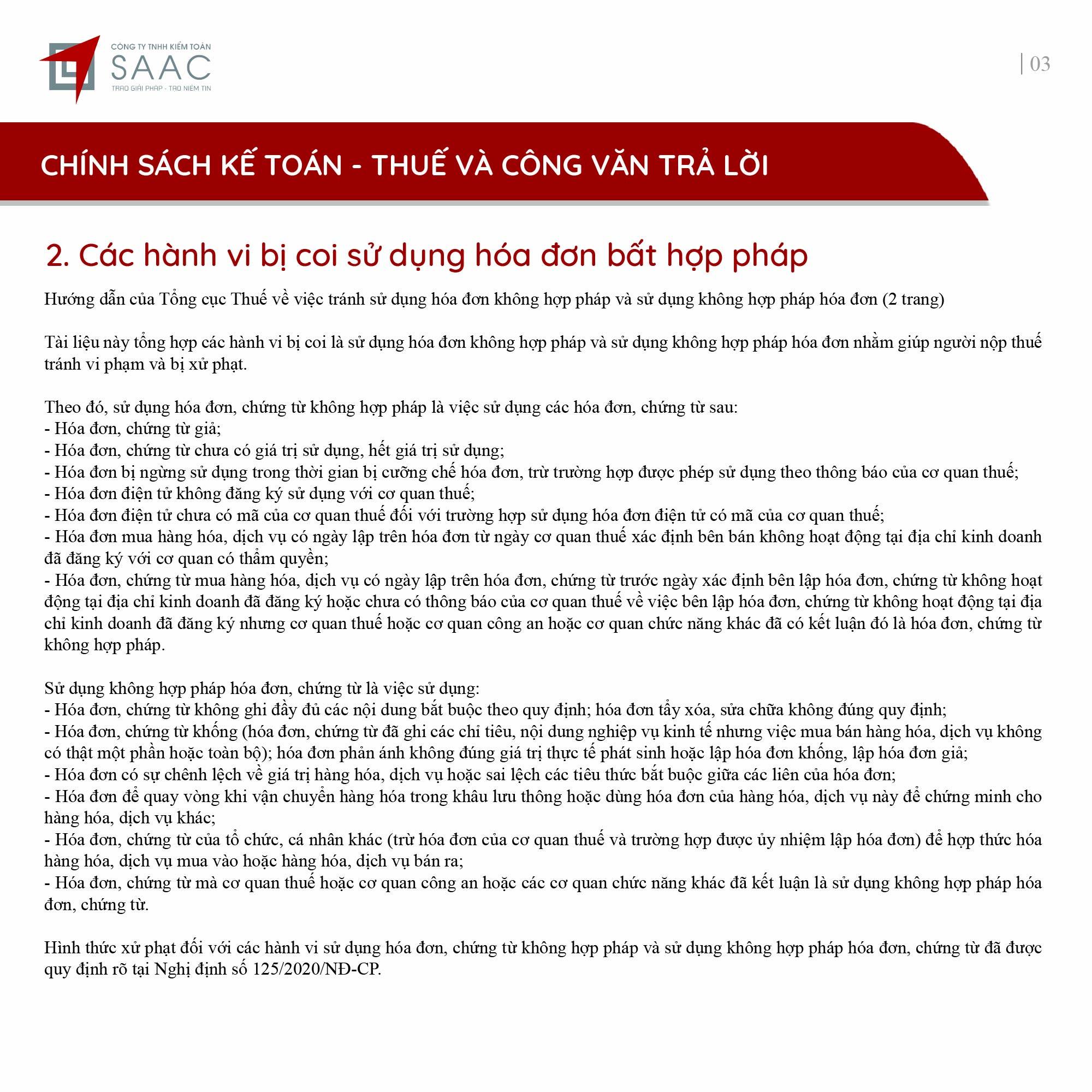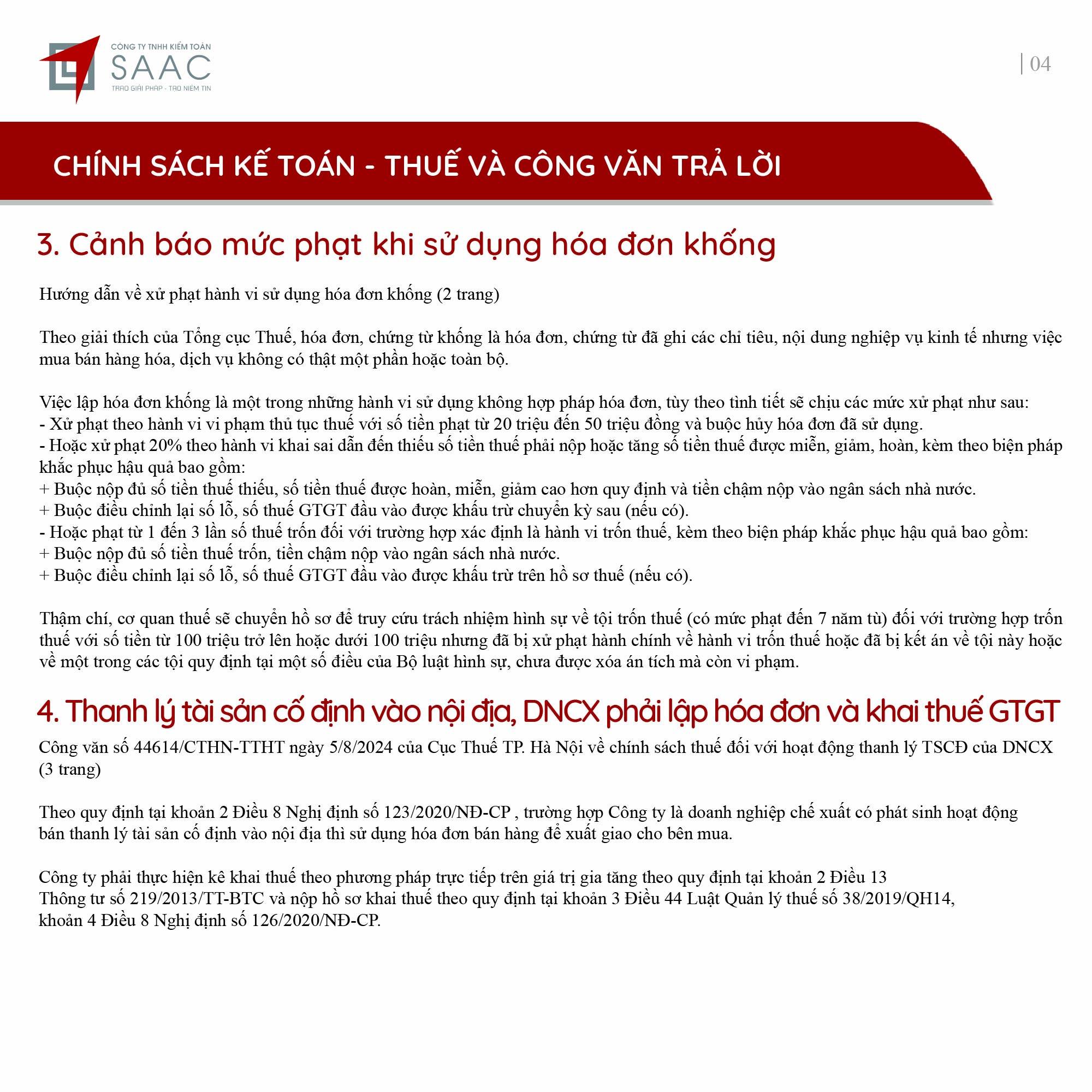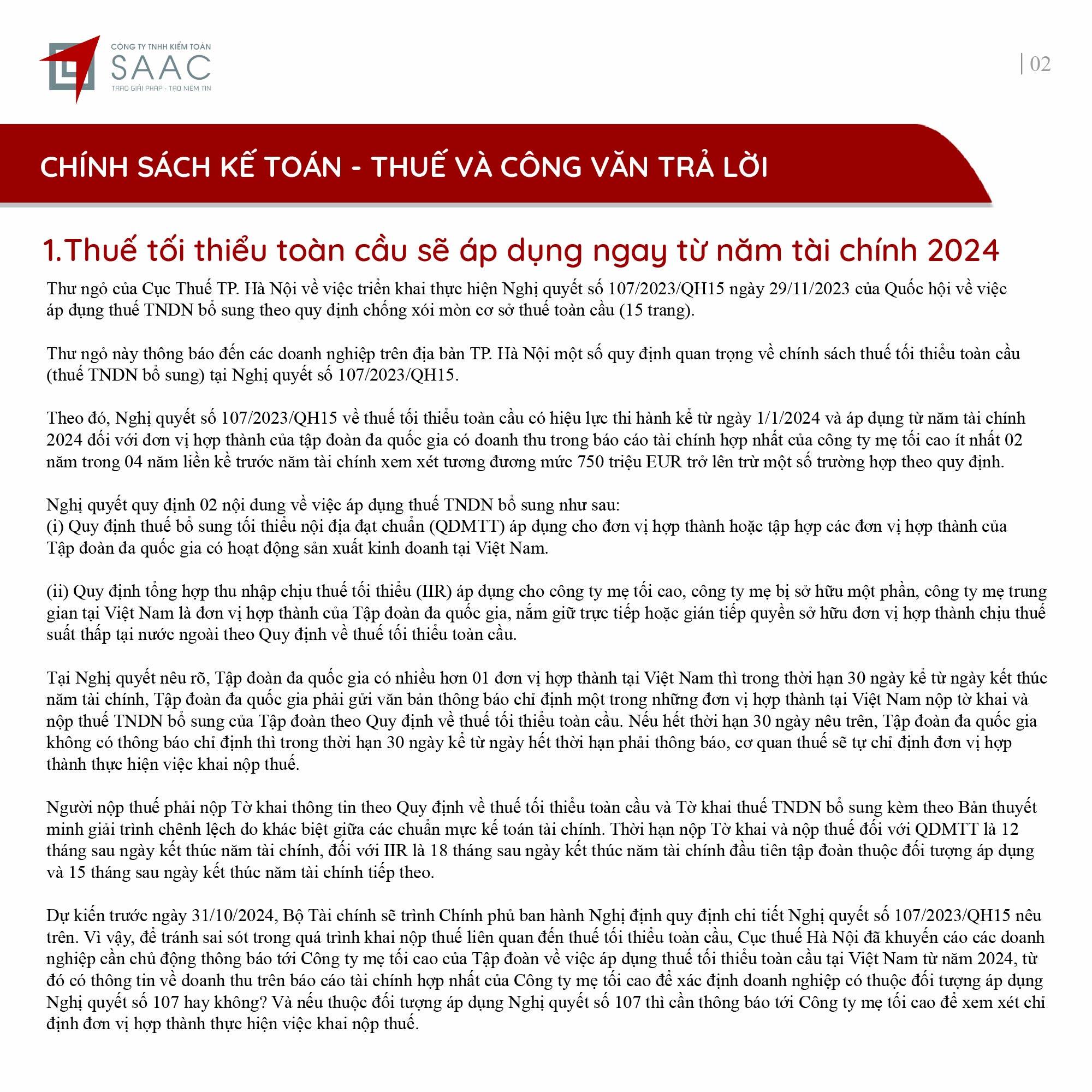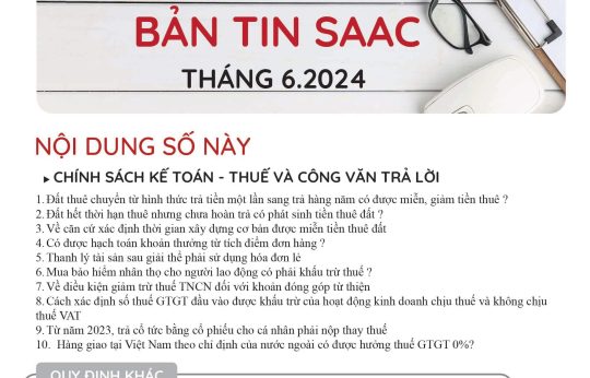 Bản tin SAAC tháng này cập nhật các lưu ý về Thuế tối thiểu toàn cầu sẽ áp dụng ngay từ năm tài chính 2024, Các hành vi bị coi sử dụng hóa đơn bất hợp pháp, Cảnh báo mức phạt khi sử dụng hóa đơn khống, Thanh lý tài sản cố định vào nội địa, DNCX phải lập hóa đơn và khai thuế GTGT, Trả phí bảo lãnh vay vốn cho công ty nước ngoài phải trích nộp thuế nhà thầu,…