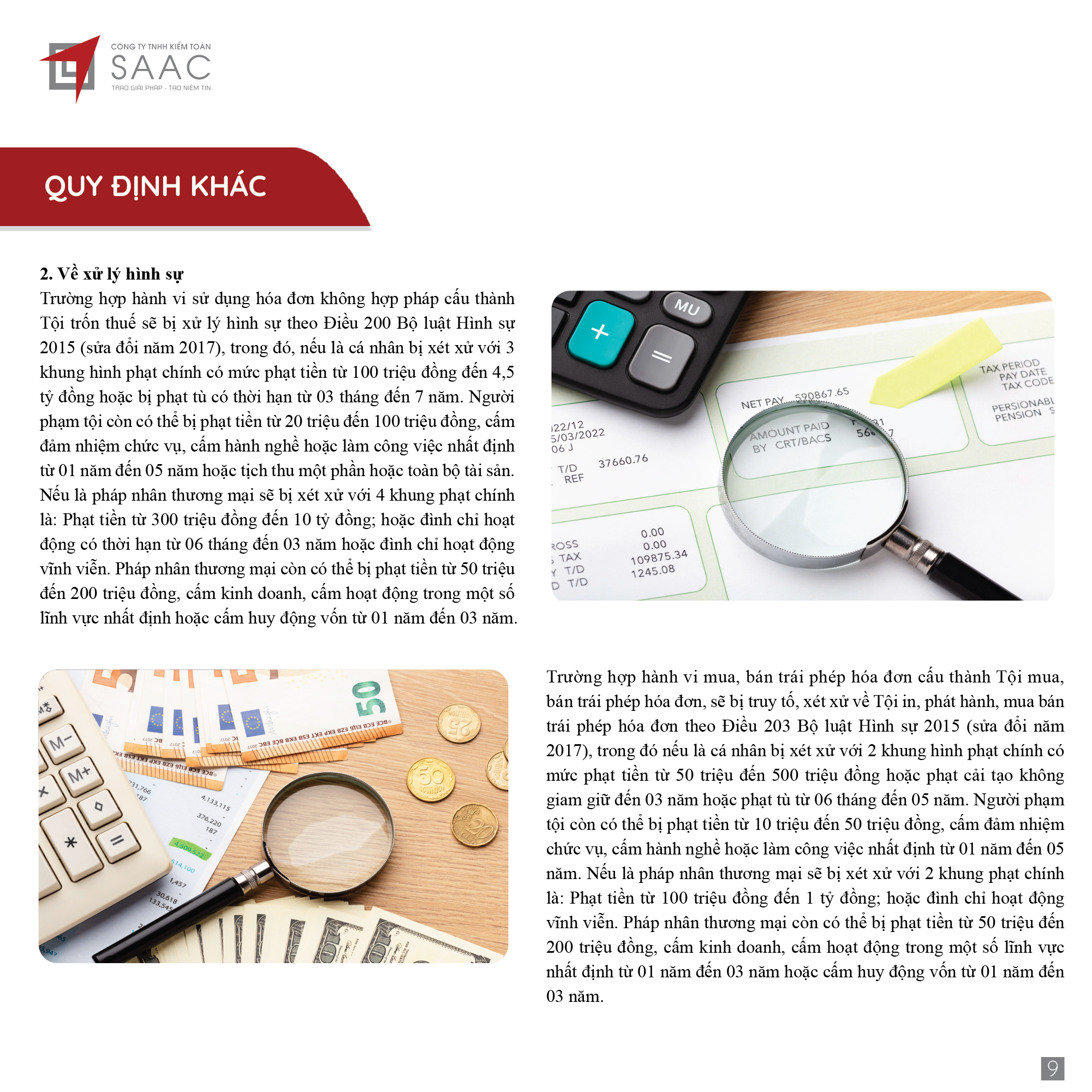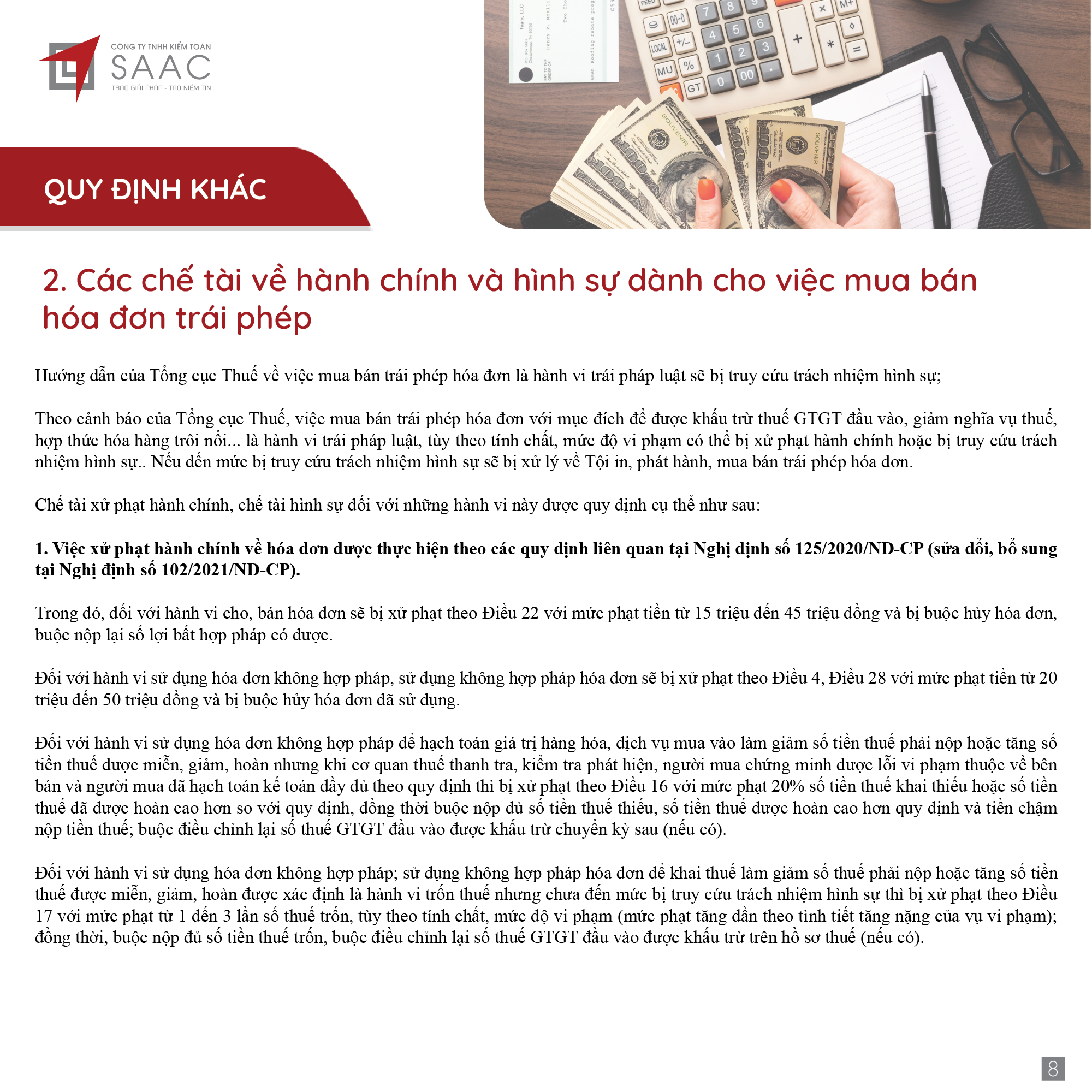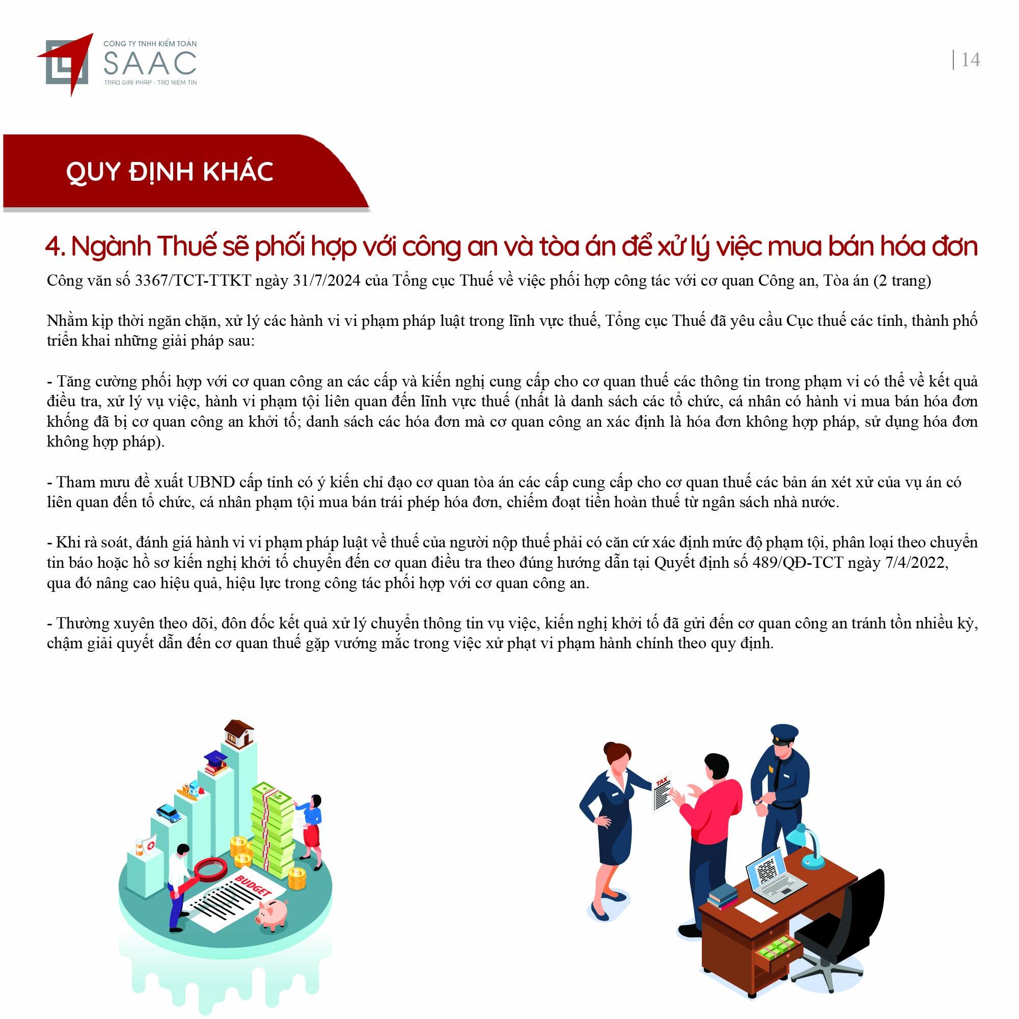 Bản tin SAAC tháng này cập nhật các lưu ý về Thuế tối thiểu toàn cầu sẽ áp dụng ngay từ năm tài chính 2024, Các hành vi bị coi sử dụng hóa đơn bất hợp pháp, Cảnh báo mức phạt khi sử dụng hóa đơn khống, Thanh lý tài sản cố định vào nội địa, DNCX phải lập hóa đơn và khai thuế GTGT, Trả phí bảo lãnh vay vốn cho công ty nước ngoài phải trích nộp thuế nhà thầu,…