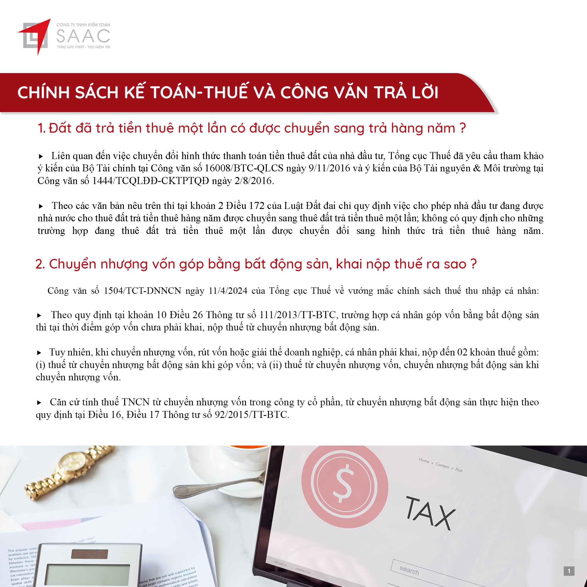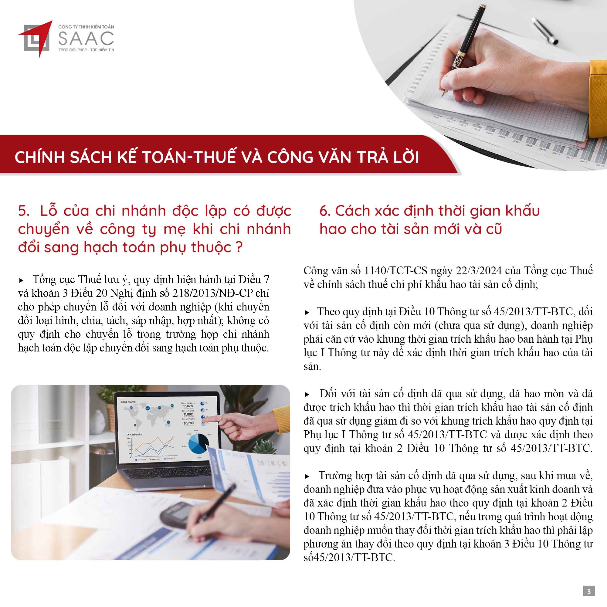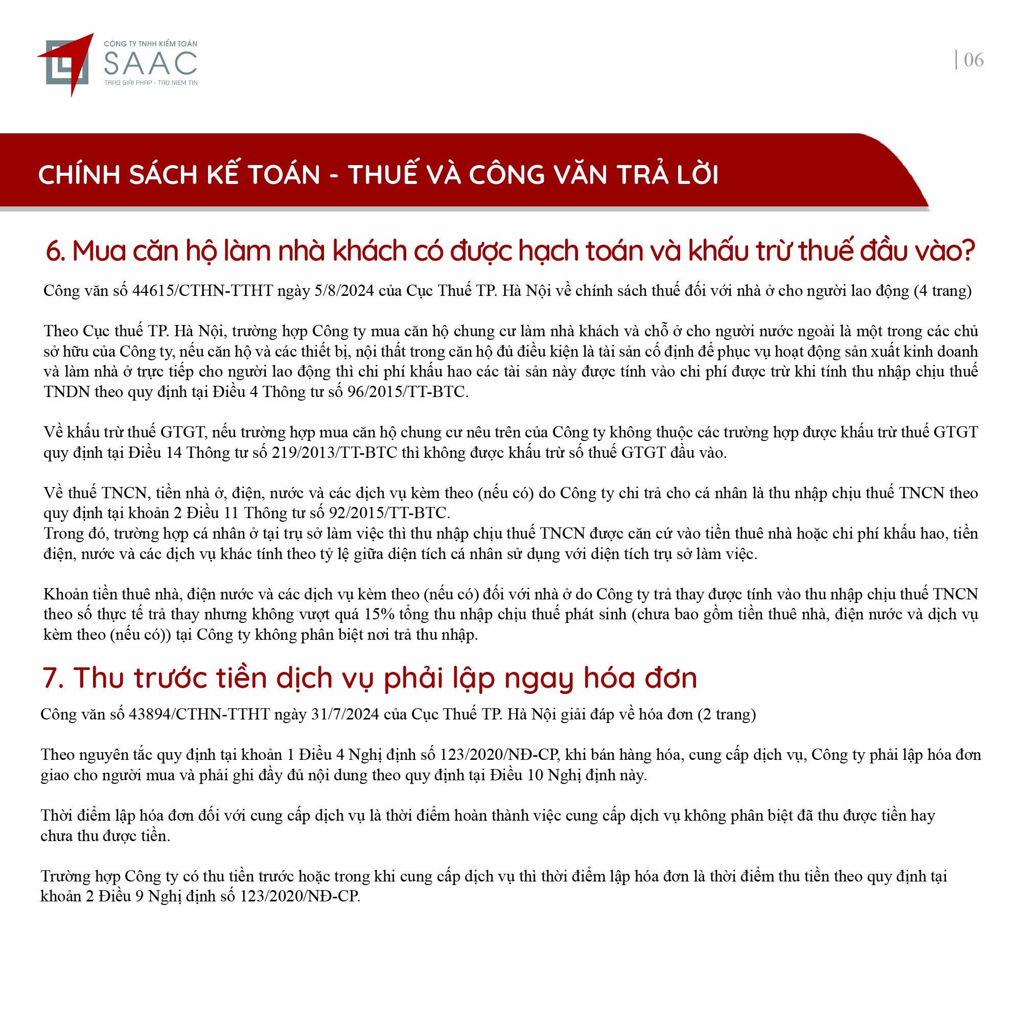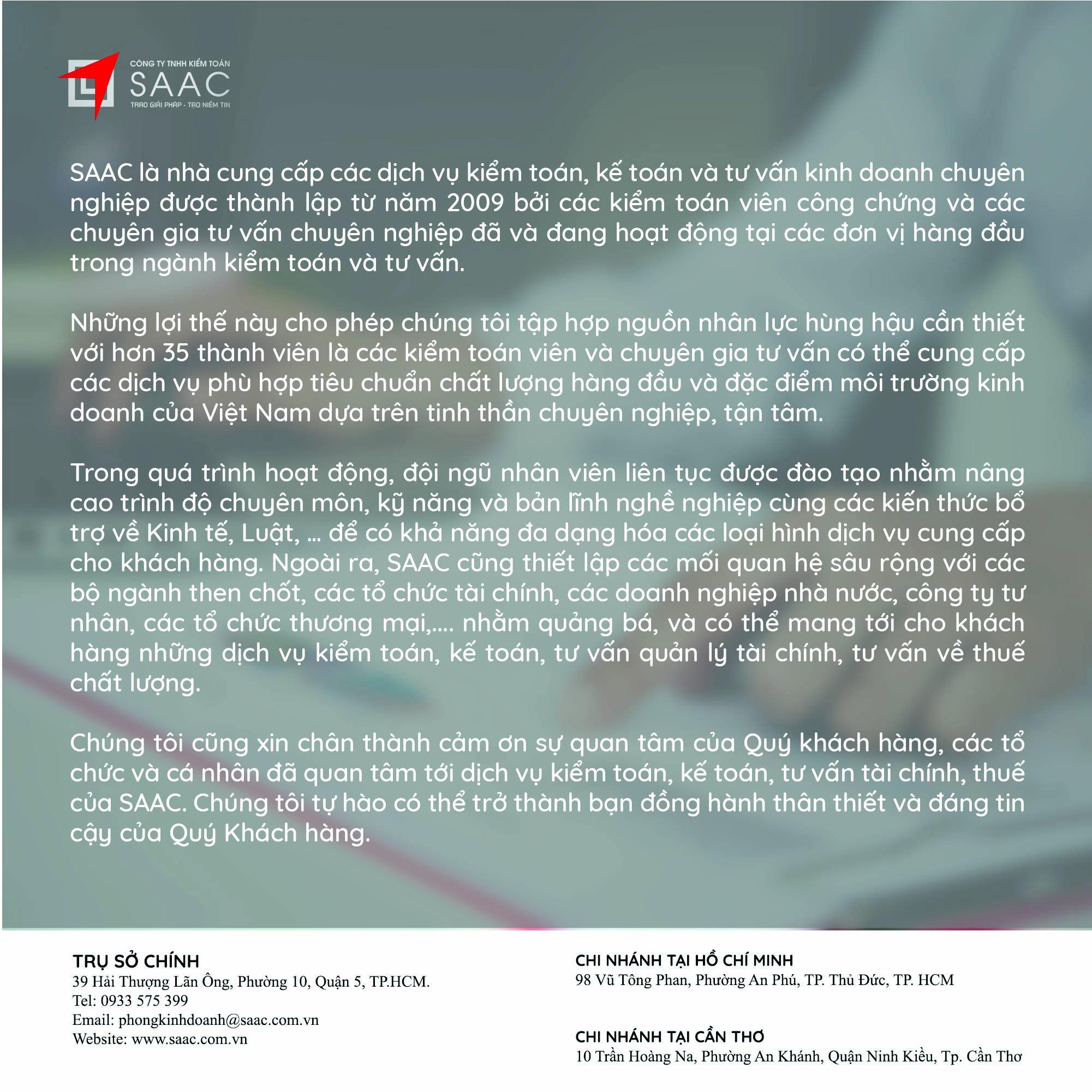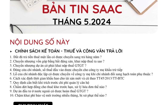Bản tin SAAC tháng này cập nhật các chính sách về việc Đóng cửa chi nhánh, số thuế đầu vào được chuyển cho công ty mẹ khấu trừ tiếp, Cách xác định thời gian khấu hao cho tài sản mới và cũ theo TT45/2013/TT-BTC, Quy định cần biết khi trích trước chi phí quản lý căn hộ,…