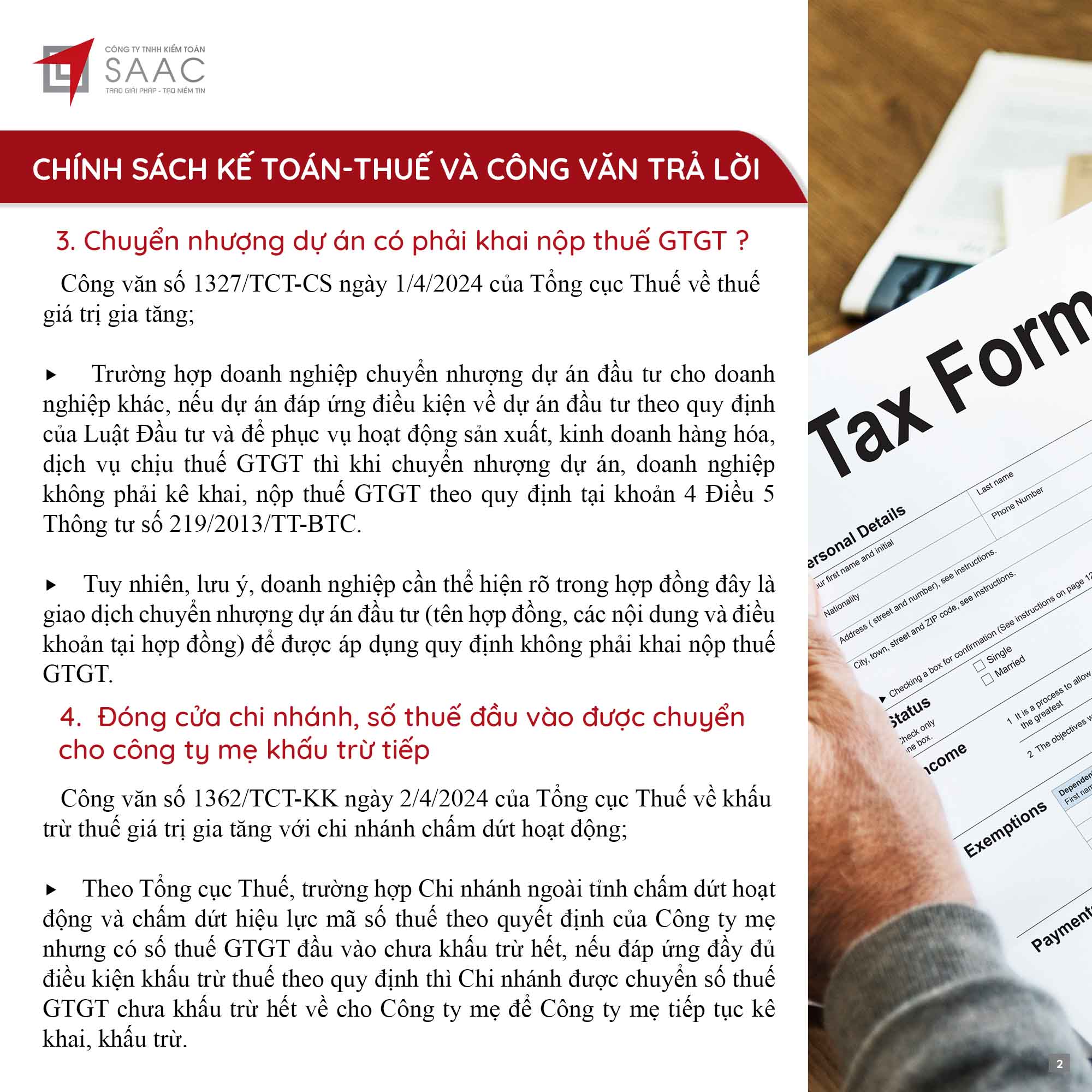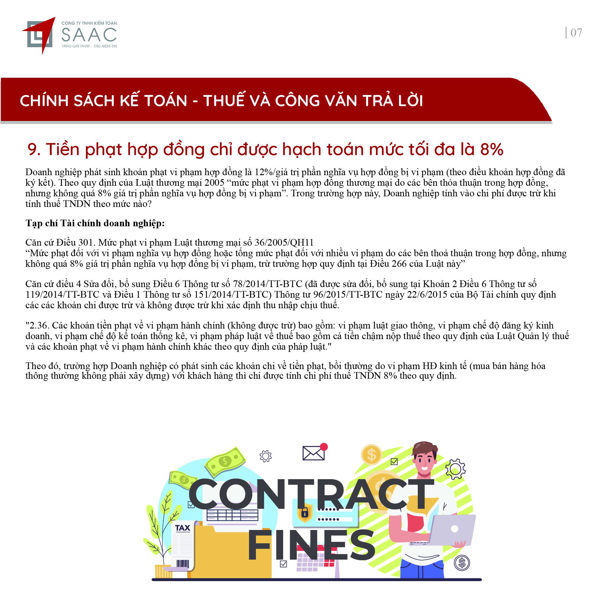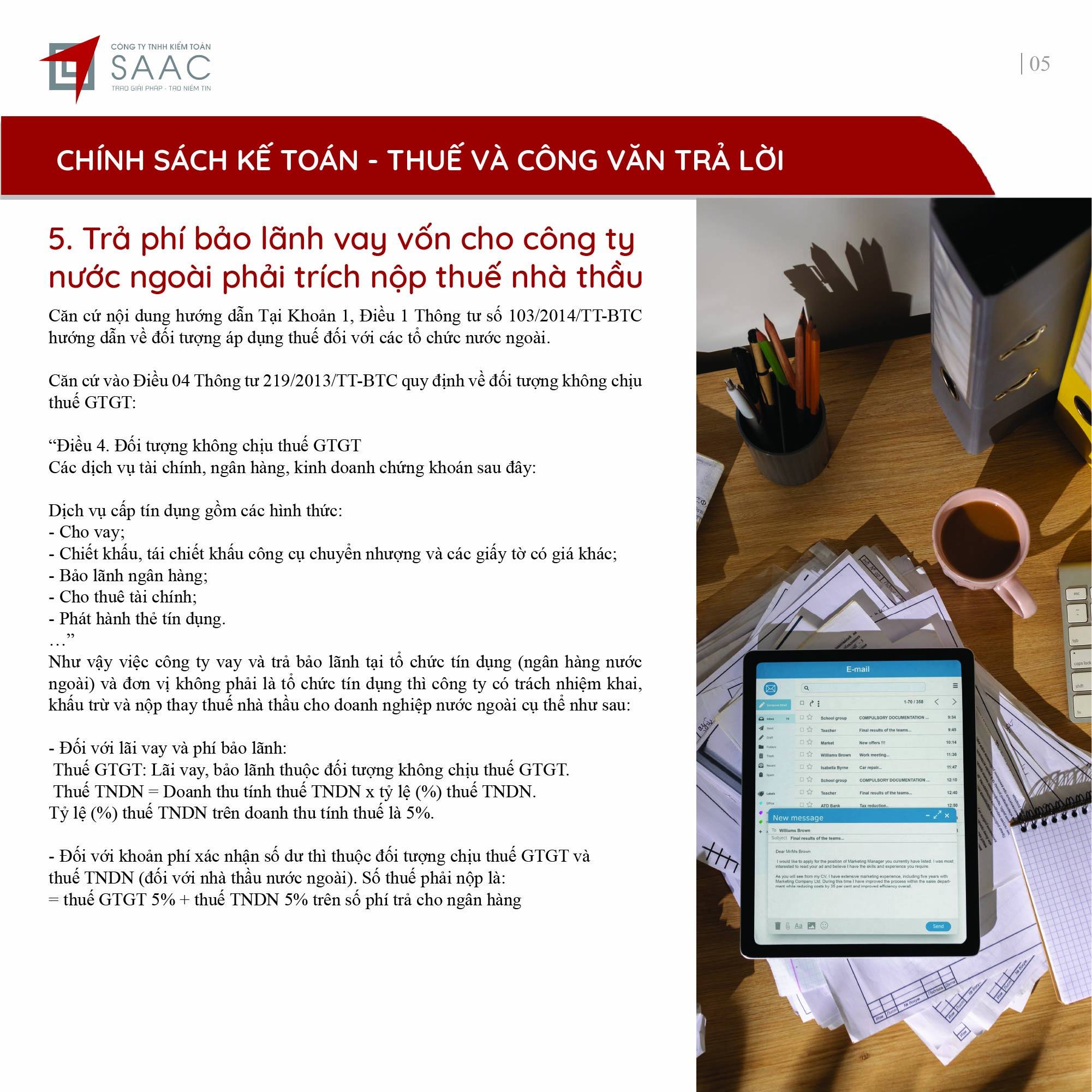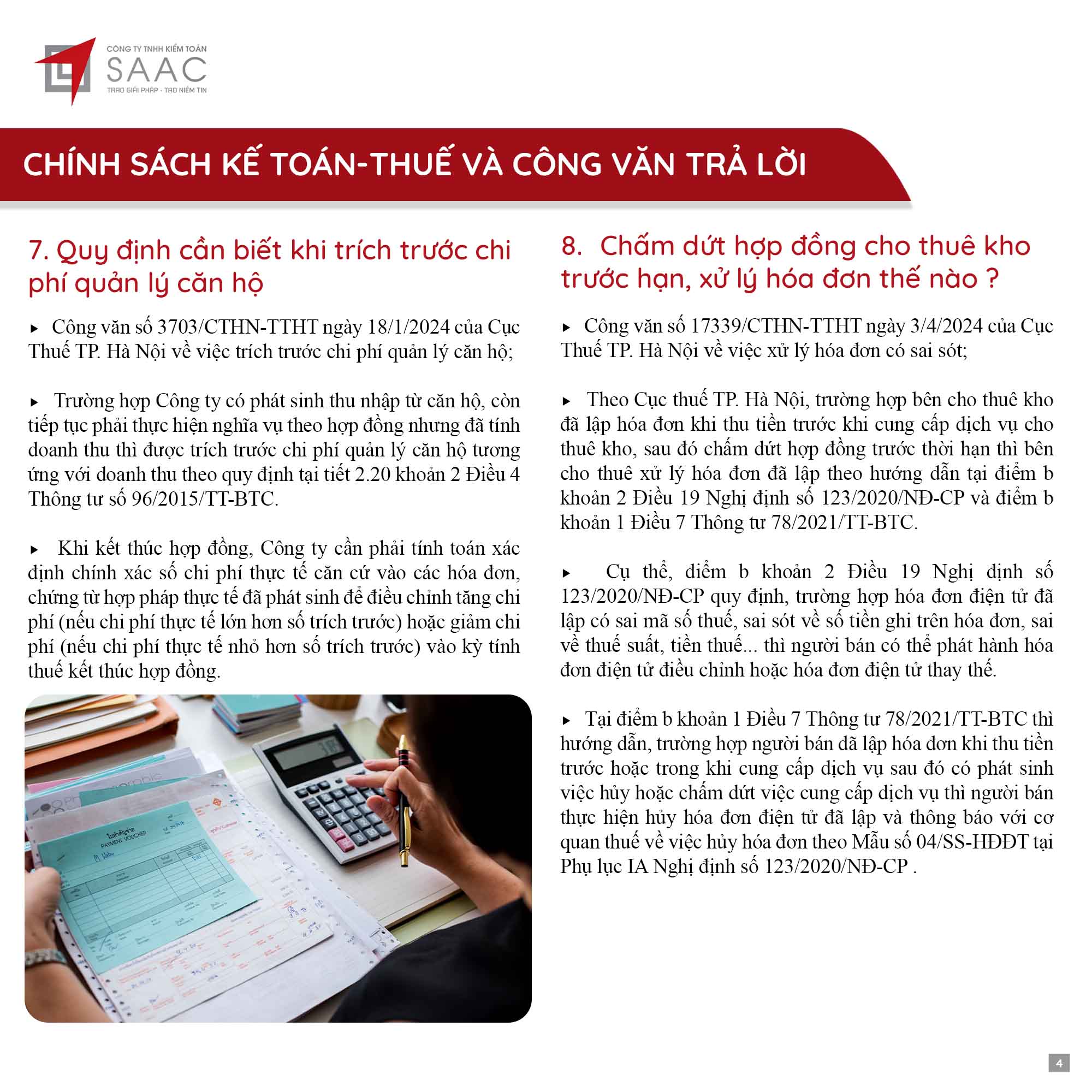 Bản tin SAAC tháng này cập nhật các chính sách về việc Đóng cửa chi nhánh, số thuế đầu vào được chuyển cho công ty mẹ khấu trừ tiếp, Cách xác định thời gian khấu hao cho tài sản mới và cũ theo TT45/2013/TT-BTC, Quy định cần biết khi trích trước chi phí quản lý căn hộ,…