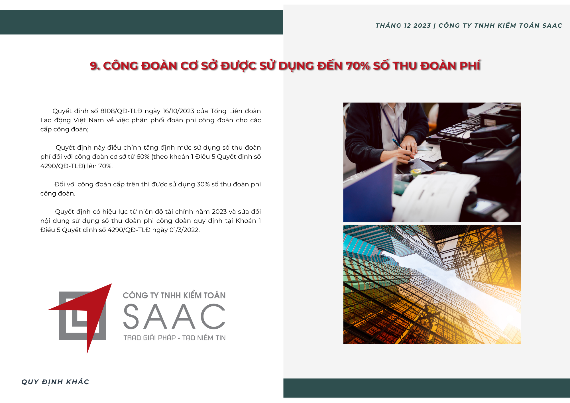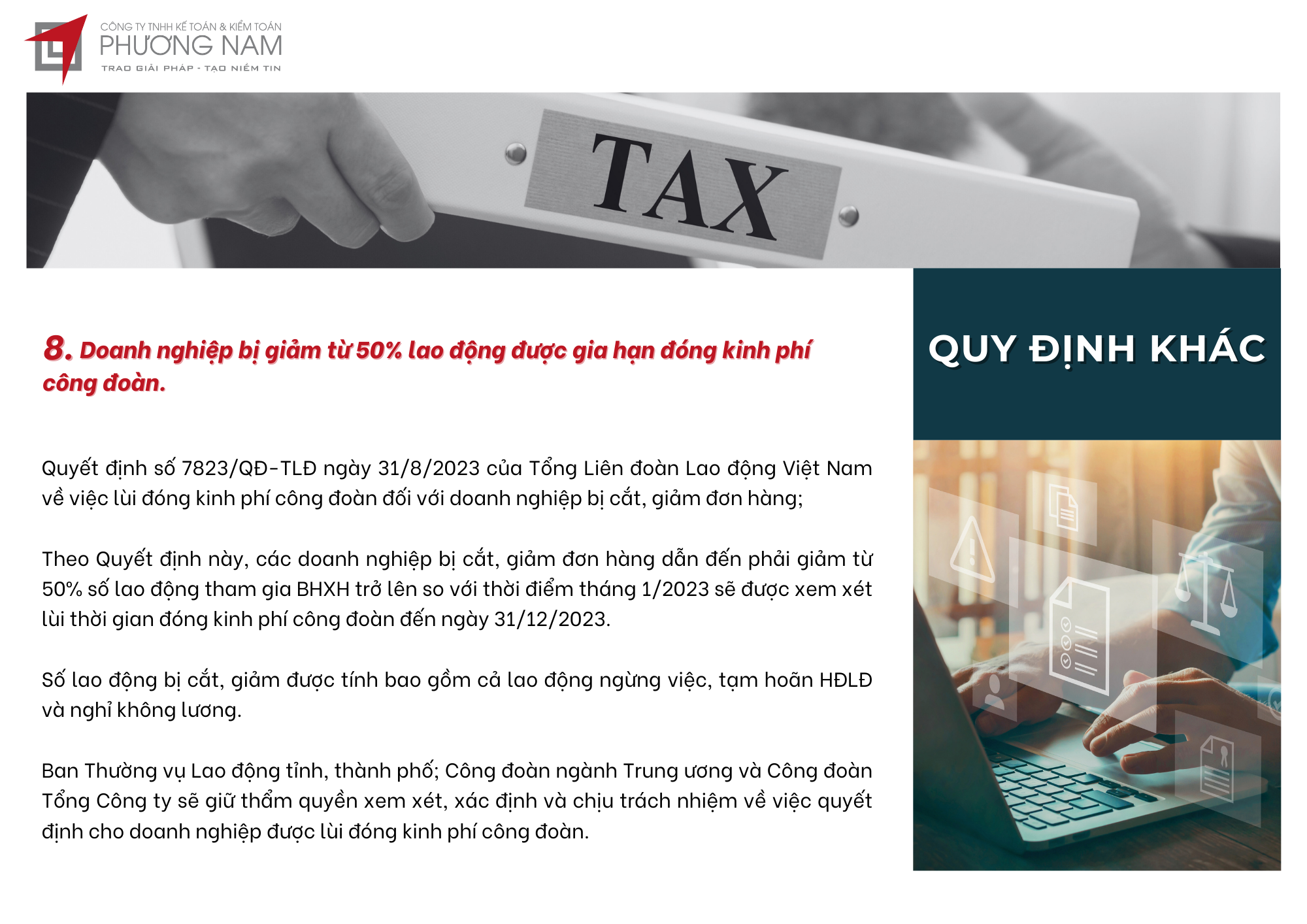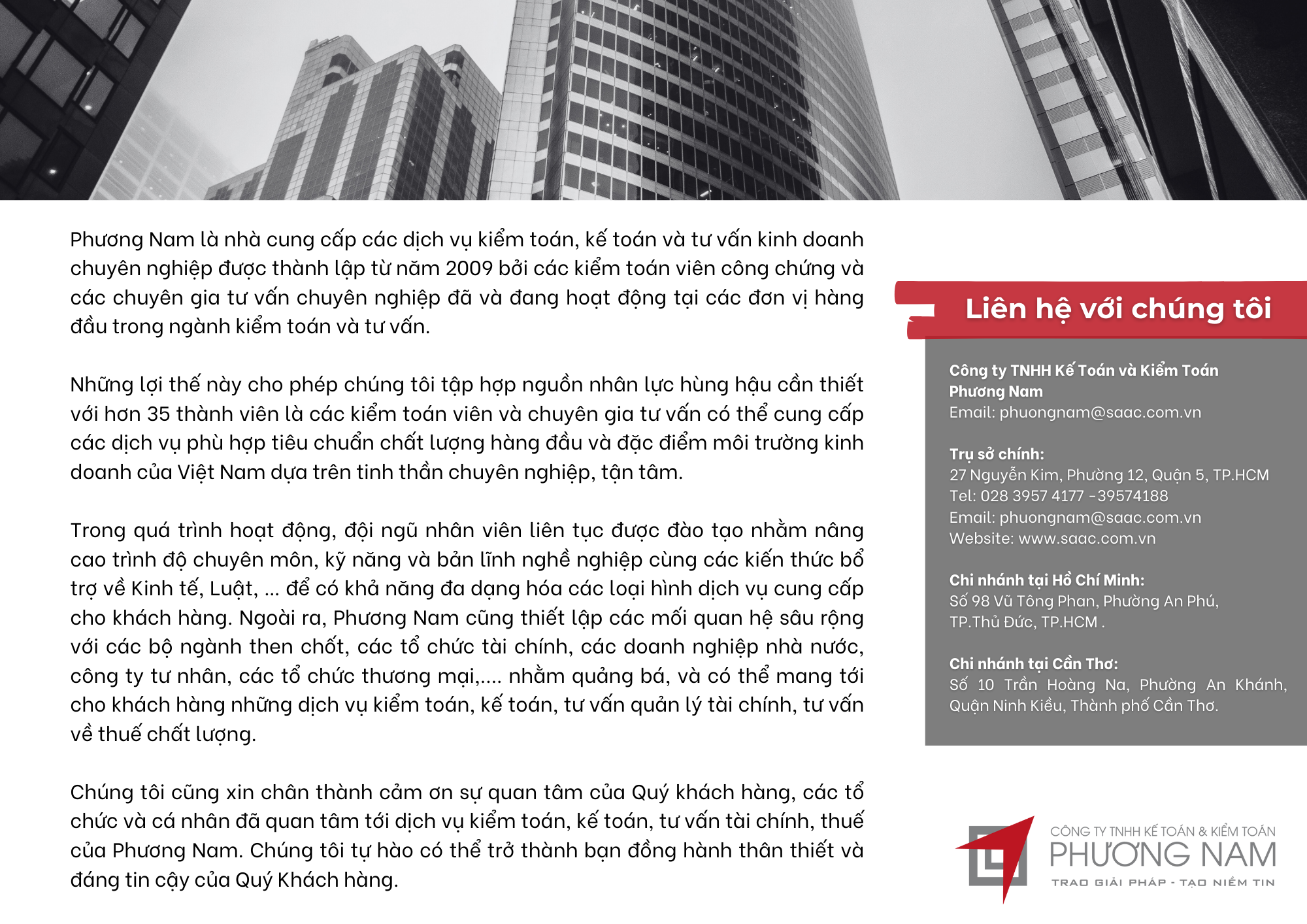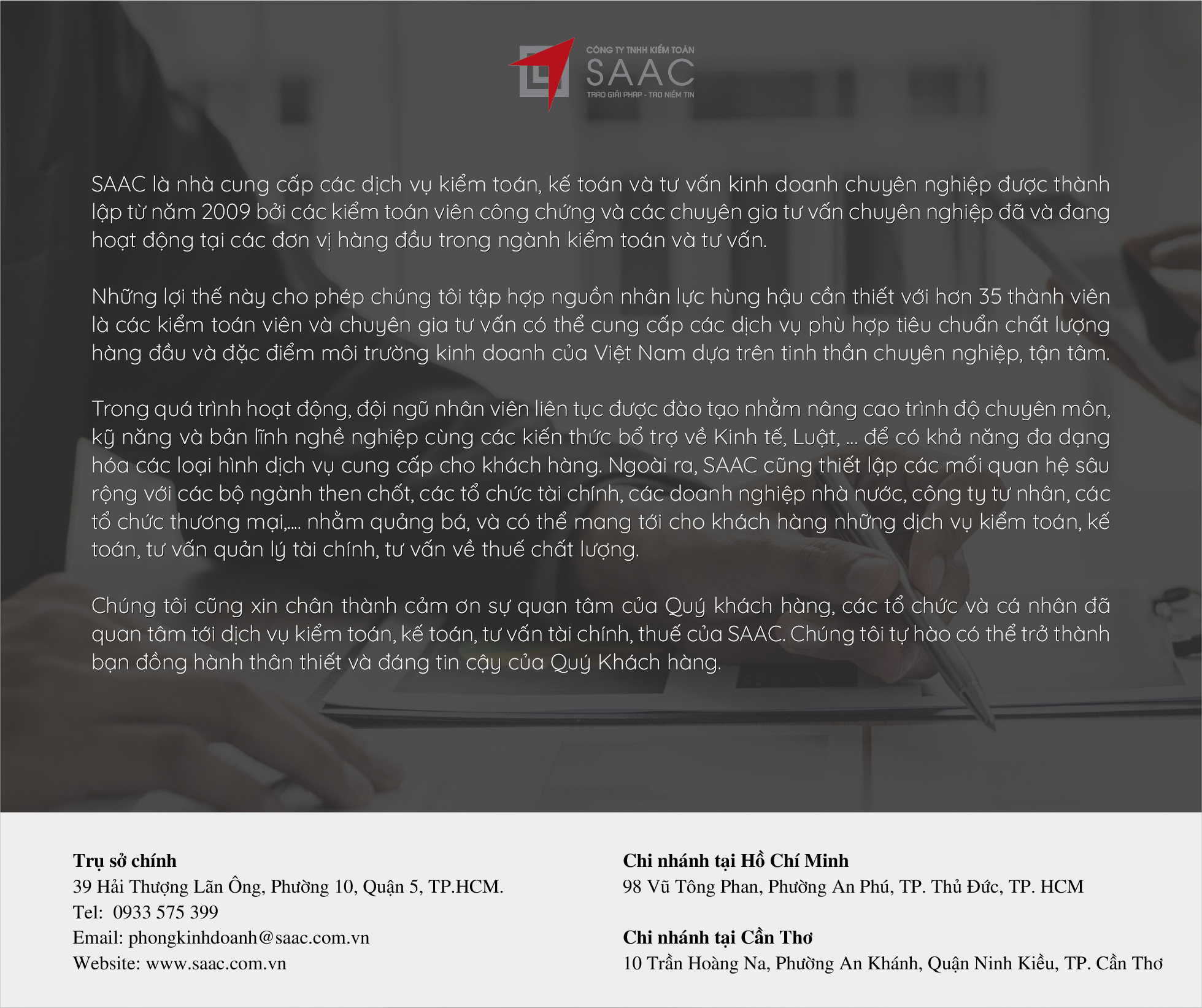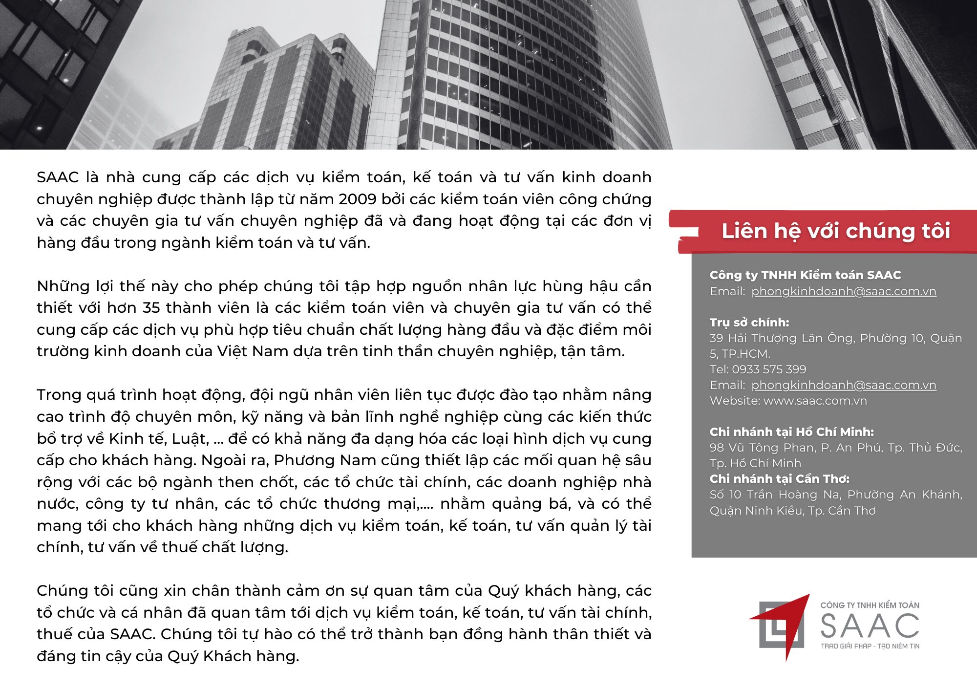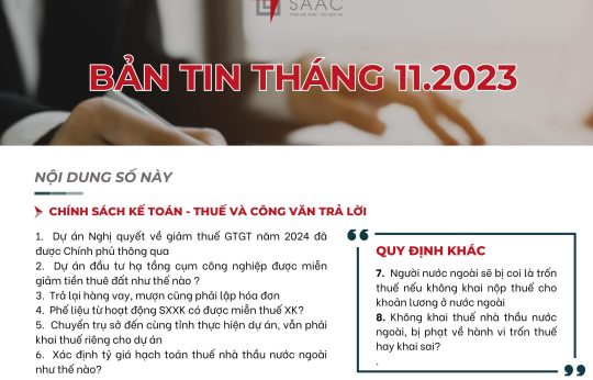 Bản tin SAAC tháng này cập nhật các chính sách vềtiếp tục giảm 2% thuế GTGT đến 30/6/2024, quy định về nộp thuế tối thiểu toàn cầu tại Việt Nam, khoản tài trợ để quảng cáo phải lập hóa đơn và nộp thuế,…