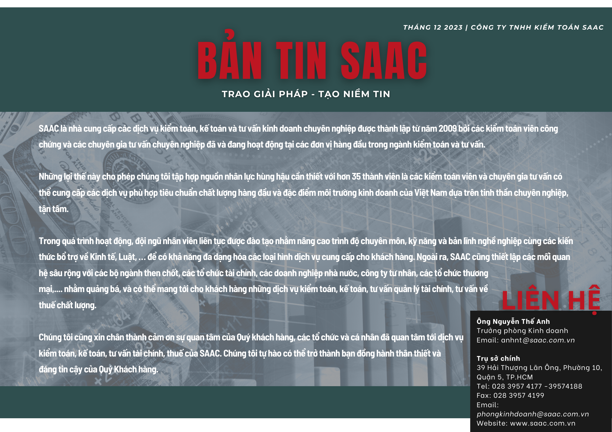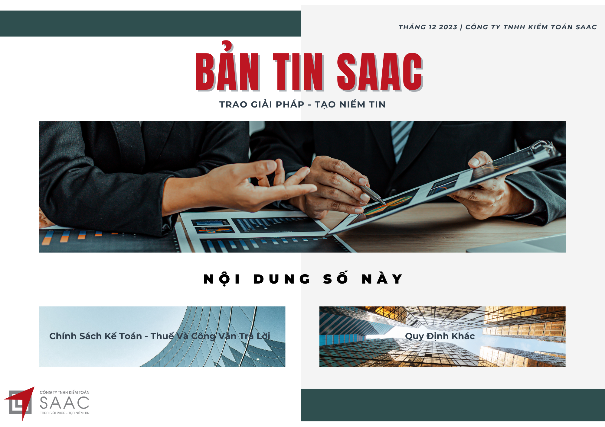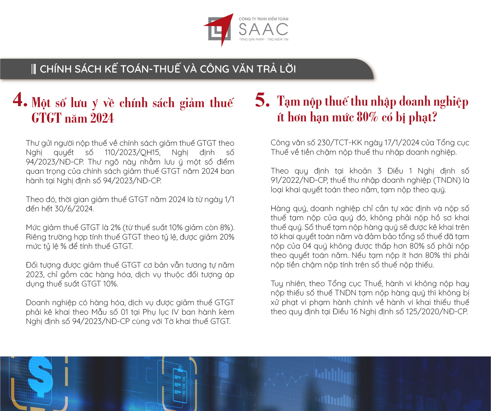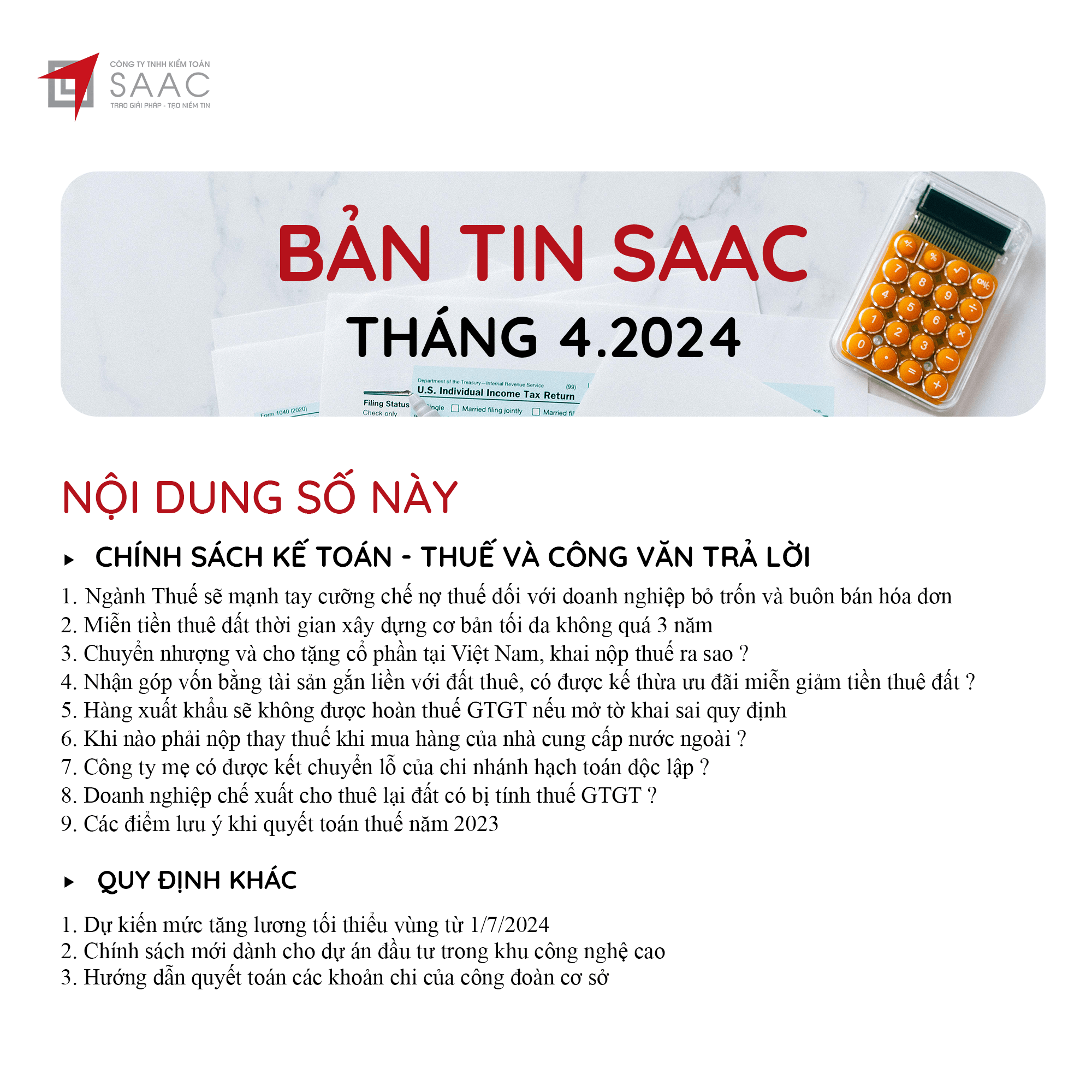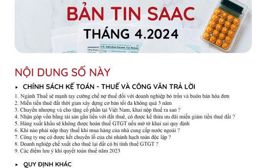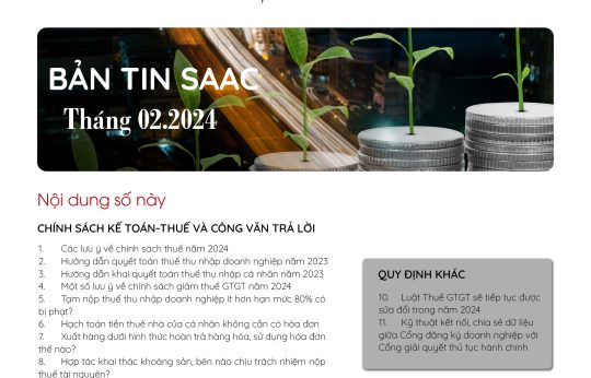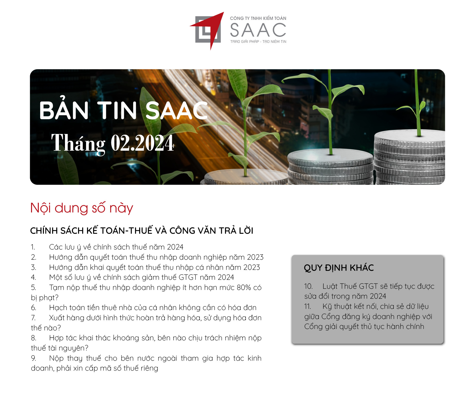 Bản tin SAAC tháng này cập nhật các lưu ý về chính sách thuế năm 2024, Hướng dẫn quyết toán thuế thu nhập doanh nghiệp và thu nhập cá nhân năm 2023, Một số lưu ý về chính sách giảm thuế GTGT năm 2024,..