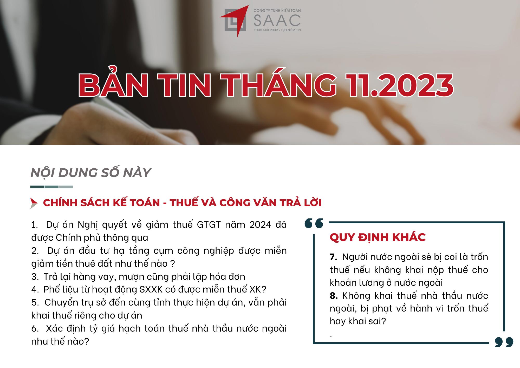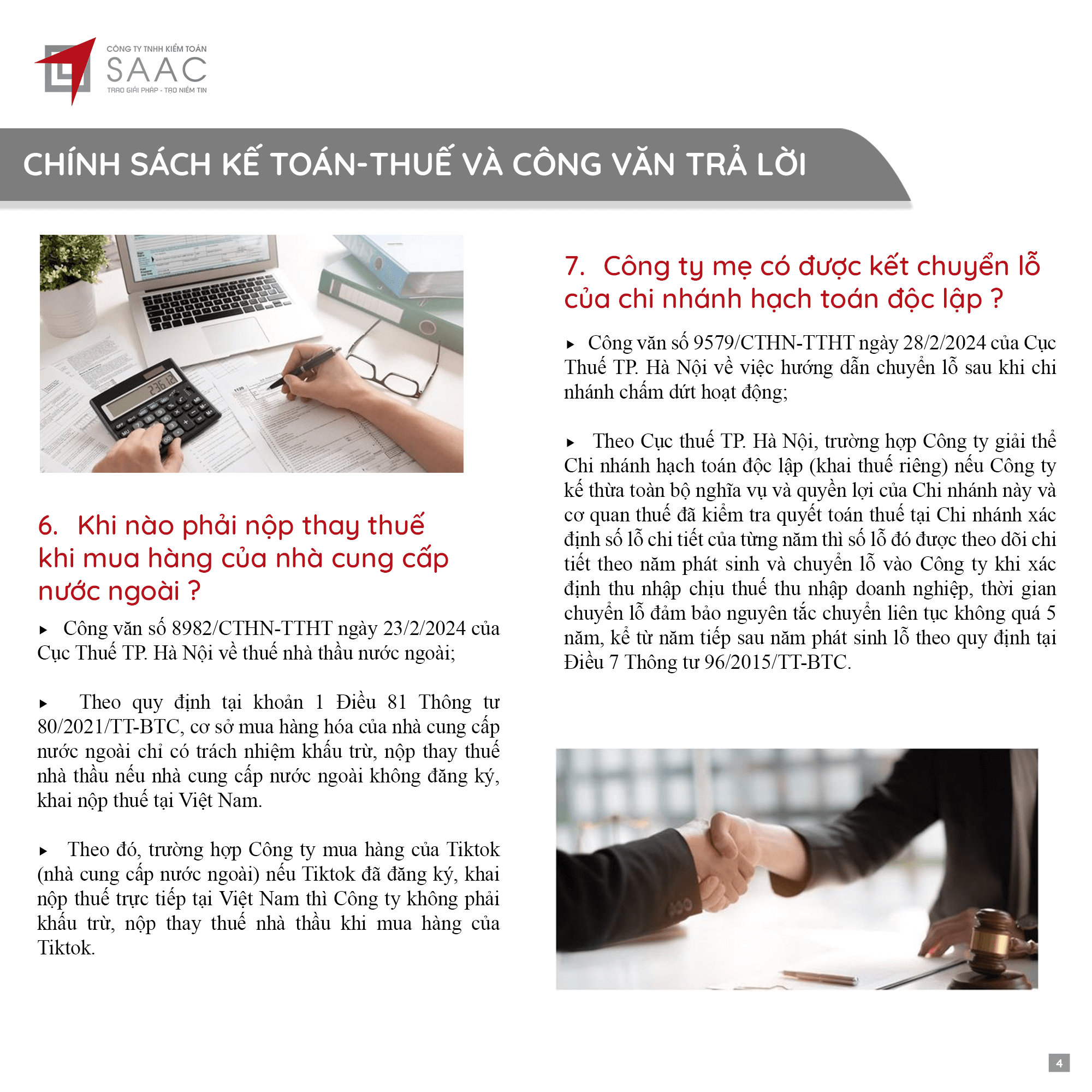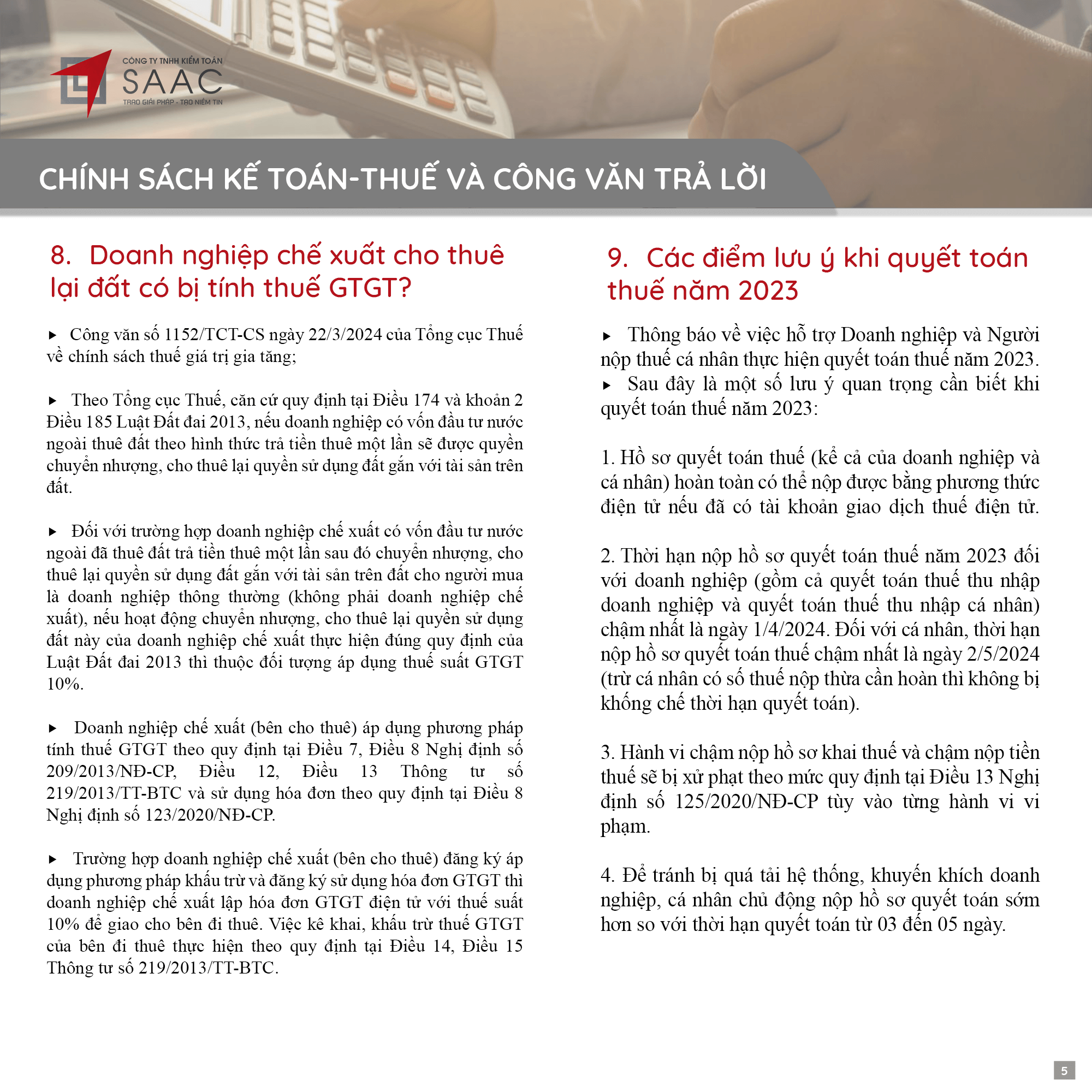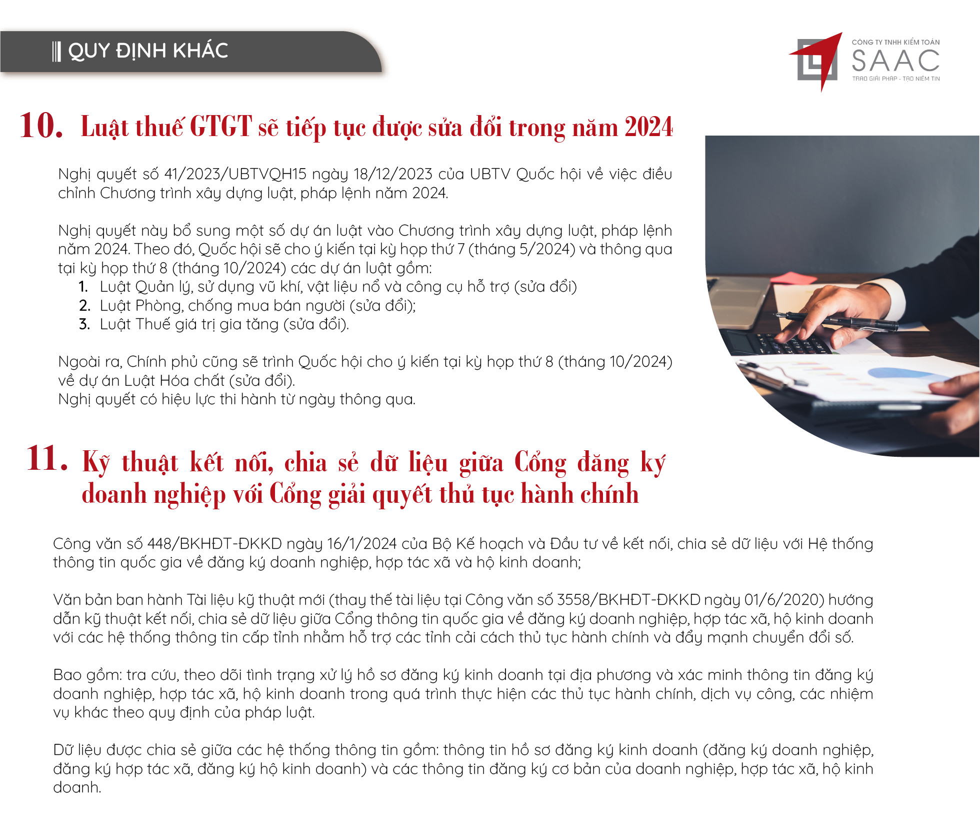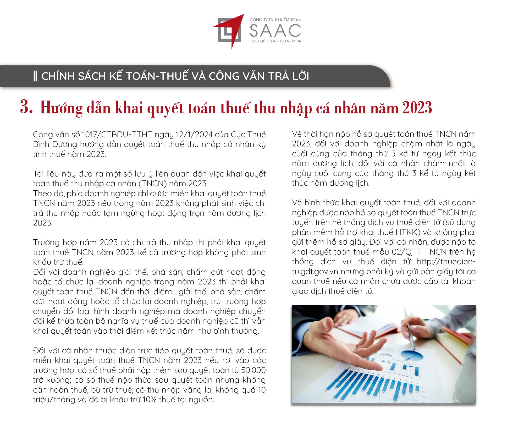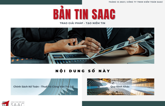 Bản tin SAAC tháng này cập nhật các lưu ý về chính sách thuế năm 2024, Hướng dẫn quyết toán thuế thu nhập doanh nghiệp và thu nhập cá nhân năm 2023, Một số lưu ý về chính sách giảm thuế GTGT năm 2024,..