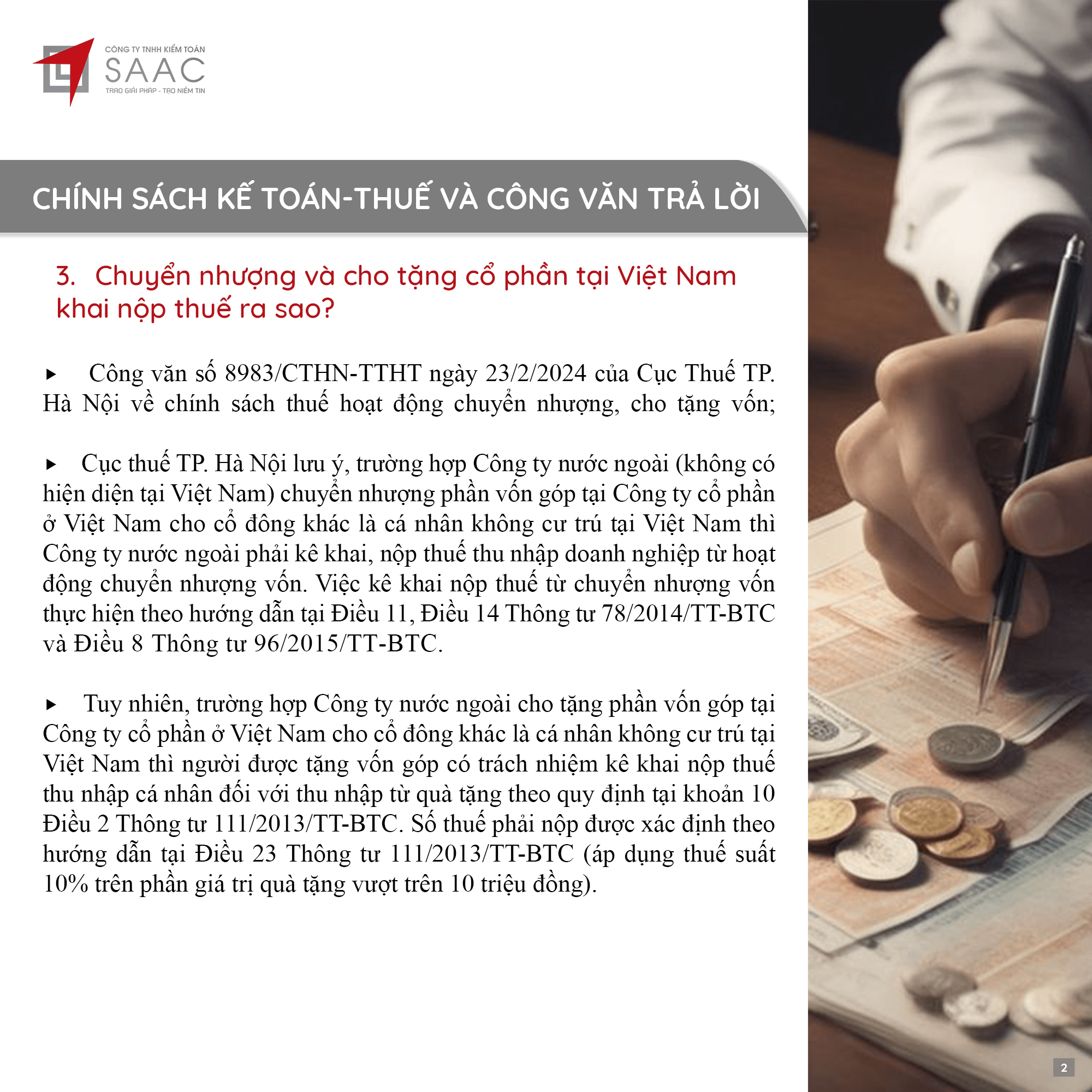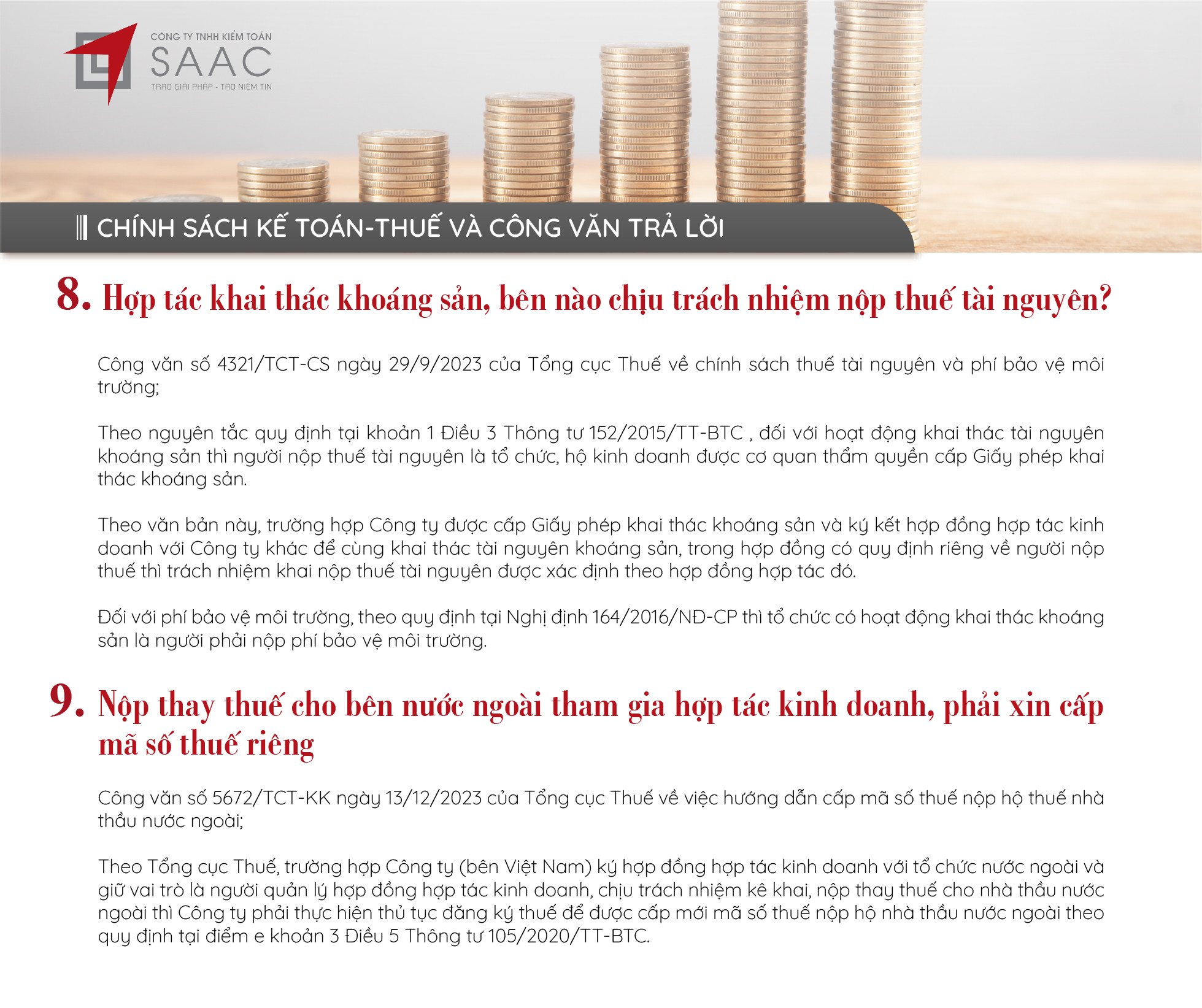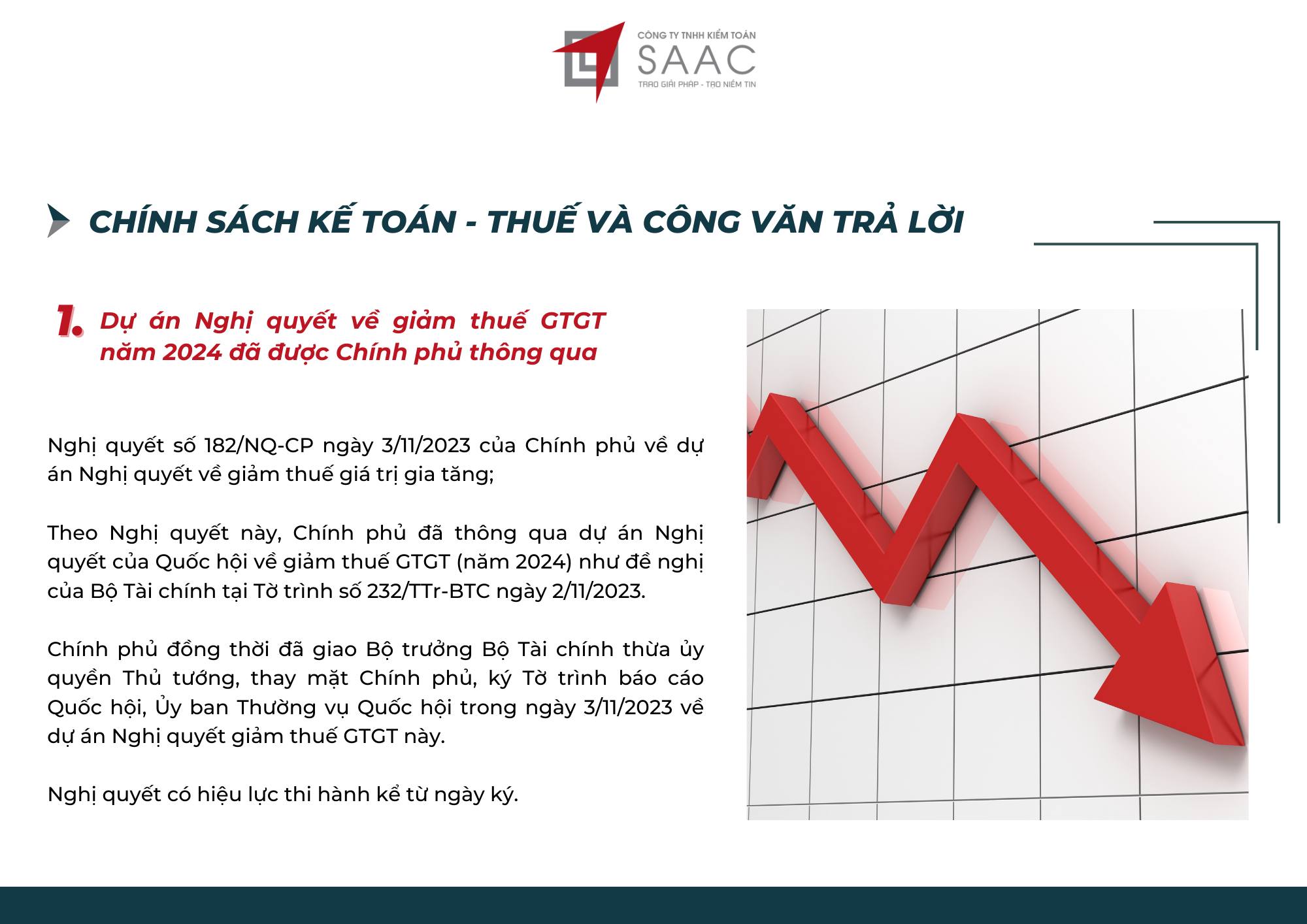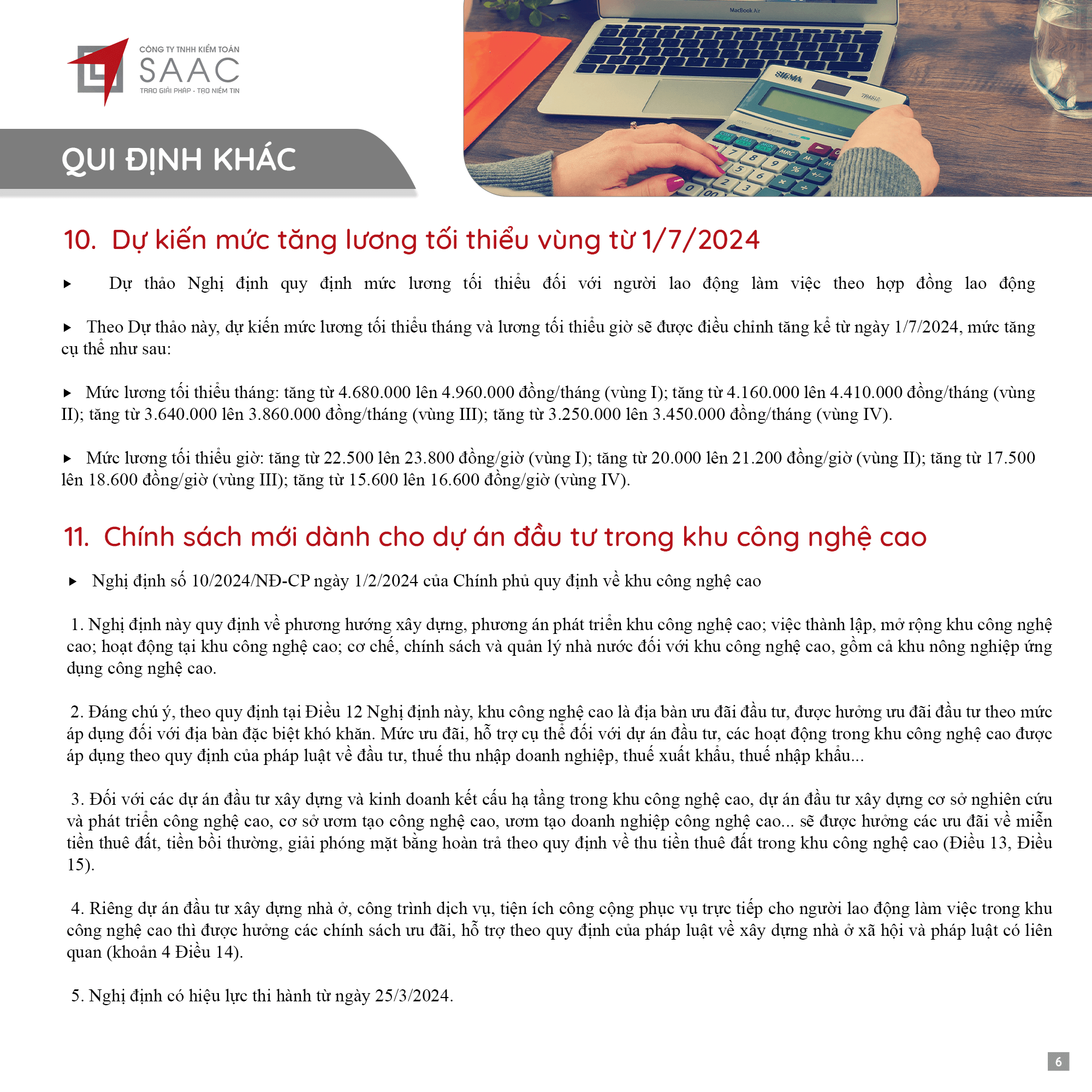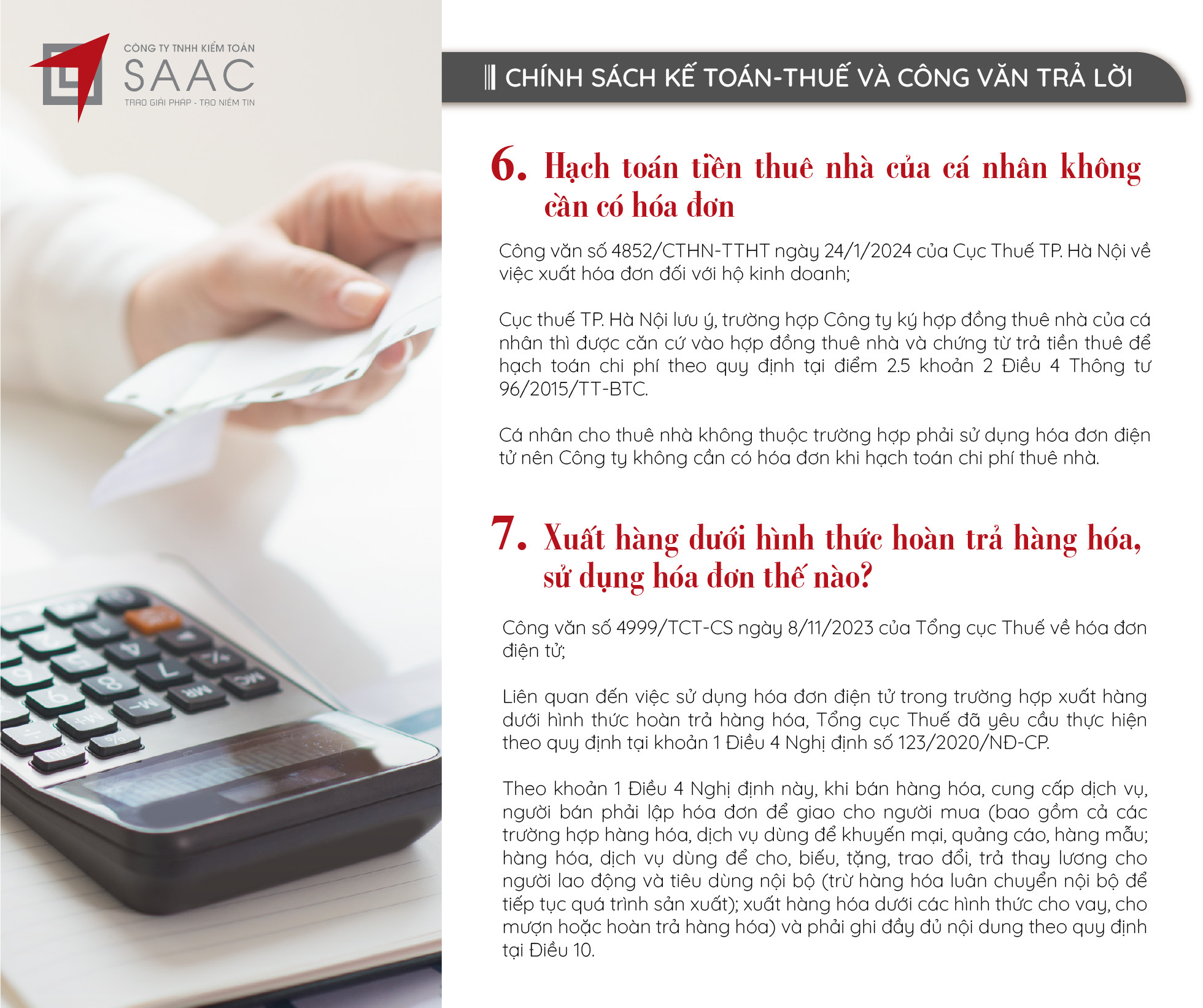 Bản tin SAAC tháng này cập nhật các lưu ý về chính sách thuế năm 2024, Hướng dẫn quyết toán thuế thu nhập doanh nghiệp và thu nhập cá nhân năm 2023, Một số lưu ý về chính sách giảm thuế GTGT năm 2024,..