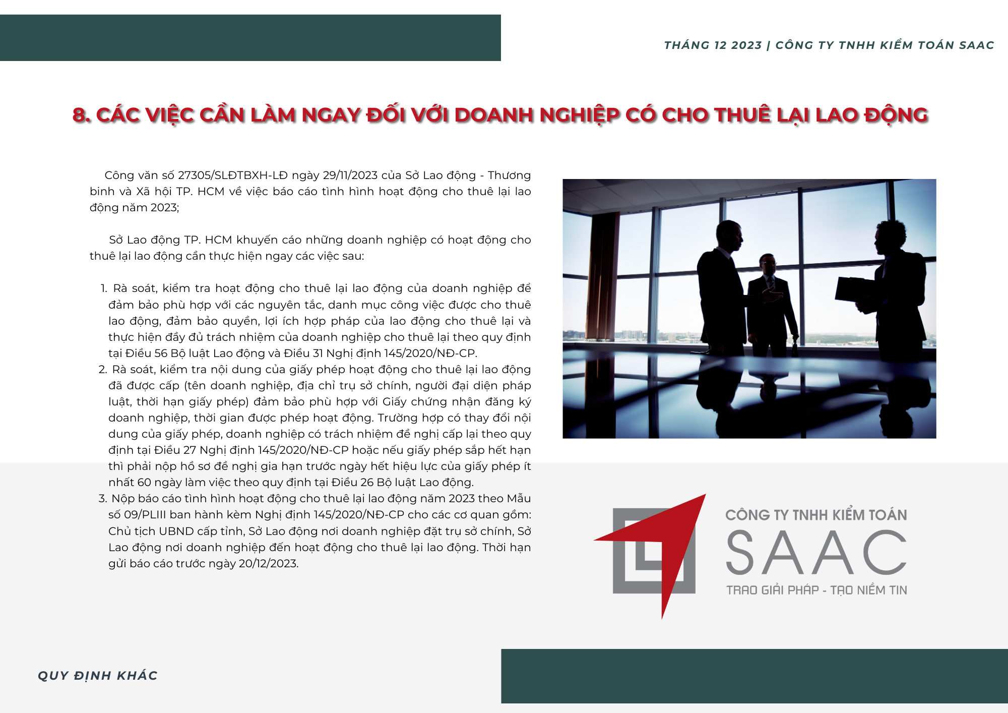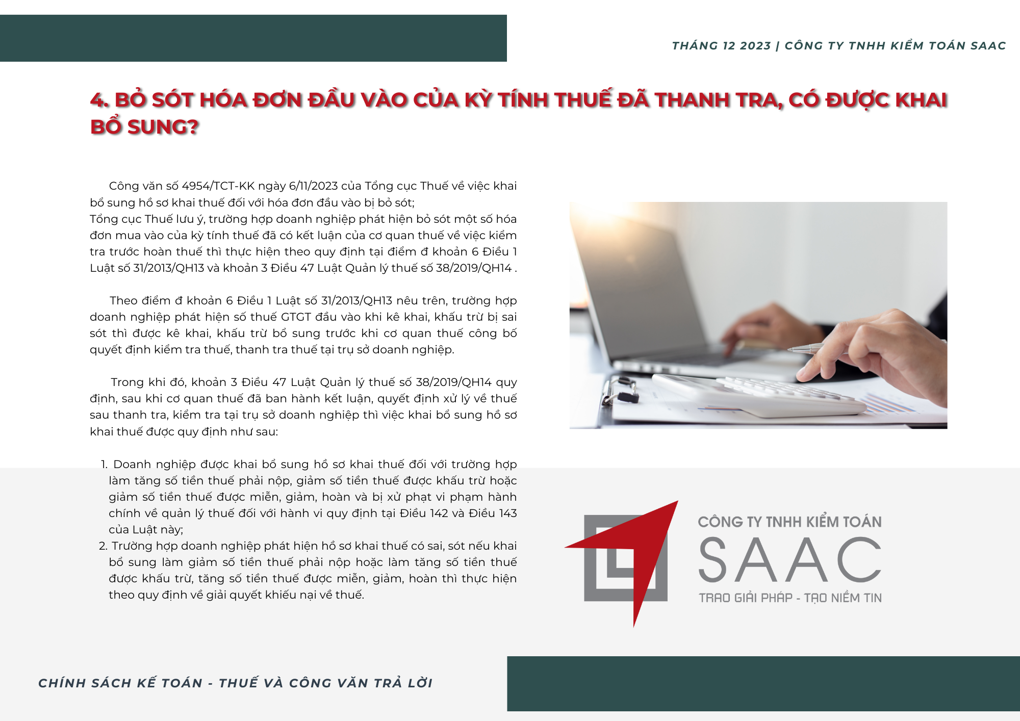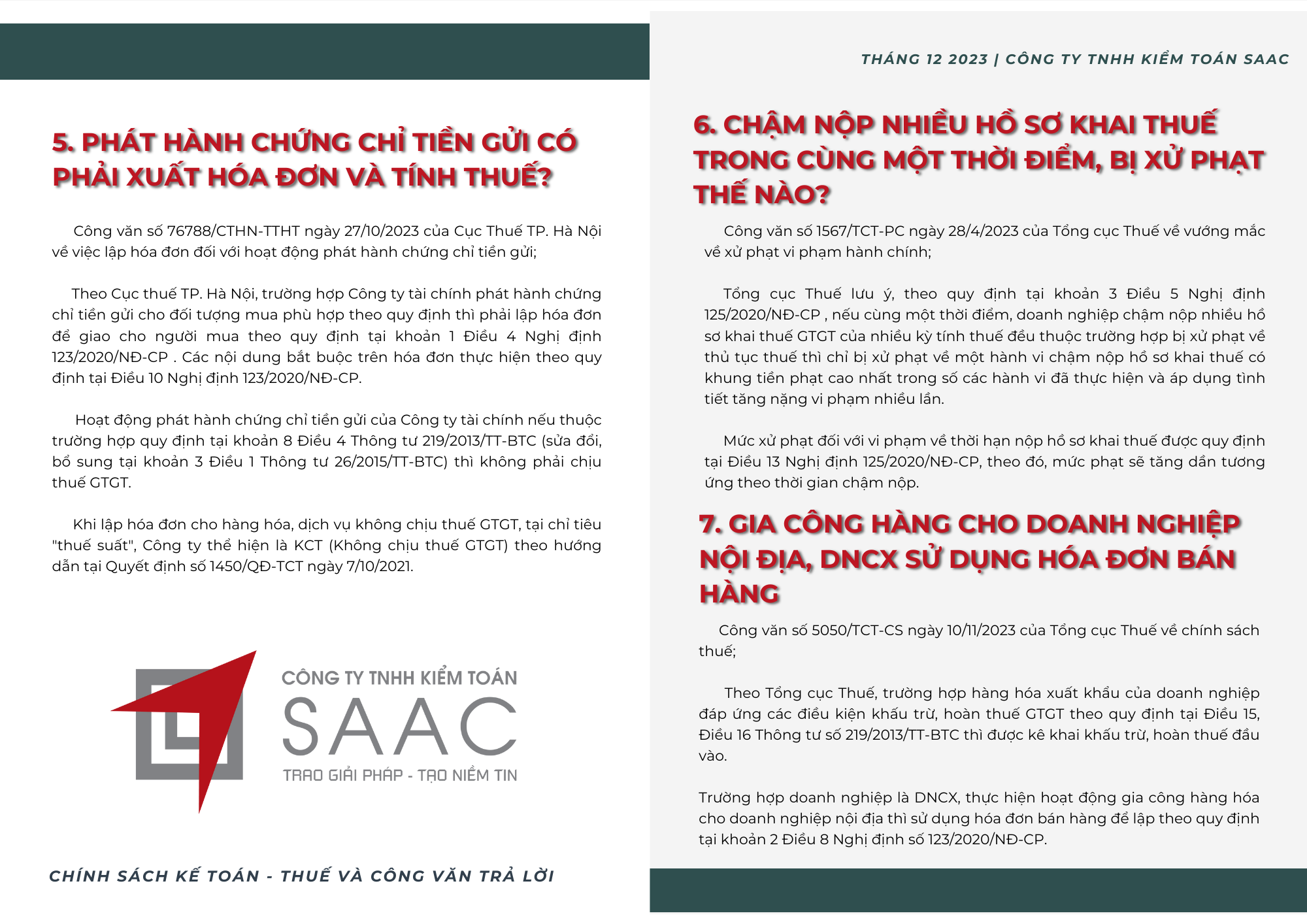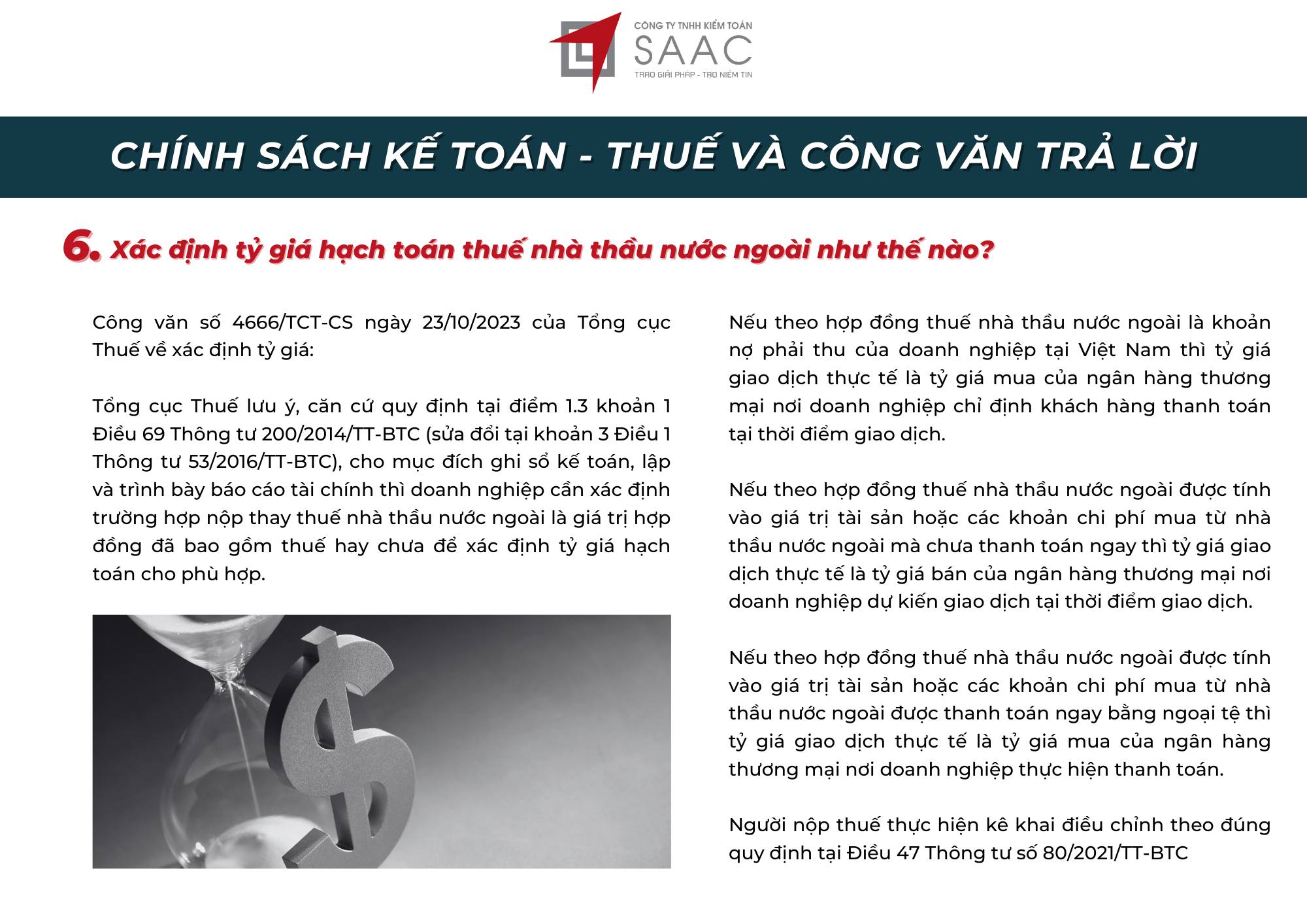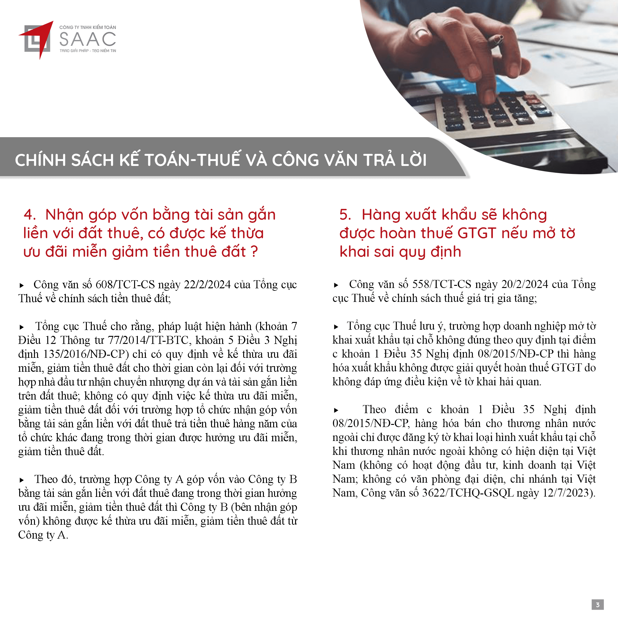 Bản tin SAAC tháng này cập nhật các lưu ý về chính sách thuế năm 2024, Hướng dẫn quyết toán thuế thu nhập doanh nghiệp và thu nhập cá nhân năm 2023, Một số lưu ý về chính sách giảm thuế GTGT năm 2024,..