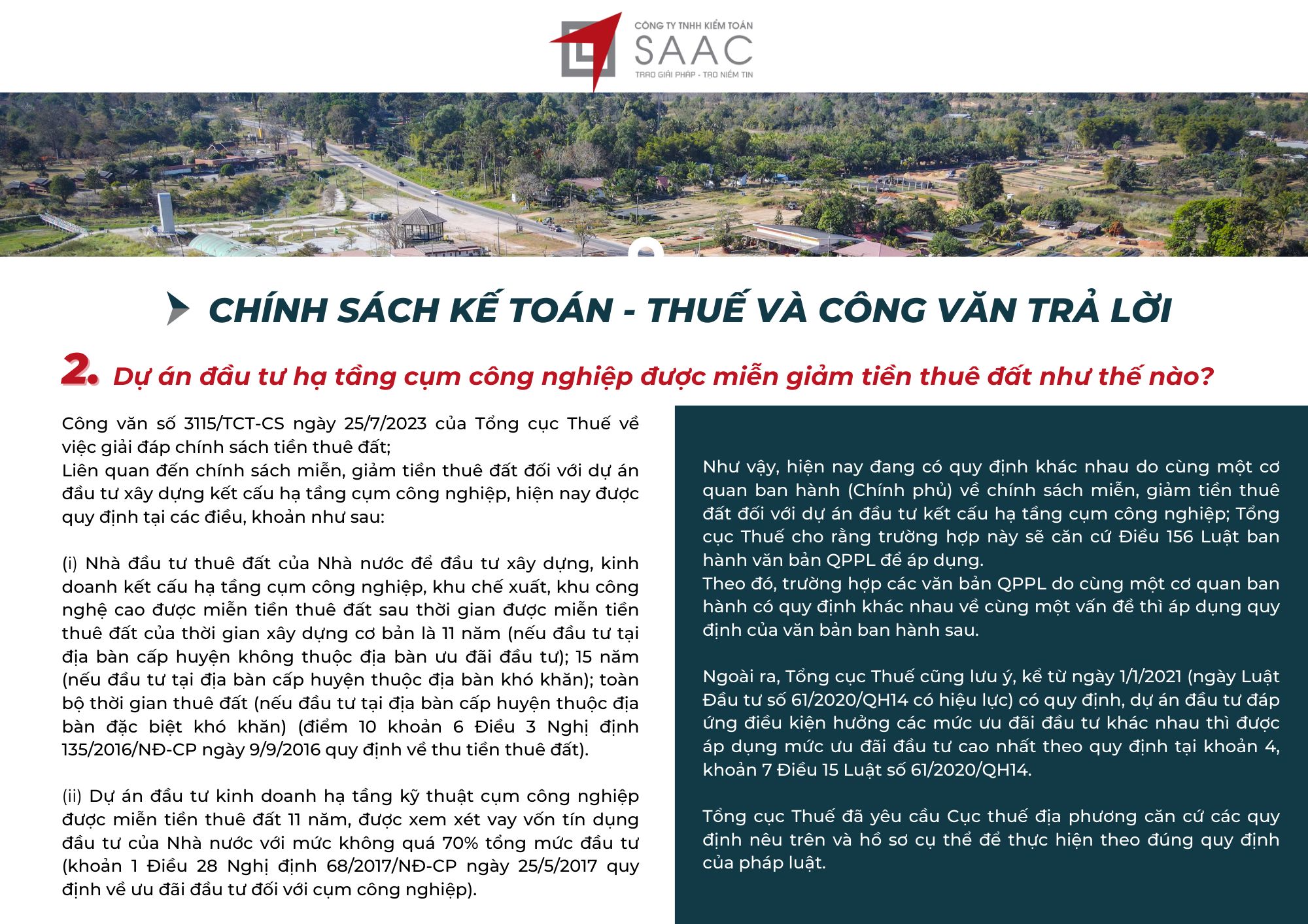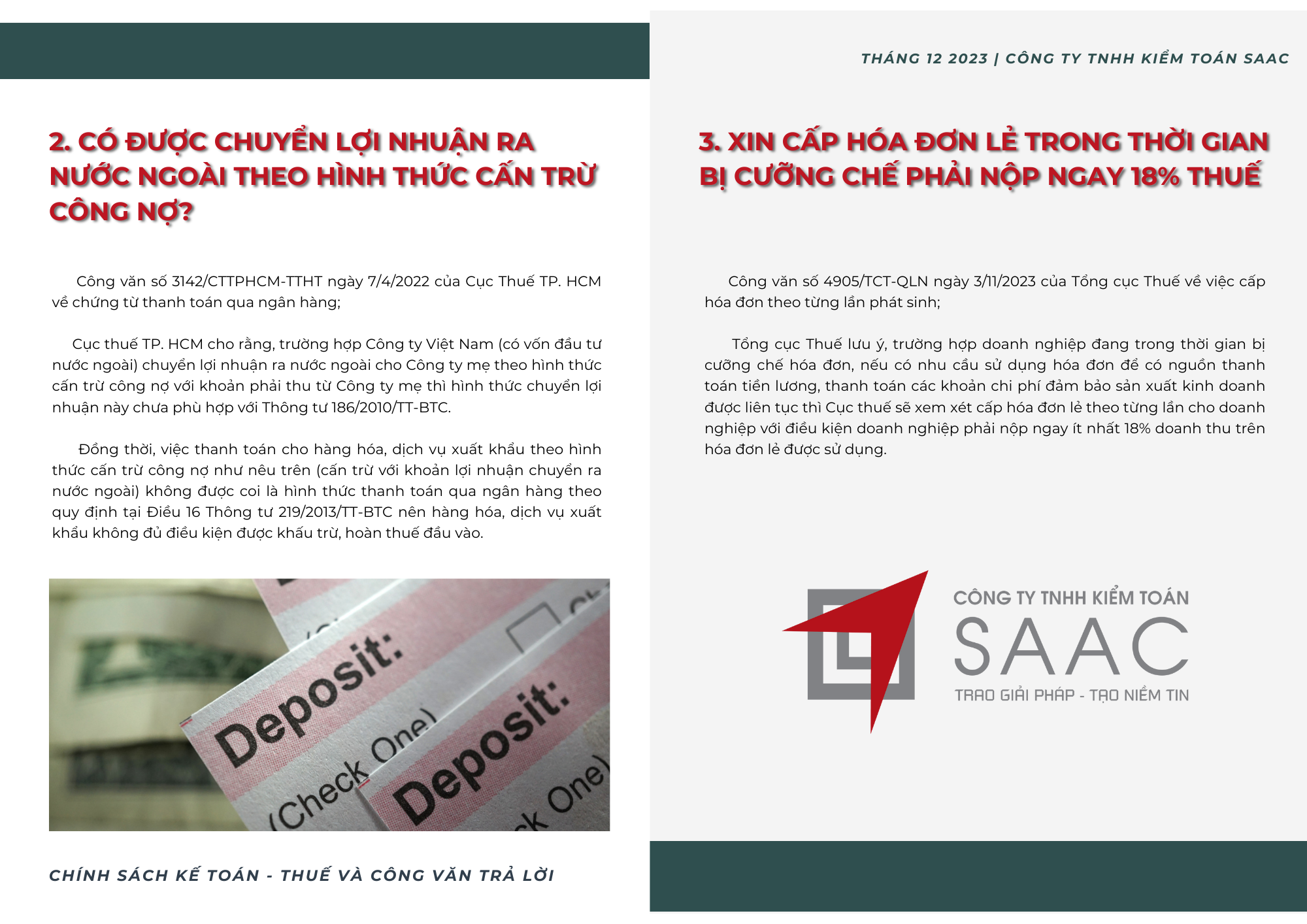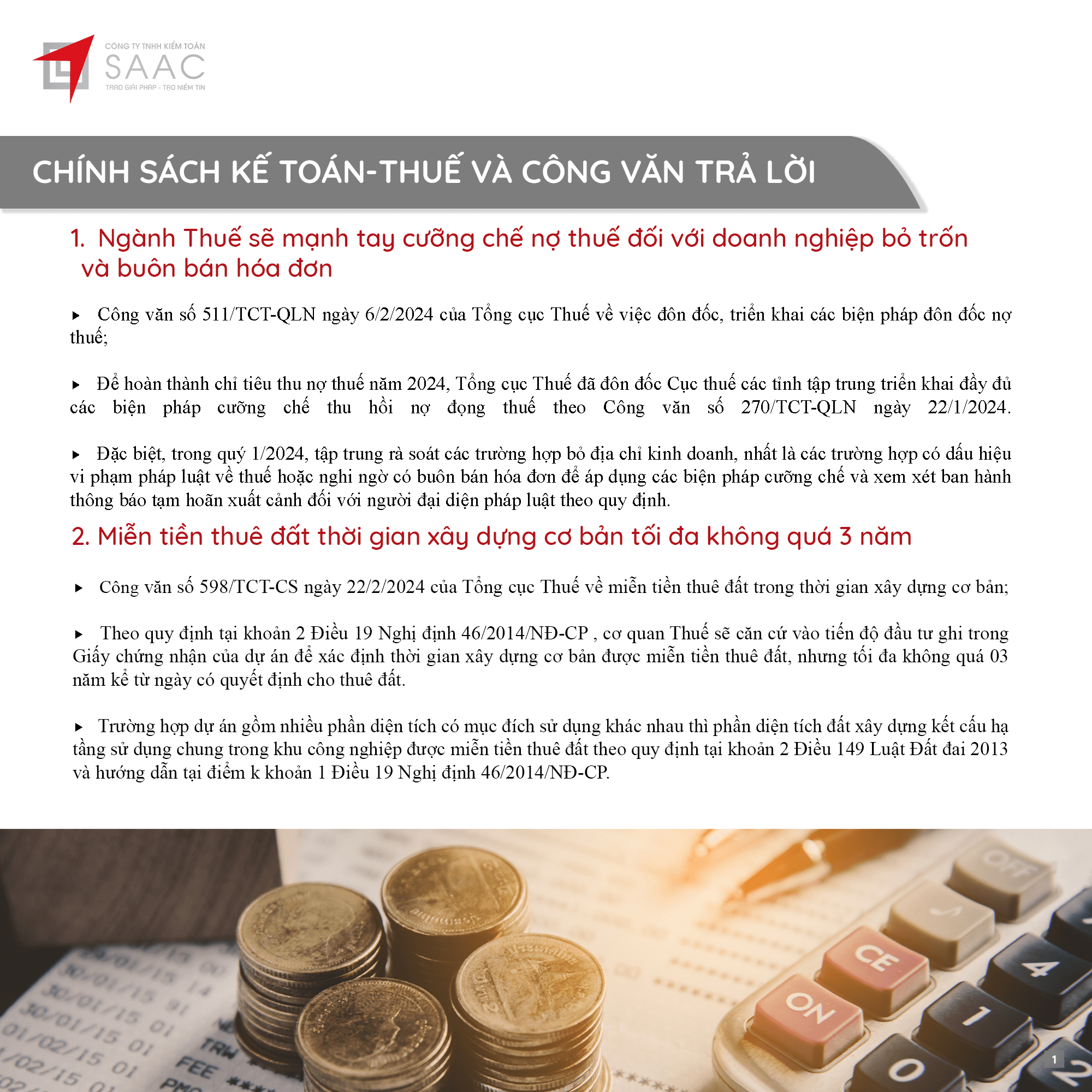 Bản tin SAAC tháng này cập nhật các lưu ý về ngành Thuế sẽ mạnh tay cưỡng chế nợ thuế đối với doanh nghiệp bỏ trốn và buôn bán hóa đơn, Miễn tiền thuê đất thời gian xây dựng cơ bản tối đa không quá 3 năm, Các điểm lưu ý khi quyết toán thuế năm 2023,…