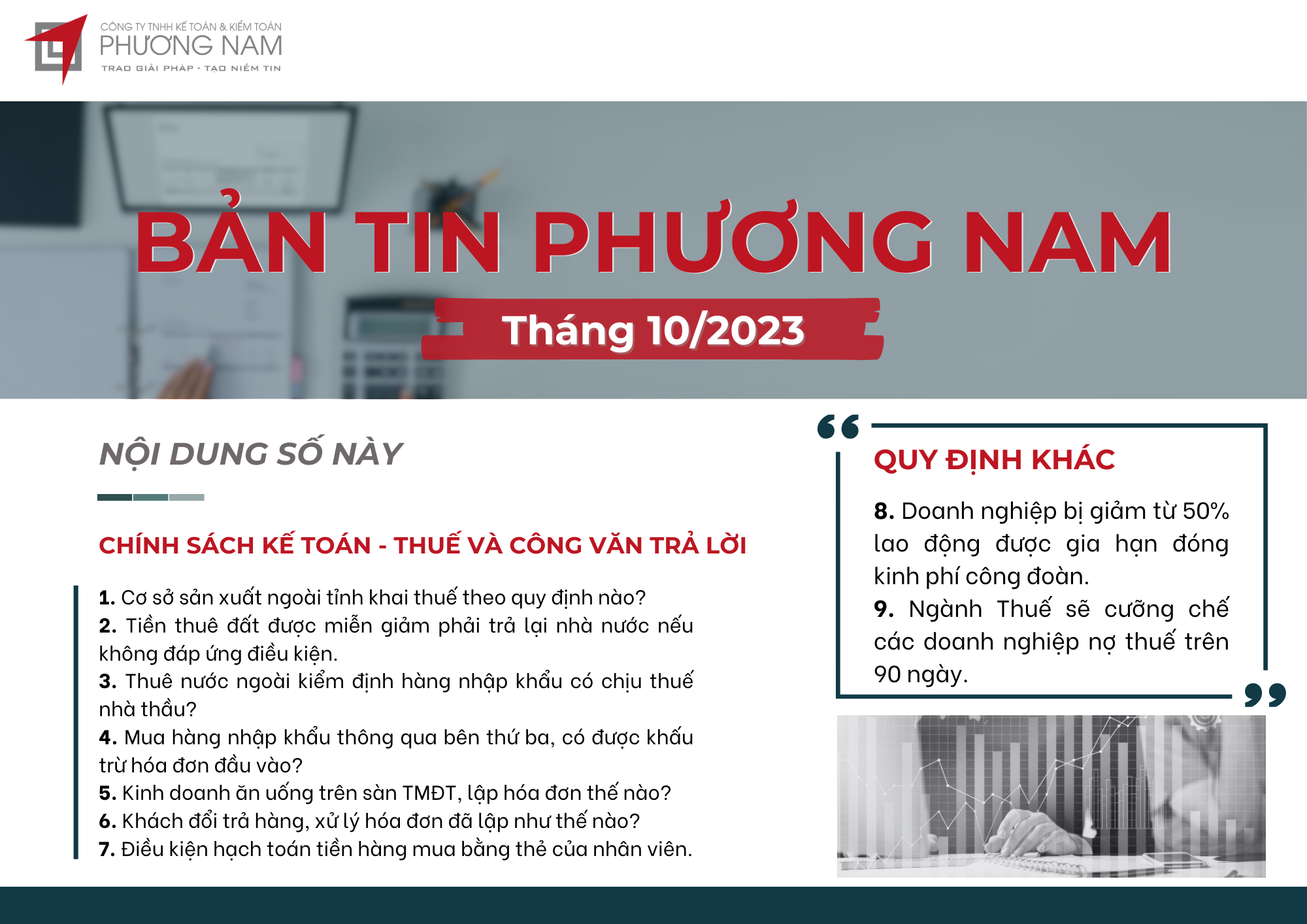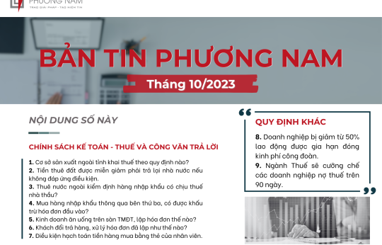 Bản tin Phương Nam tháng này cập nhật các chính sách về điều kiện hưởng ưu đãi thuế đối với dự án đầu tư mở rộng, hàng xuất khẩu phải lập hóa đơn khi làm xong thủ tục hải quan, cách lập hóa đơn điện tử trong thời gian bị cưỡng chế