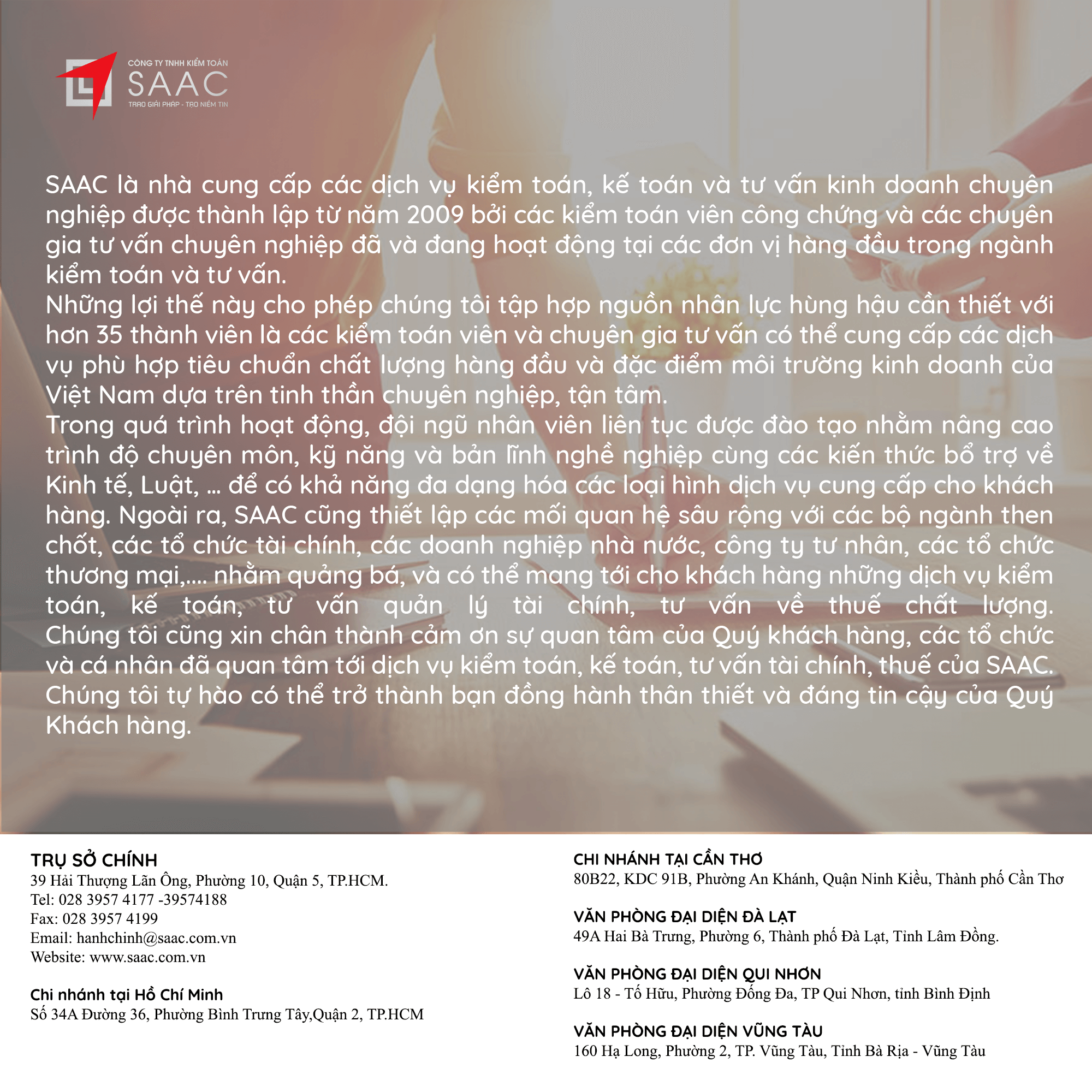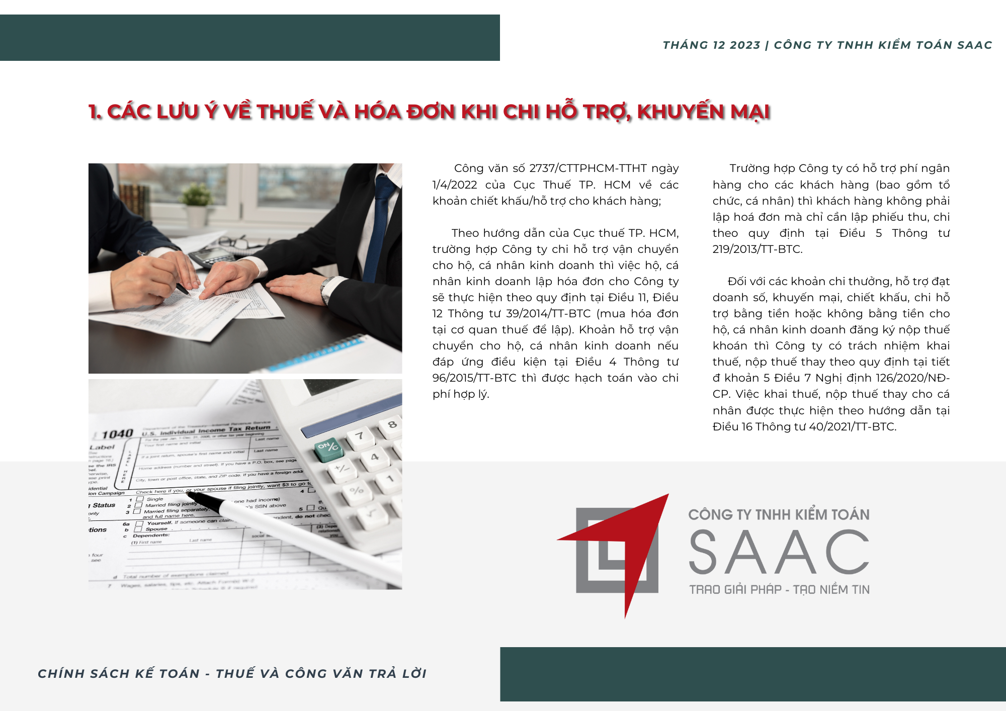 Bản tin SAAC tháng này cập nhật các chính sách về các lưu ý về thuế và hóa đơn khi chi hỗ trợ, khuyến mại,. xin cấp hóa đơn lẻ trong thời gian bị cưỡng chế phải nộp ngay 18% thuế,…