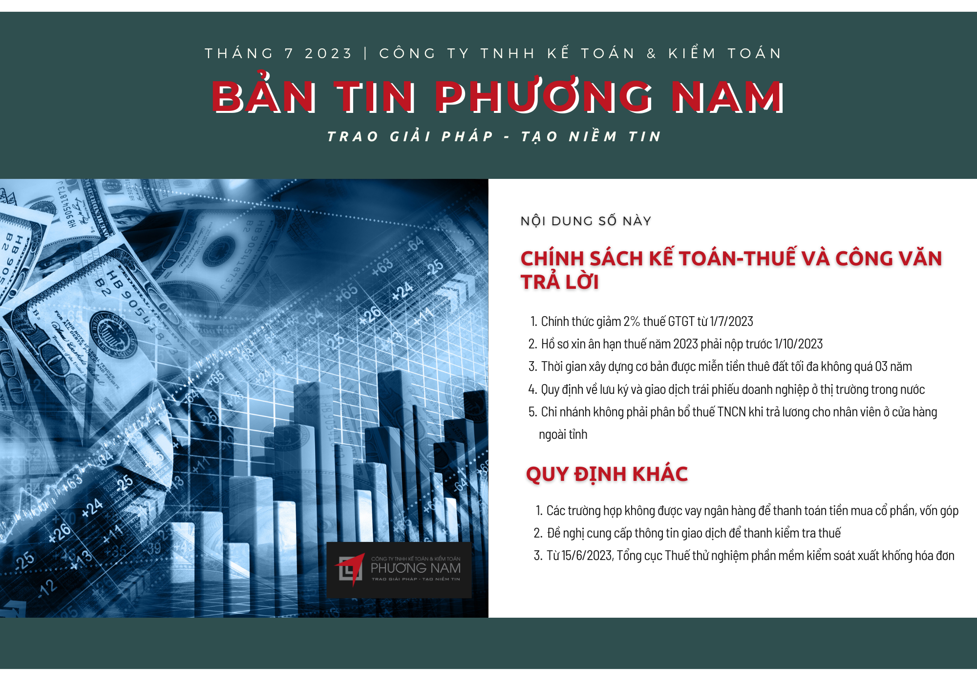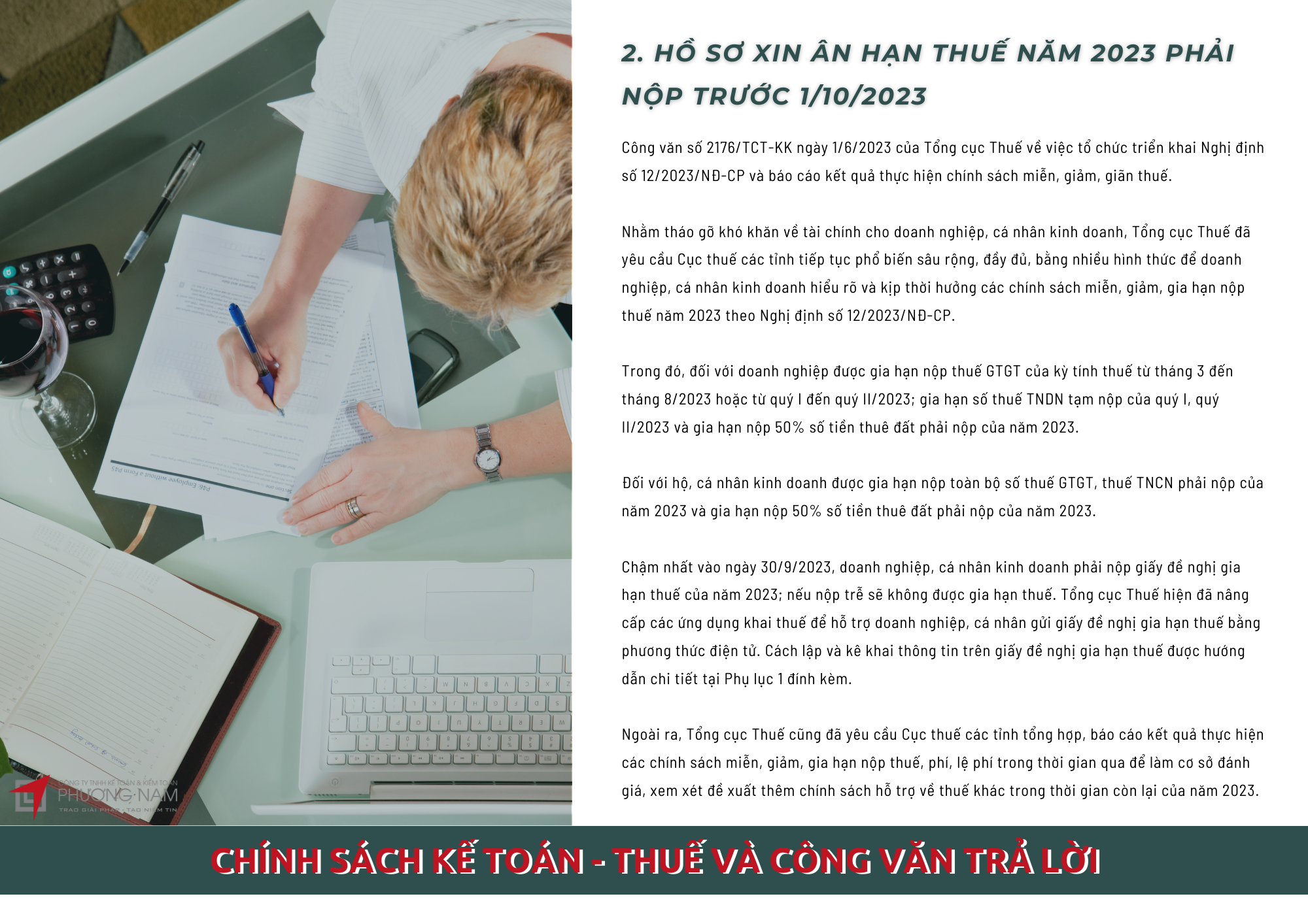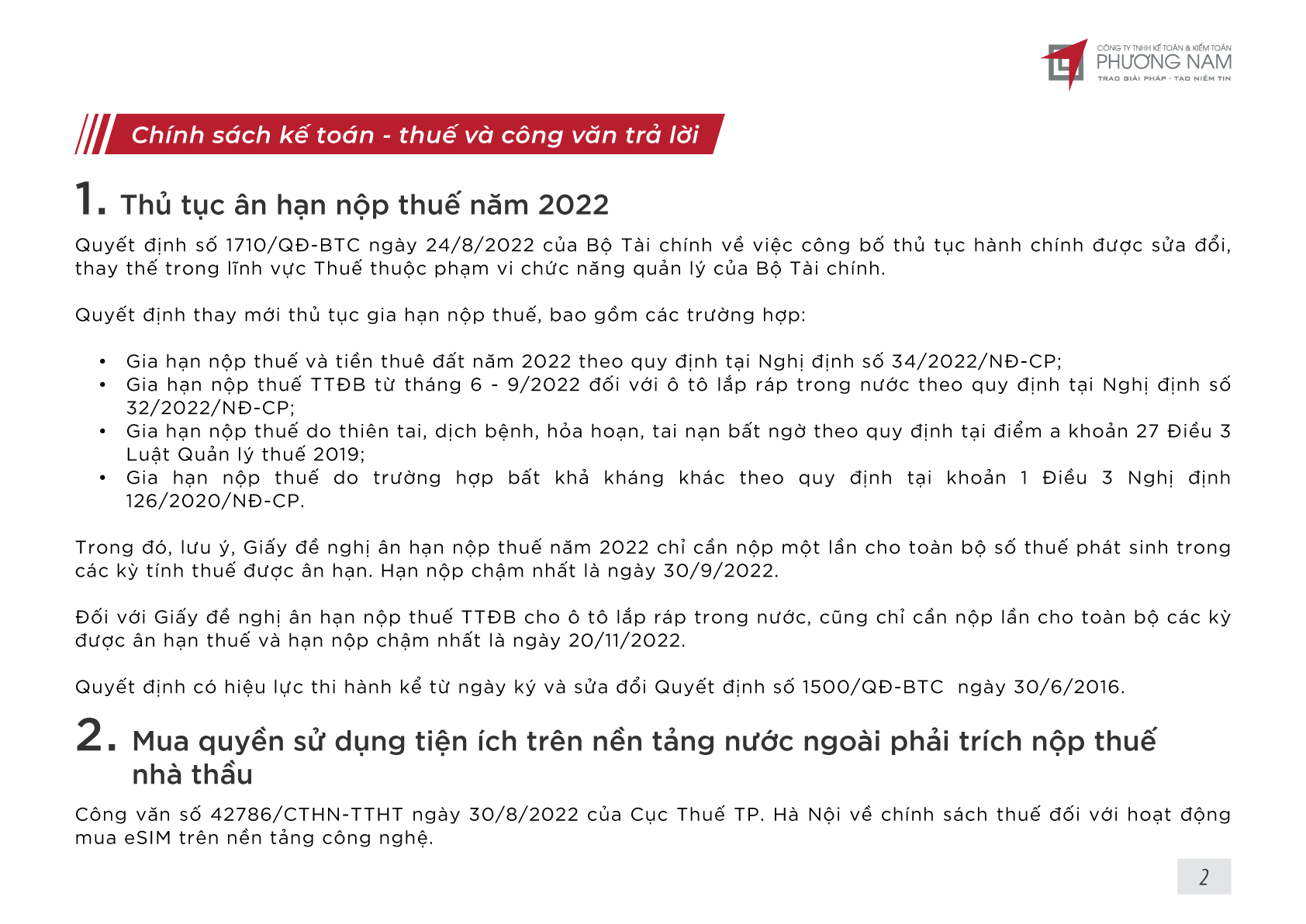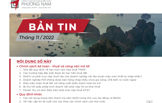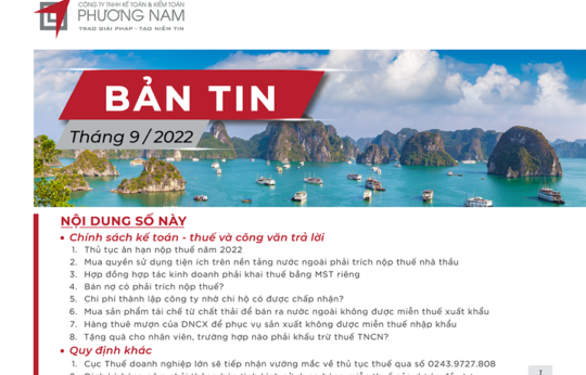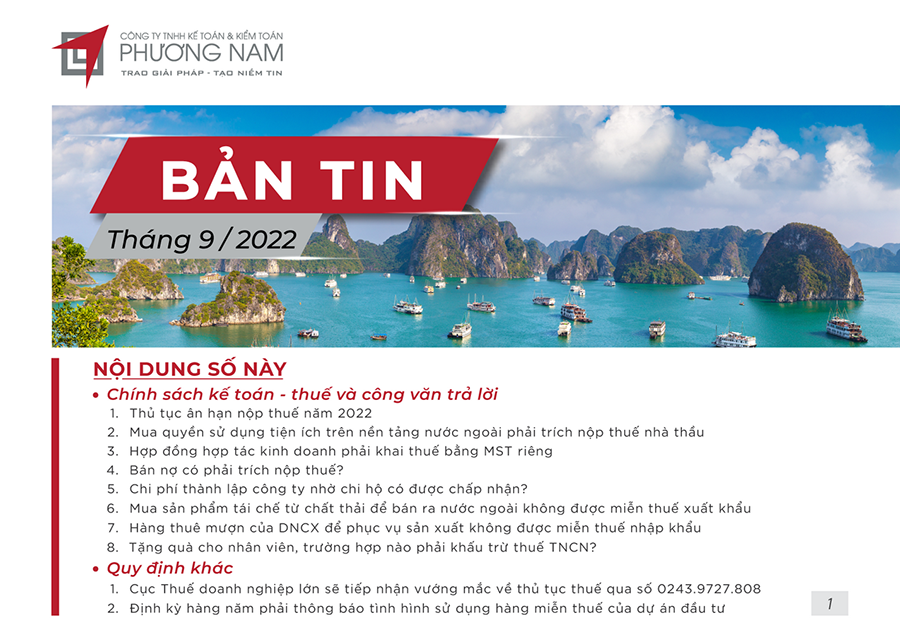 Bản tin Phương Nam tháng 9 cập nhật các tin tức: Thủ tục ân hạn nộp thuế 2022, mua quyền sử dụng tiện ích trên nền tảng nước ngoài phải trích nộp thuế nhà thầu, bán nợ có phải trích nộp thuế?