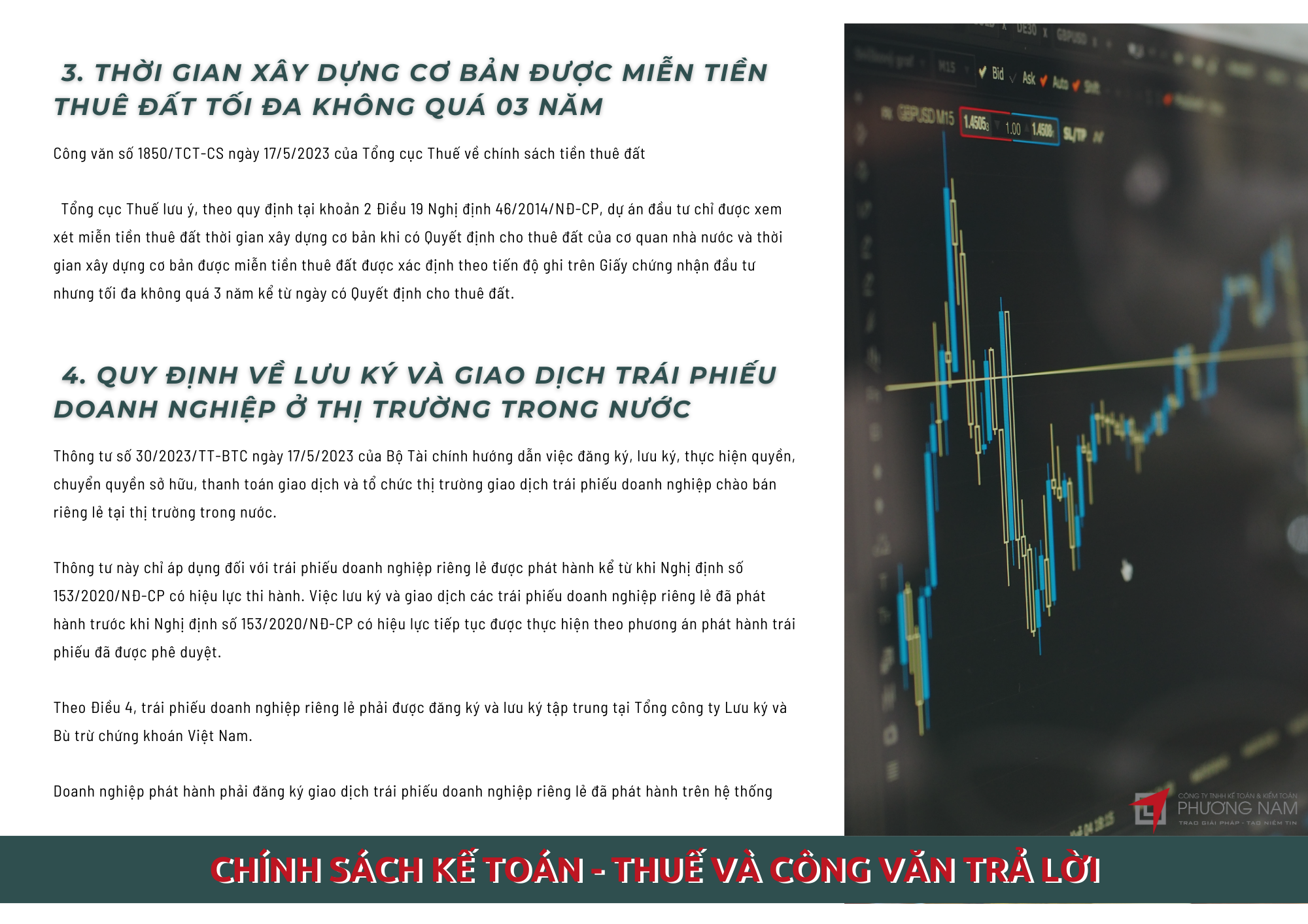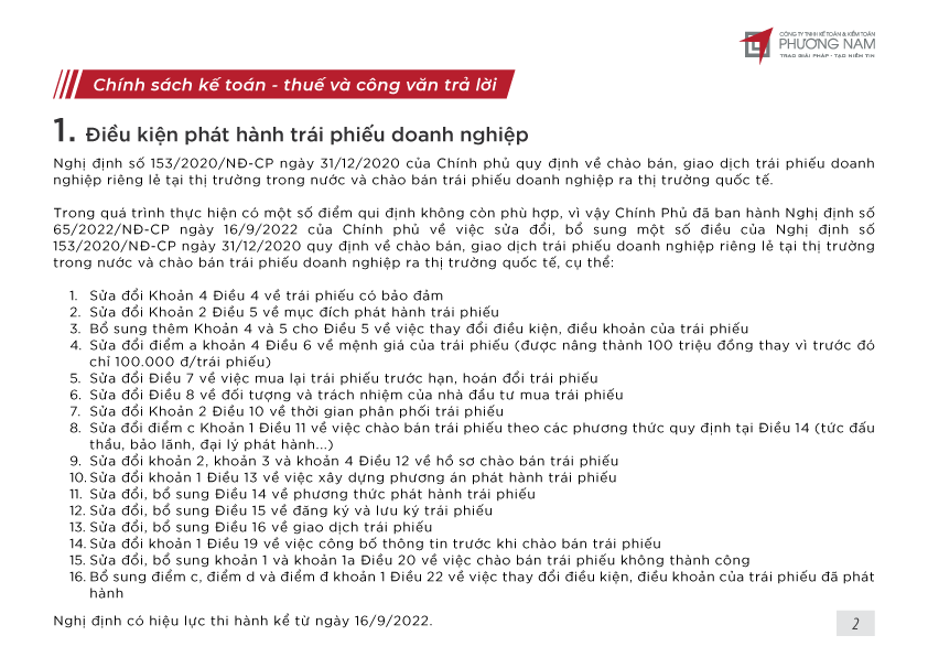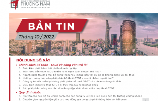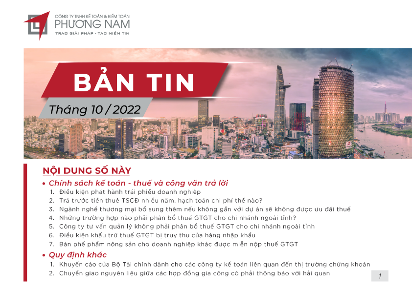 Bản tin tháng 10 cập nhật các tin tức về điều kiện phát hành trái phiếu doanh nghiệp, hạch toán chi phí trả trước tiền thuê TSCĐ nhiều năm, các trường hợp phải phân bổ thuế GTGT cho chi nhánh ngoài tỉnh