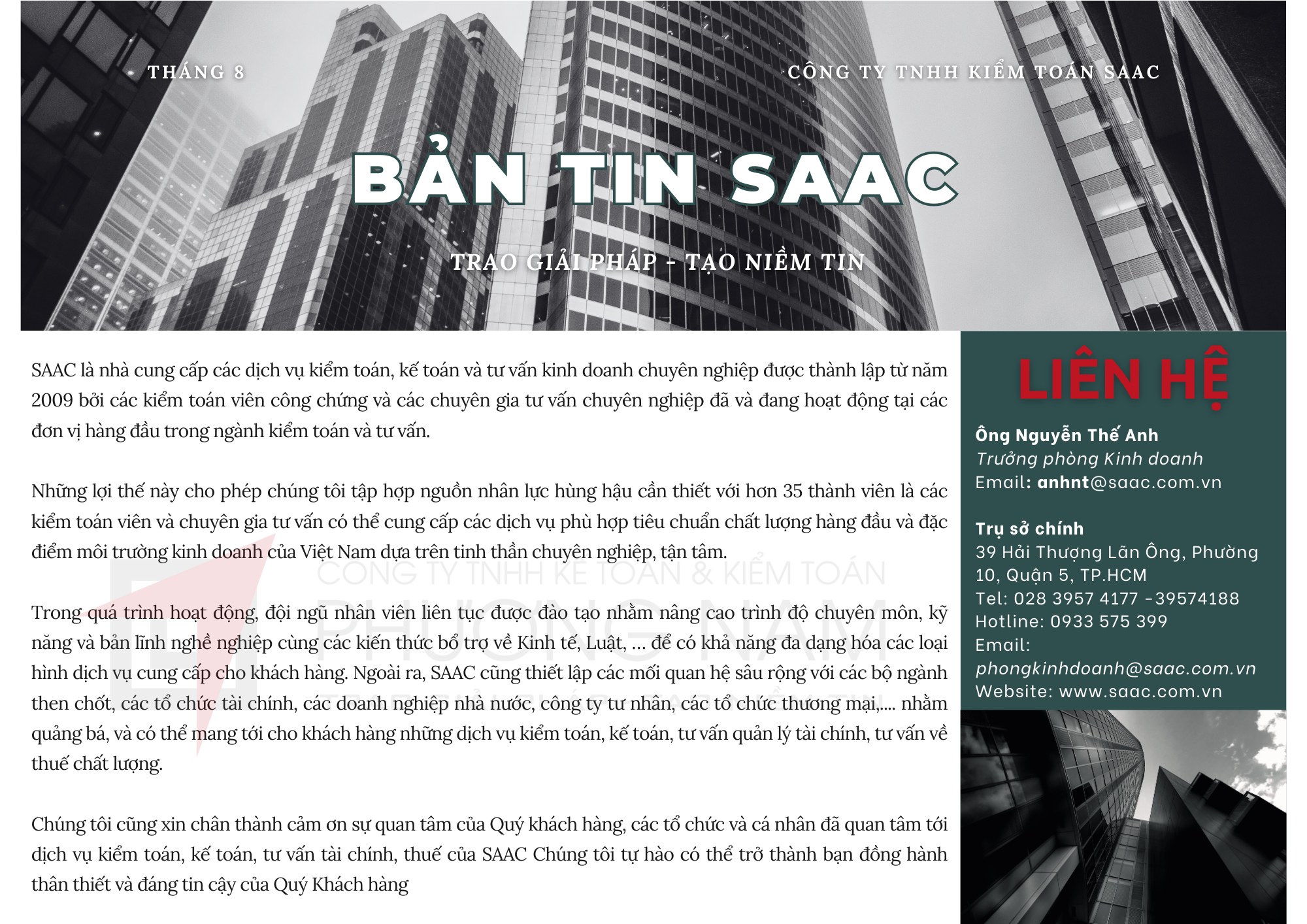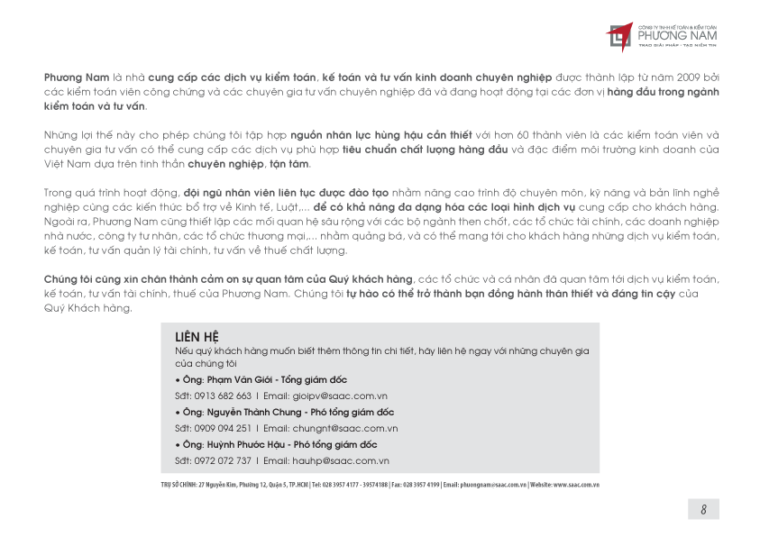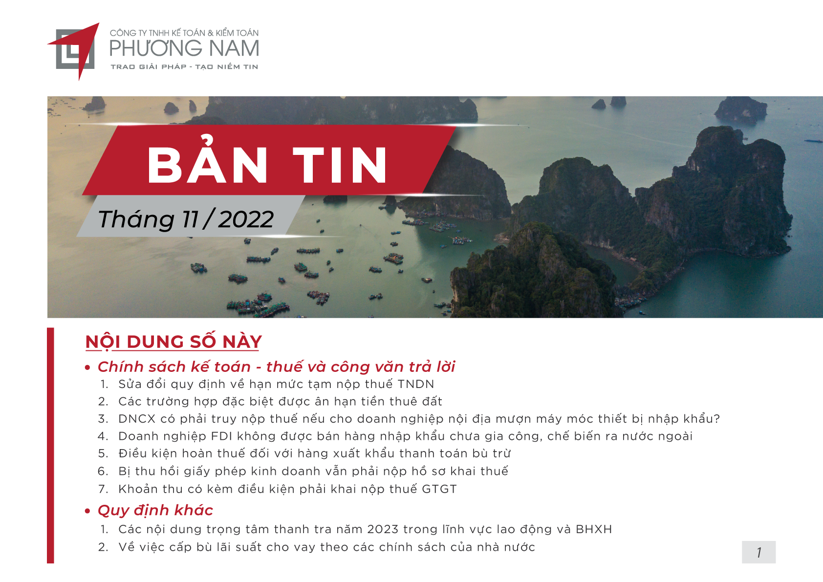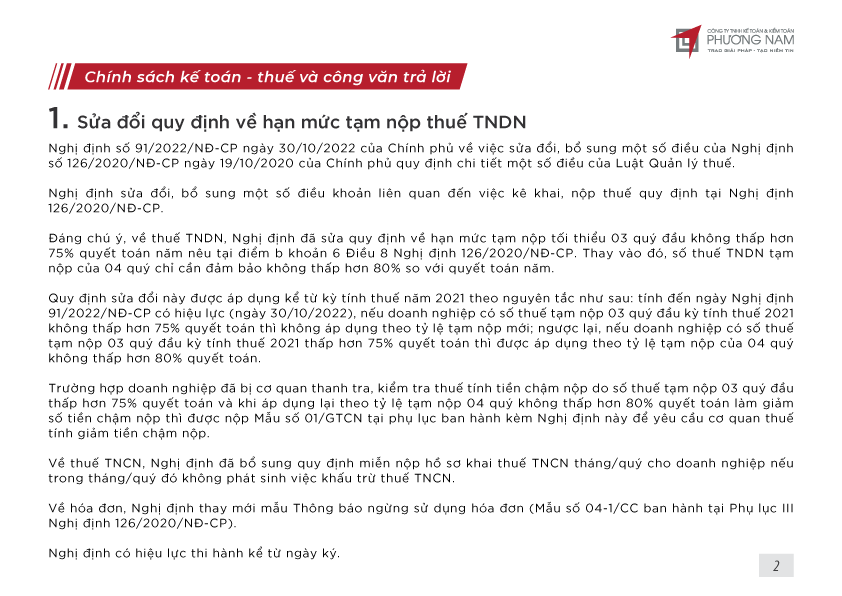 Bản tin Phương Nam tháng này cập nhật các chính sách về việc sửa đổi quy định về hạn mức tạm nộp thuế TNDN, các trường hợp đặc biệt được ân hạn tiền thuê đất, khoản thu có kèm điều kiện phải khai nộp thuế GTGT