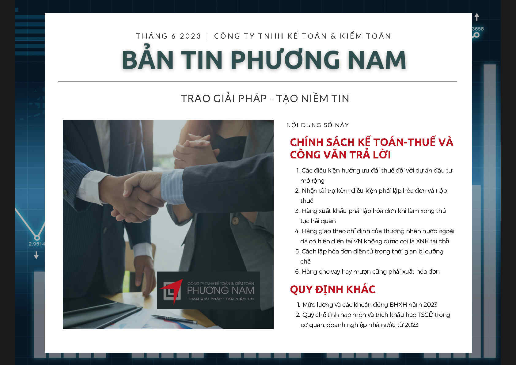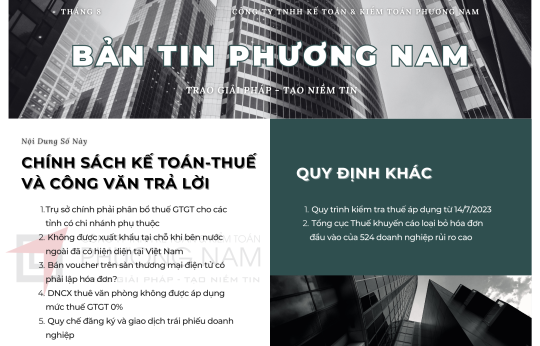 Bản tin Phương Nam tháng này cập nhật các chính sách về điều kiện hưởng ưu đãi thuế đối với dự án đầu tư mở rộng, hàng xuất khẩu phải lập hóa đơn khi làm xong thủ tục hải quan, cách lập hóa đơn điện tử trong thời gian bị cưỡng chế