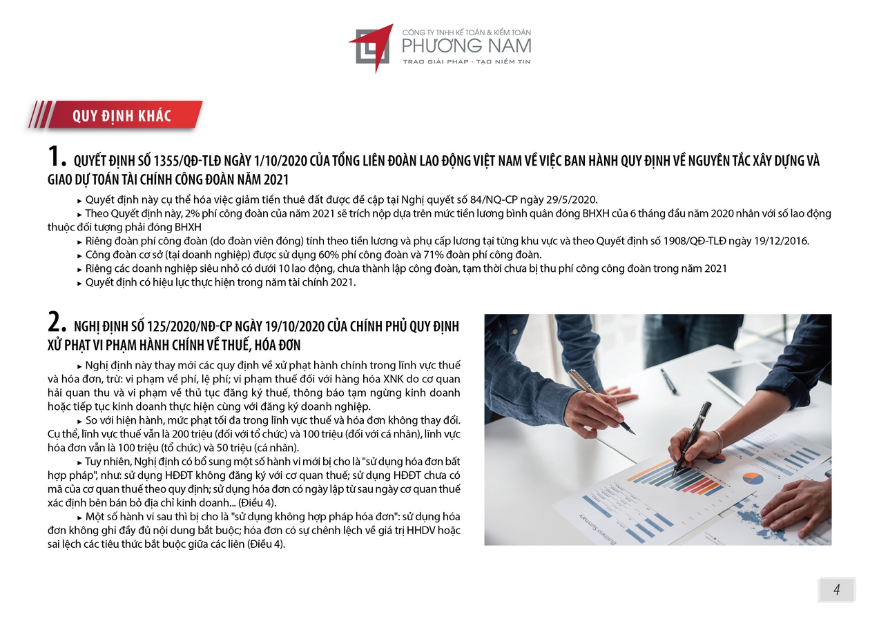 Bản tin Tháng 11 nêu rõ Quy định về nguyên tắc xây dựng và giao dự toán tài chính công đoàn năm 2021, Quy định về xử phạt vi phạm hành chính về thuế và hóa đơn