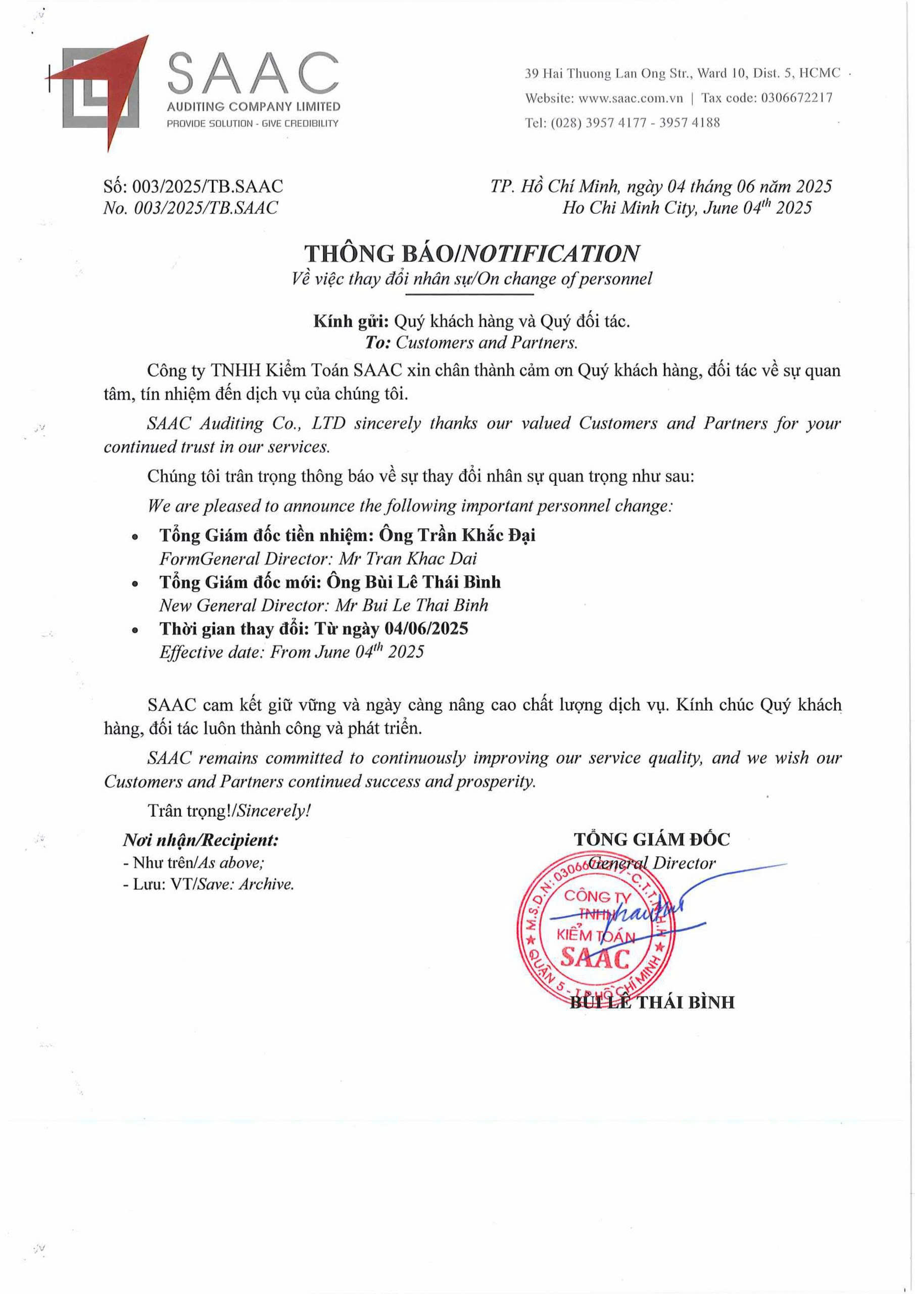 [THÔNG BÁO] Về việc thay đổi Tổng Giám đốc Công ty TNHH Kiểm toán SAAC